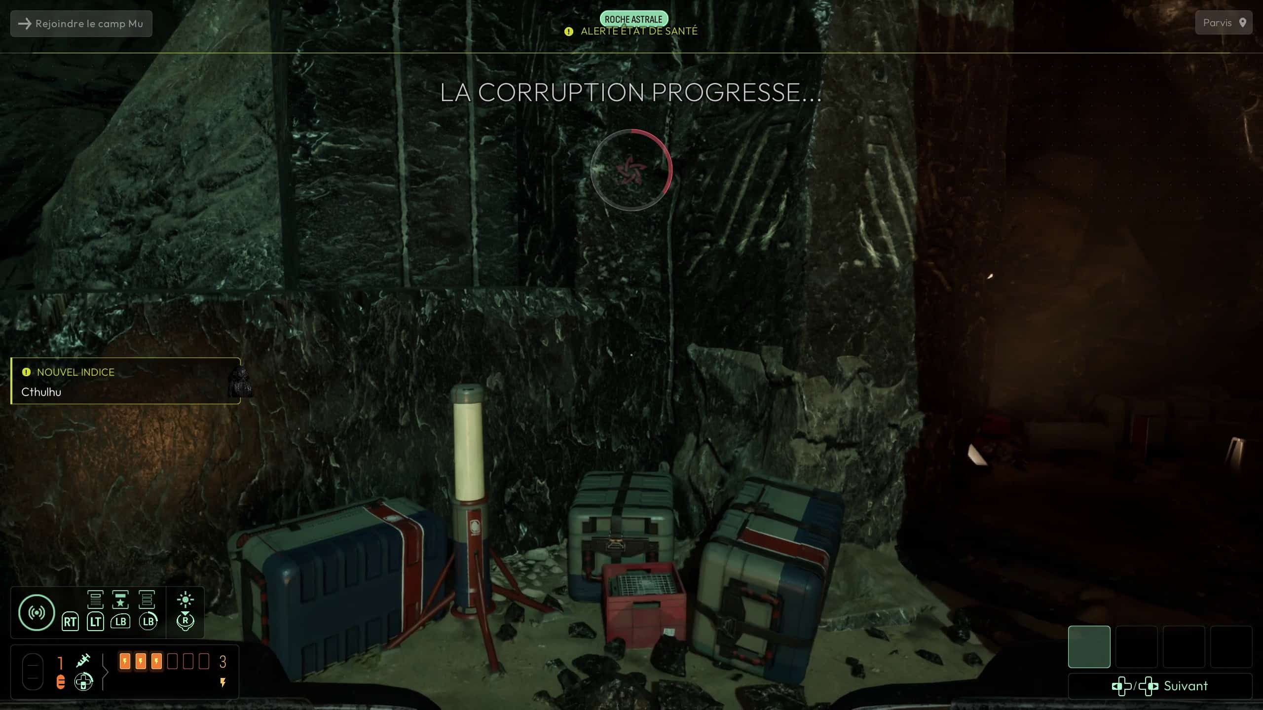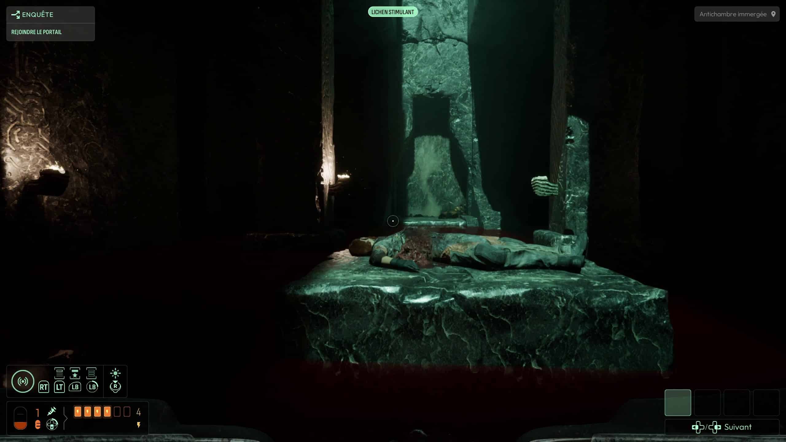 En outre, la jauge de corruption est mal exploitée selon nous. Elle est cohérente lorsque l’on connaît le prix de la connaissance dans les romans de Lovecraft, toutefois, en tant que joueur, la contrainte est bien moins palpable. Plutôt qu’un arbre de compétences traditionnel, le jeu propose des améliorations indirectes (débloquées grâce à des tablettes dénichées dans le décor), souvent liées à votre énergie (requise pour analyser des indices), à votre sonar et à la corruption elle-même.