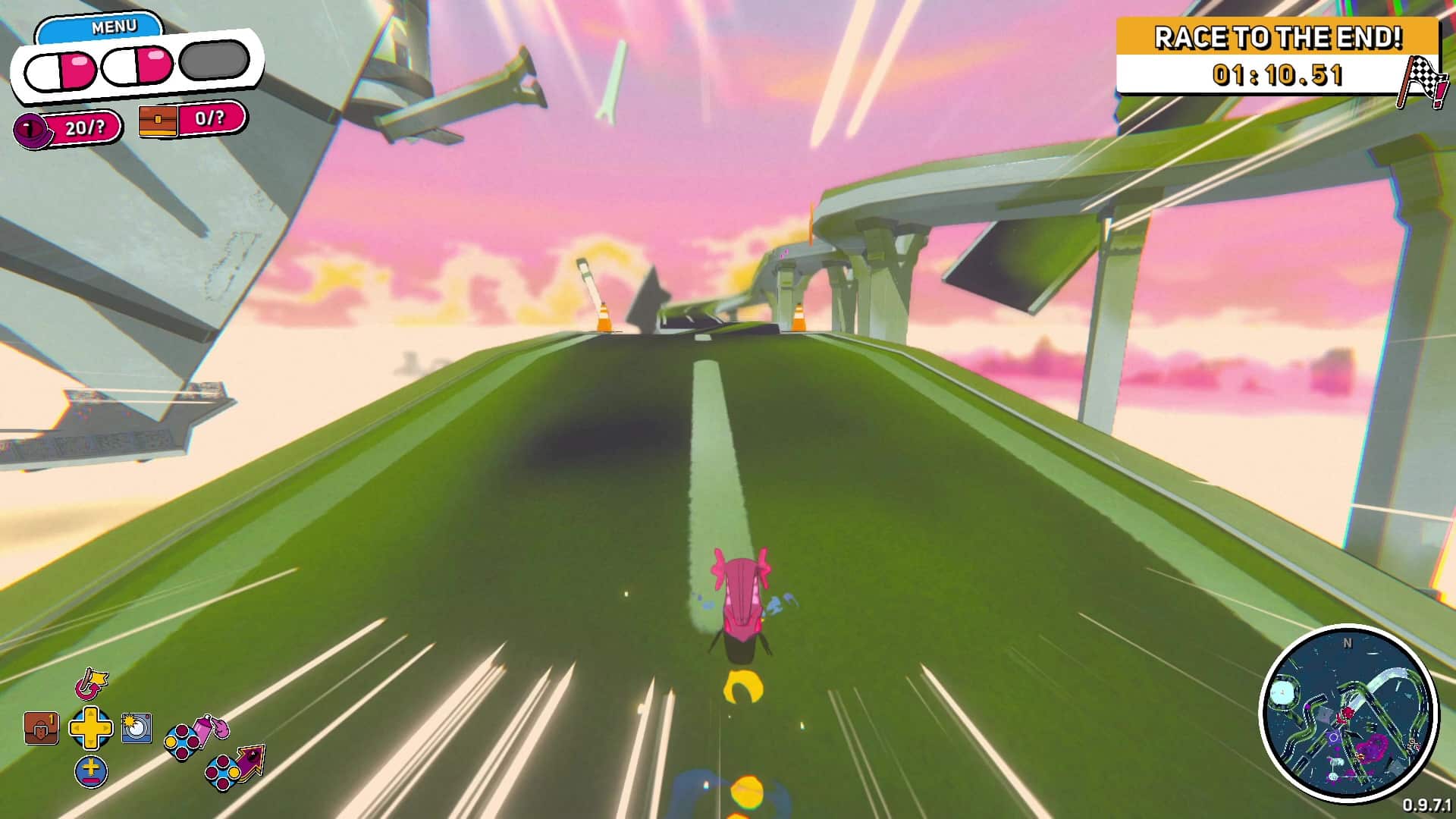 Petite différence made in 2026 cependant, les trajets durent rarement plus de 30 secondes et pourtant on ne peut pas se permettre d’ennuyer le joueur ne serait-ce qu’une seconde. Alors on ajoute des cerceaux à traverser, des mines à éviter qui apparaissent aléatoirement. Honnêtement ça ne sert à rien mais on comprend l’intention.