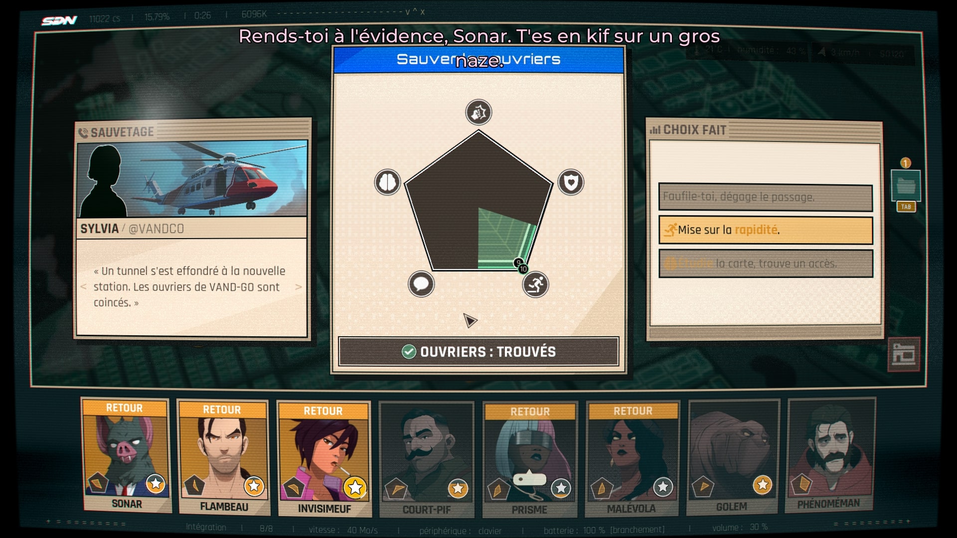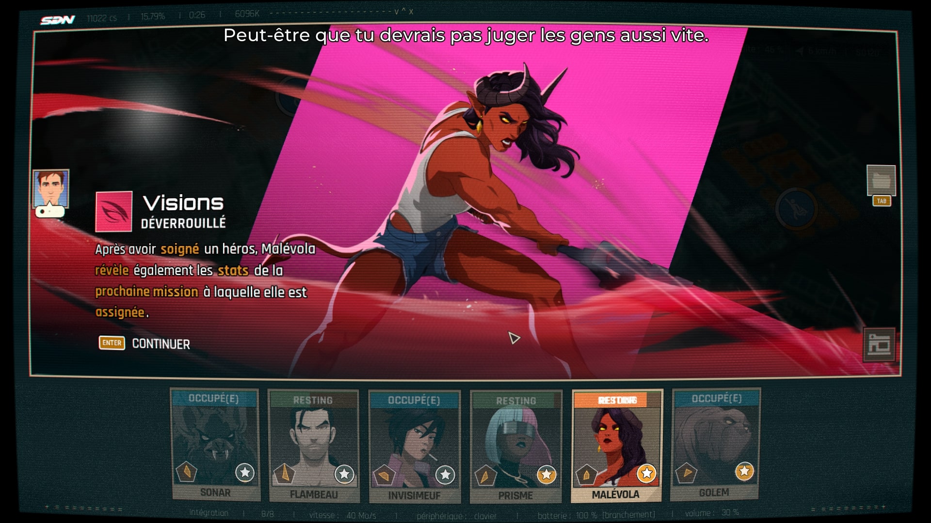 Durant ces séquences, Dispatch prend alors la forme d’un jeu de gestion où vous devrez placer les bons éléments sur les bonnes missions, en faisant attention aux compétences de chacun. Chaque héros dispose de forces et faiblesses essentielles à bien prendre en compte lors des missions, sachant qu’il faudra deviner vous-mêmes de quelles compétences vous aurez besoin en vous fiant uniquement à la description de l’intervention à effectuer. N’allez donc pas envoyer un Golem, particulièrement robuste, mais terriblement bête, dans une mission qui requiert de la jugeote.