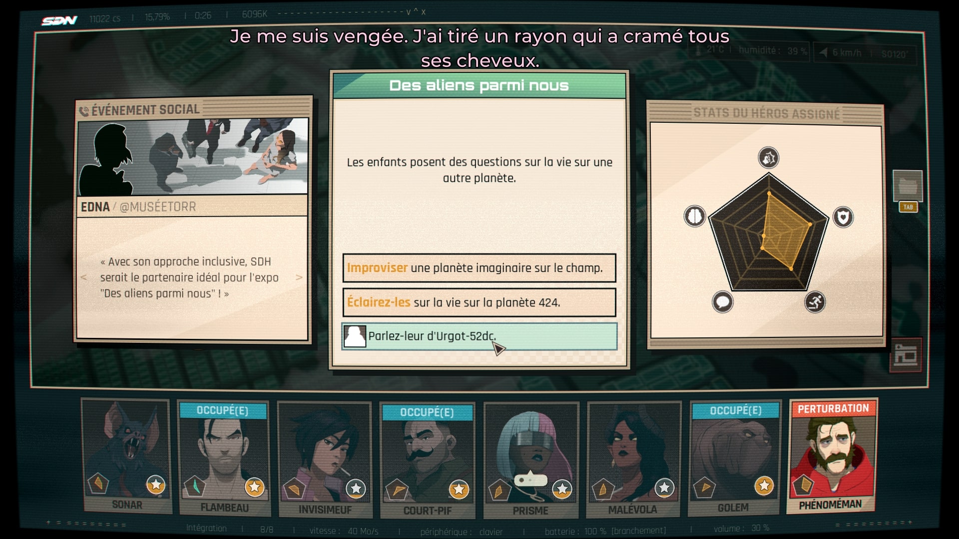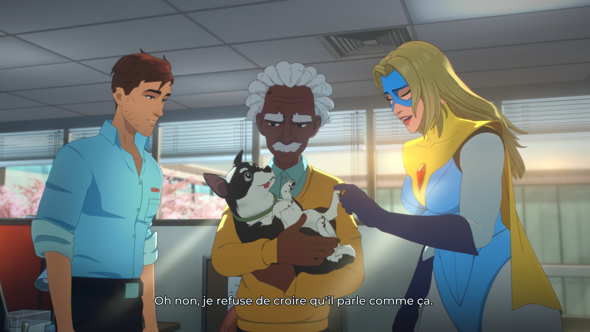 Voilà dans quoi nous embarque Dispatch. Le jeu d’AdHoc Studio amène le genre des super-héros dans un style tourné vers la comédie avant l’action, où la salle de pause avec la machine à café est l’endroit le plus palpitant que Robert verra au cours de sa journée. De quoi donner lieu à des interactions absurdes, avec des répliques qui fusent dans tous les sens, tout en respectant le bon dosage entre humour et drame. Ce qu’il doit à un sens de la répartie incroyable, avec un rythme de dialogue parfaitement calibré, et une écriture particulièrement soignée, rendant chaque dialogue très réaliste malgré le contexte super-héroïque qui englobe le tout. Et d’ailleurs, grand bravo à la traduction française pour avoir adapter cela comme il se doit.