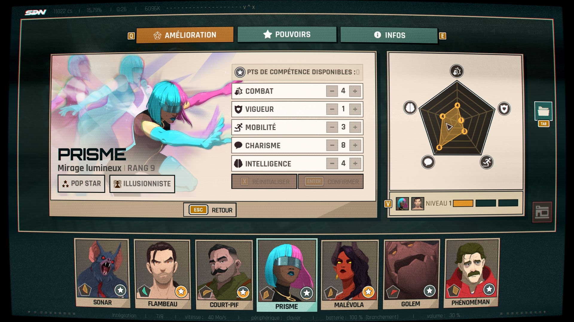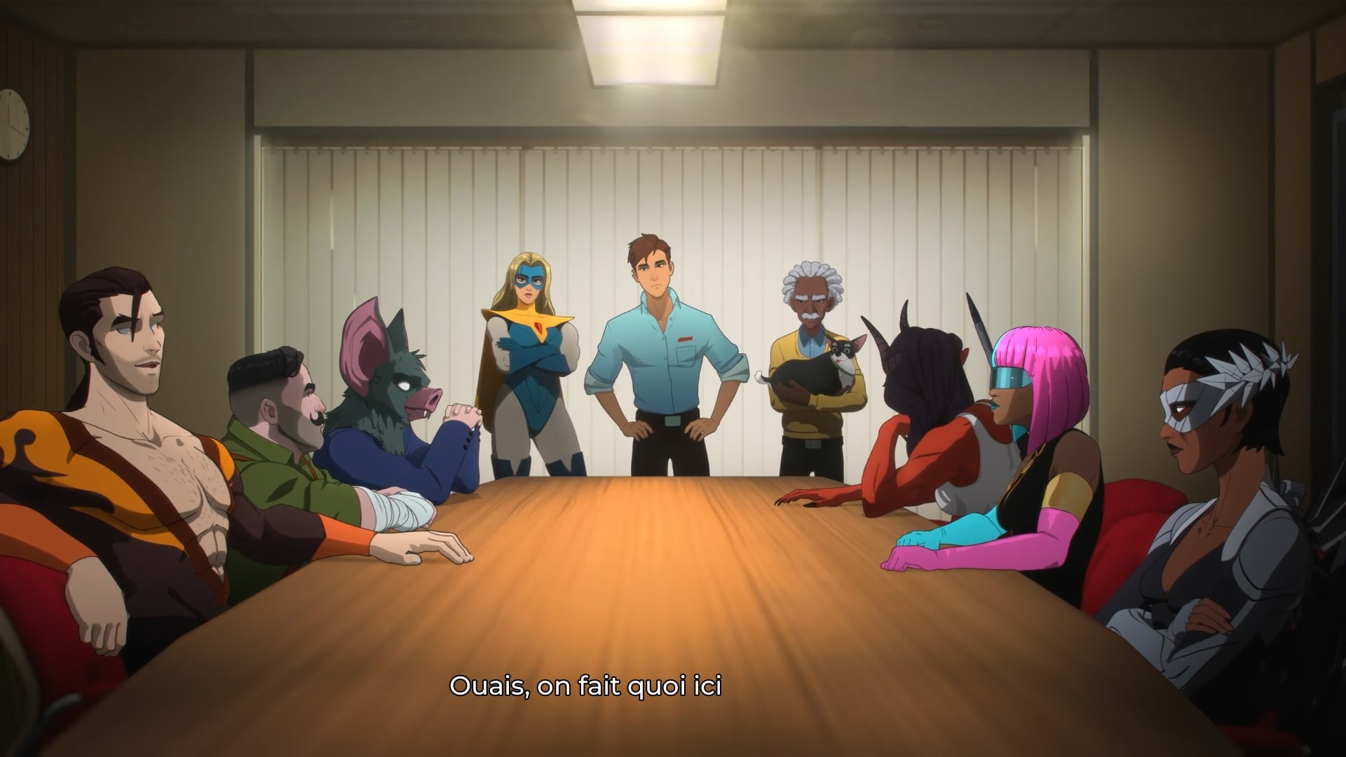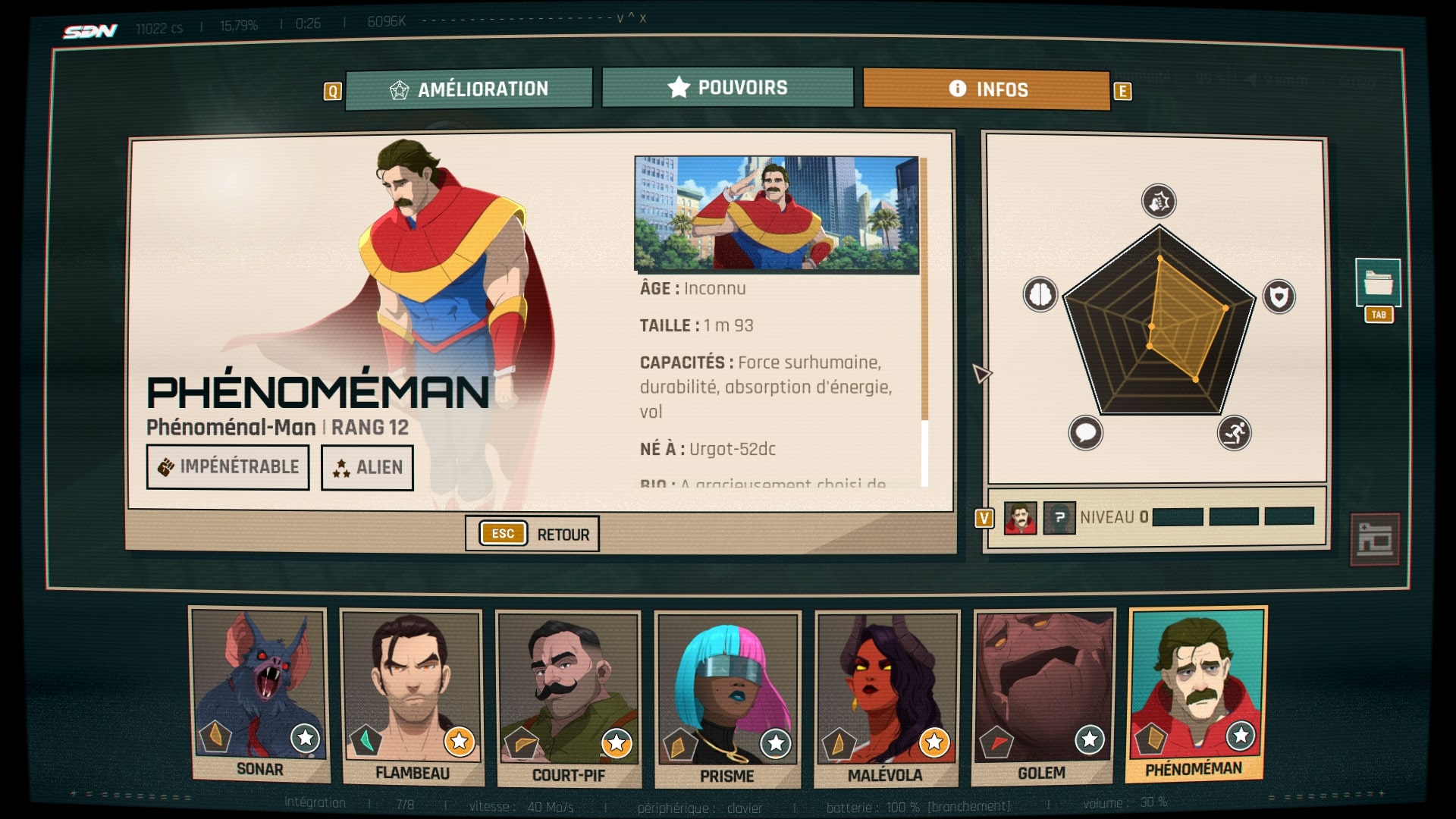 Une expérience plus terre-à-terre qui permet de rendre chaque personnage immédiatement attachant, même si certains d’eux auraient gagné à avoir plus de temps d’antenne tant ils crèvent l’écran. Comment en pas tomber sous le charme de Sonar, mi-homme mi-chauve-souris adorable malgré son penchant pour la cocaïne ; ou Phénoméman, Superman/Thor dépressif en décalage complet avec ses collègues humains ; sans oublier Court-Pif et sa manie de taper dans n’importe quelle bourse qui croise son chemin. Car oui, Dispatch fait souvent en dessous de la ceinture, en n’hésitant jamais à être parfaitement grossier, sans pour autant être lourd comme un Borderlands.