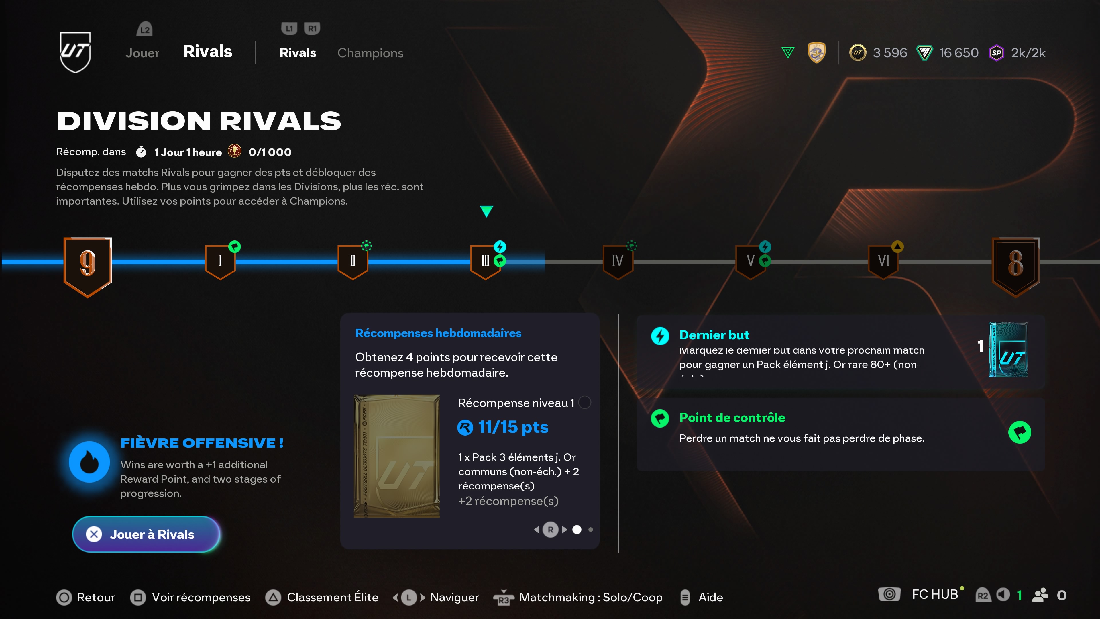 Vient le mode Ultimate Teams, qui a décidé de se refaire une beauté. Il y a d’abord le mode Rivals qui a subi un lifting intéressant. Toujours basé sur un système de divisions, ledit mode va maintenant un peu moins pénaliser les joueurs, les empêchant de rester bloqués un peu trop longtemps sur une division. Pour ce faire, le titre se dote à chaque division de systèmes de checkpoints, donnant des chances aux joueurs de progresser sereinement dans la division en cours même s’il y a plusieurs défaites au compteur. Le joueur pourra quand même gagner quelques crédits ou points FC en récompense, qu’il y ait victoire ou défaite à la clé. Le mode est ainsi plus accessible, avec pas mal d’objectifs annexes pour gagner des récompenses, et n’en reste pas moins beaucoup plus grisant à jouer que sur EA Sports FC 25.
