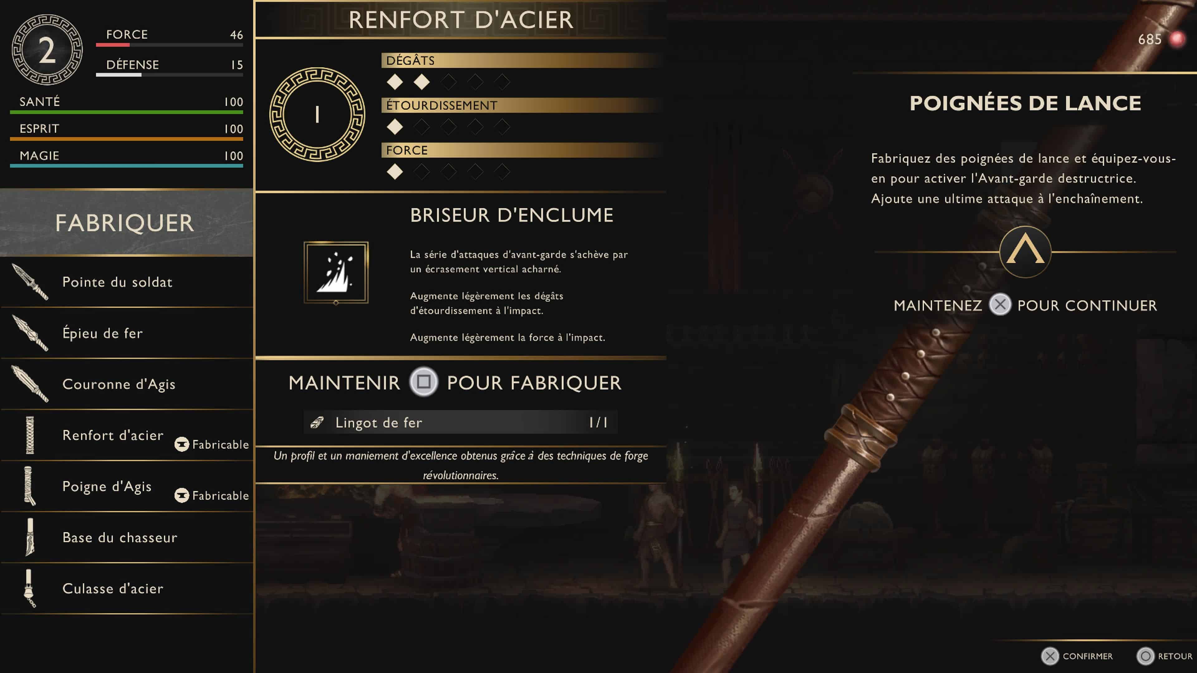Par ce biais, vous aurez ainsi l’autorisation – via des ressources récoltées dans des caisses ou des coffres spécifiques – de donner un coup de boost aux divers éléments de votre lance. Les améliorer vous boostera vos statistiques de force et par conséquent, votre niveau de puissance. Idem pour la défense, où en boostant votre bouclier à l’aide d’orbe de sang et de ressources, vous pourrez logiquement l’augmenter. Au début plutôt sympathique, ce système votre vite ses limites avec une montée en puissance qui se montre timidement. Pour ne rien arranger, l’absence de statistique sur chacun des éléments de la lance ou du bouclier que l’on récupère, doivent obligatoirement être du même niveau, afin de monter la jauge de niveau de puissance.