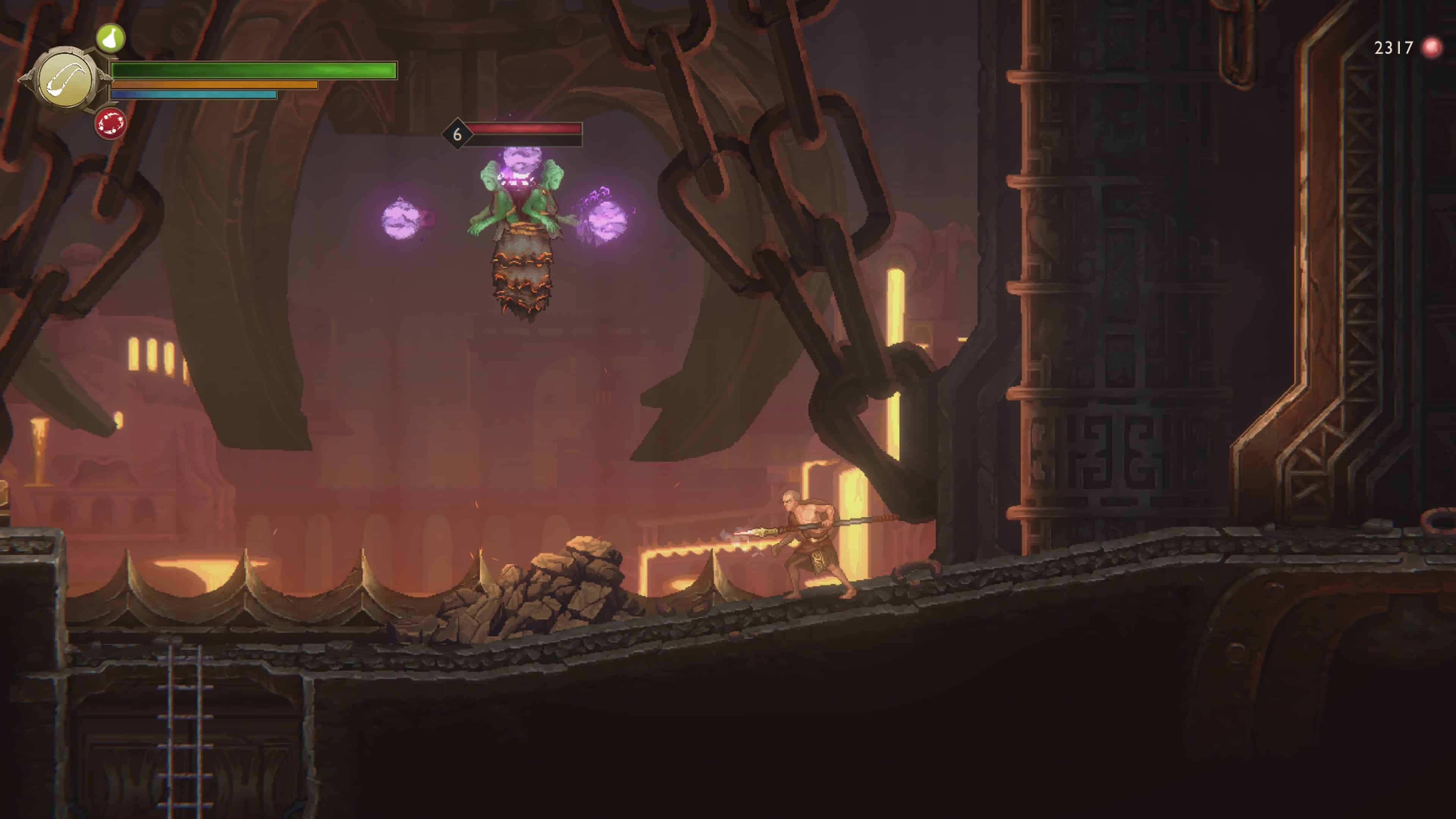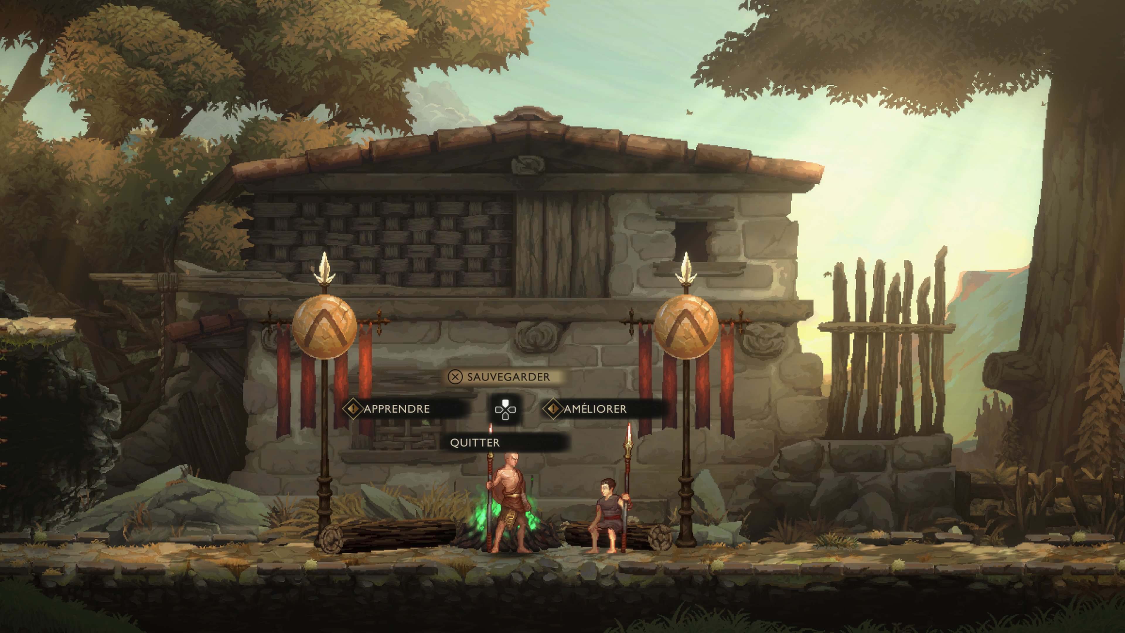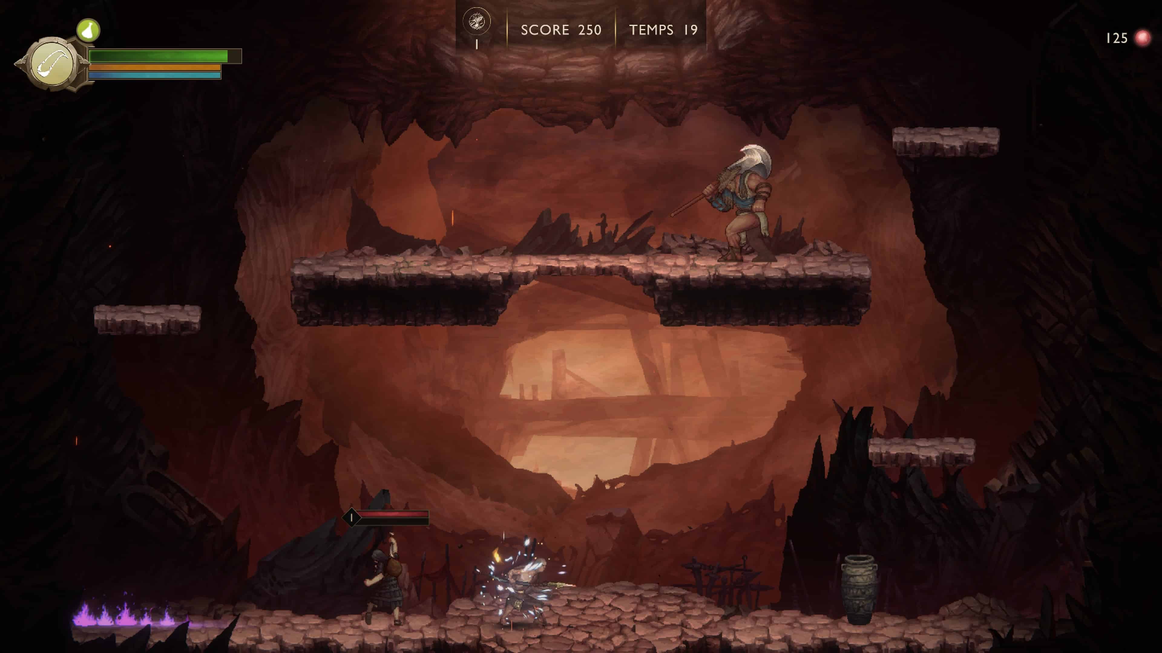 Concrètement, l’expérience de jeu est plus simpliste, et pas forcément super excitante sur le modèle metroidvania, en général plus digeste. D’ailleurs, la production se dote d’un système de progression à base de niveau de puissance, comme les deux volets nordiques. Par le biais de ressources que vous pouvez trouver ça et là, vous pouvez via des feux de camps, sauvegarder pour reprendre la santé, améliorer vos compétences au moyen d’orbe de sang, et enfin upgrader votre arme, bouclier ou gouris à porter sur des emplacements de ceintures (apportant des bonus passifs comme plus d’orbes, des stats de force en plus etc.).