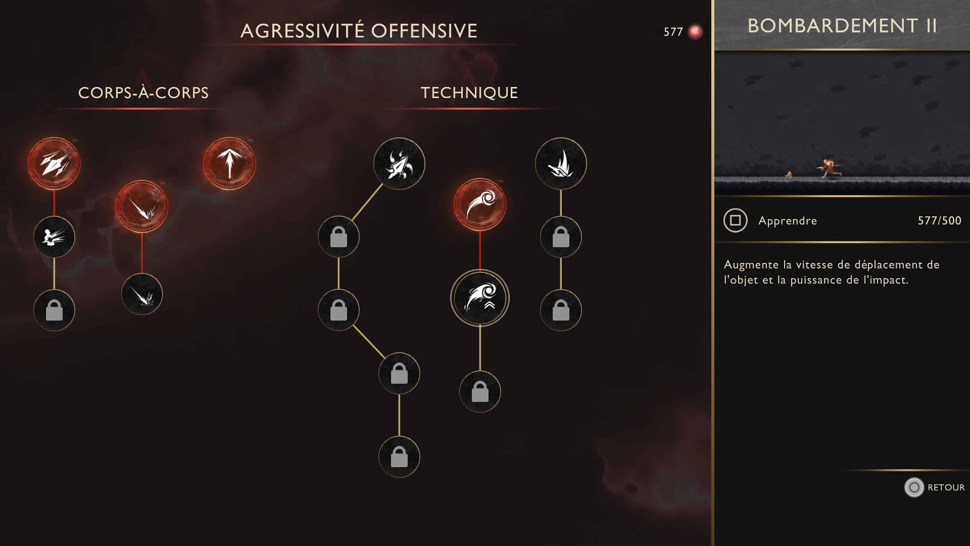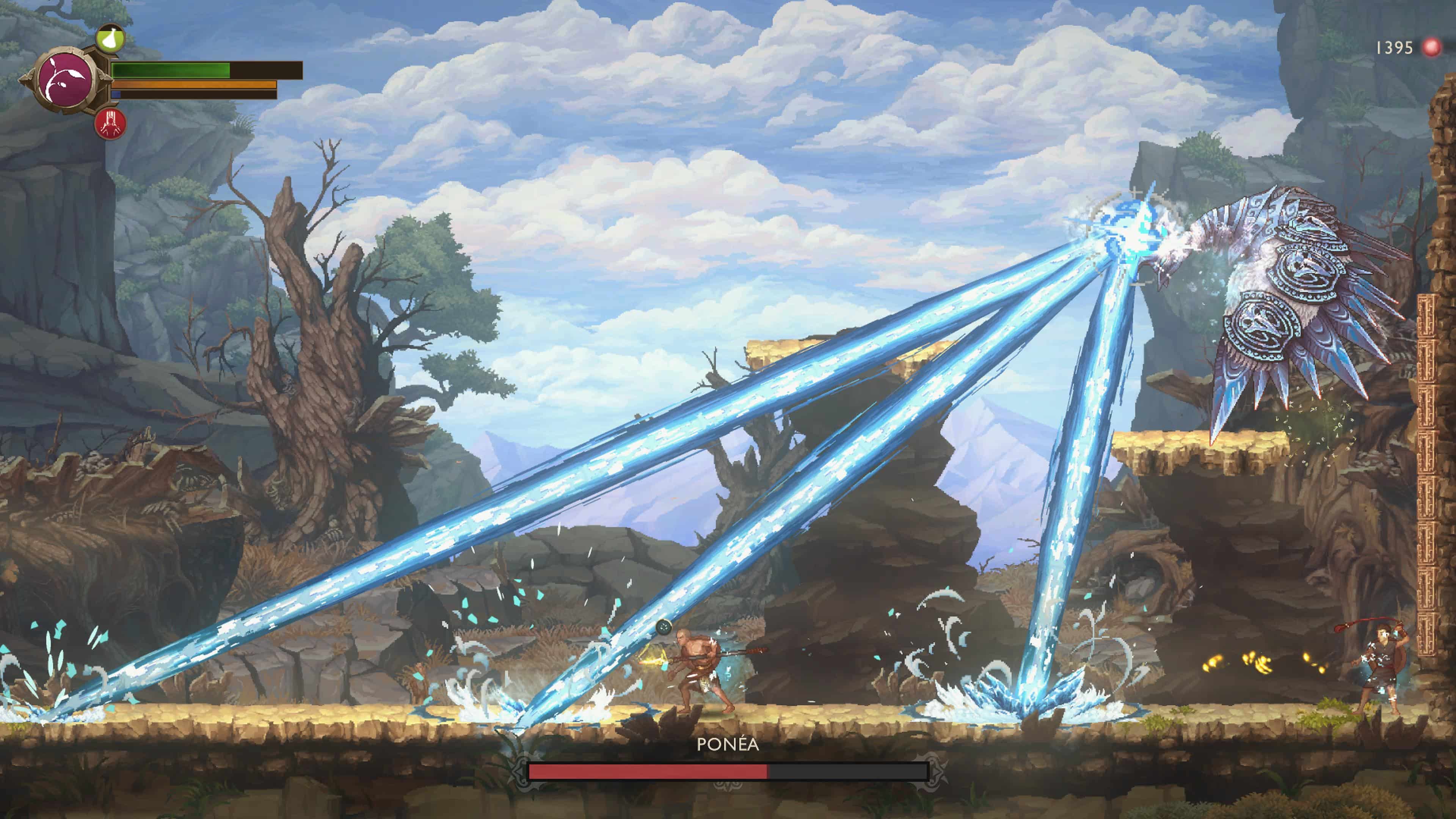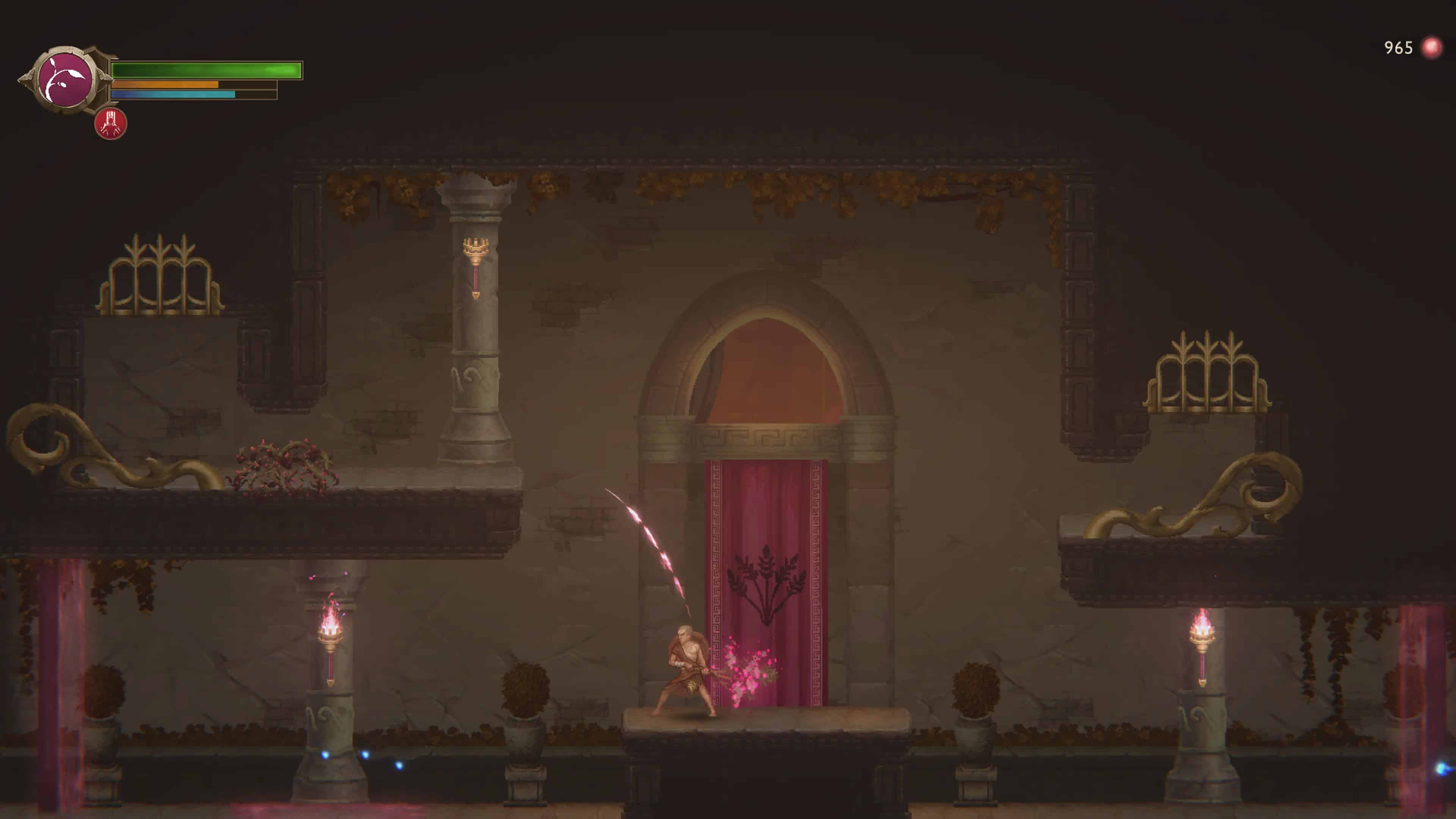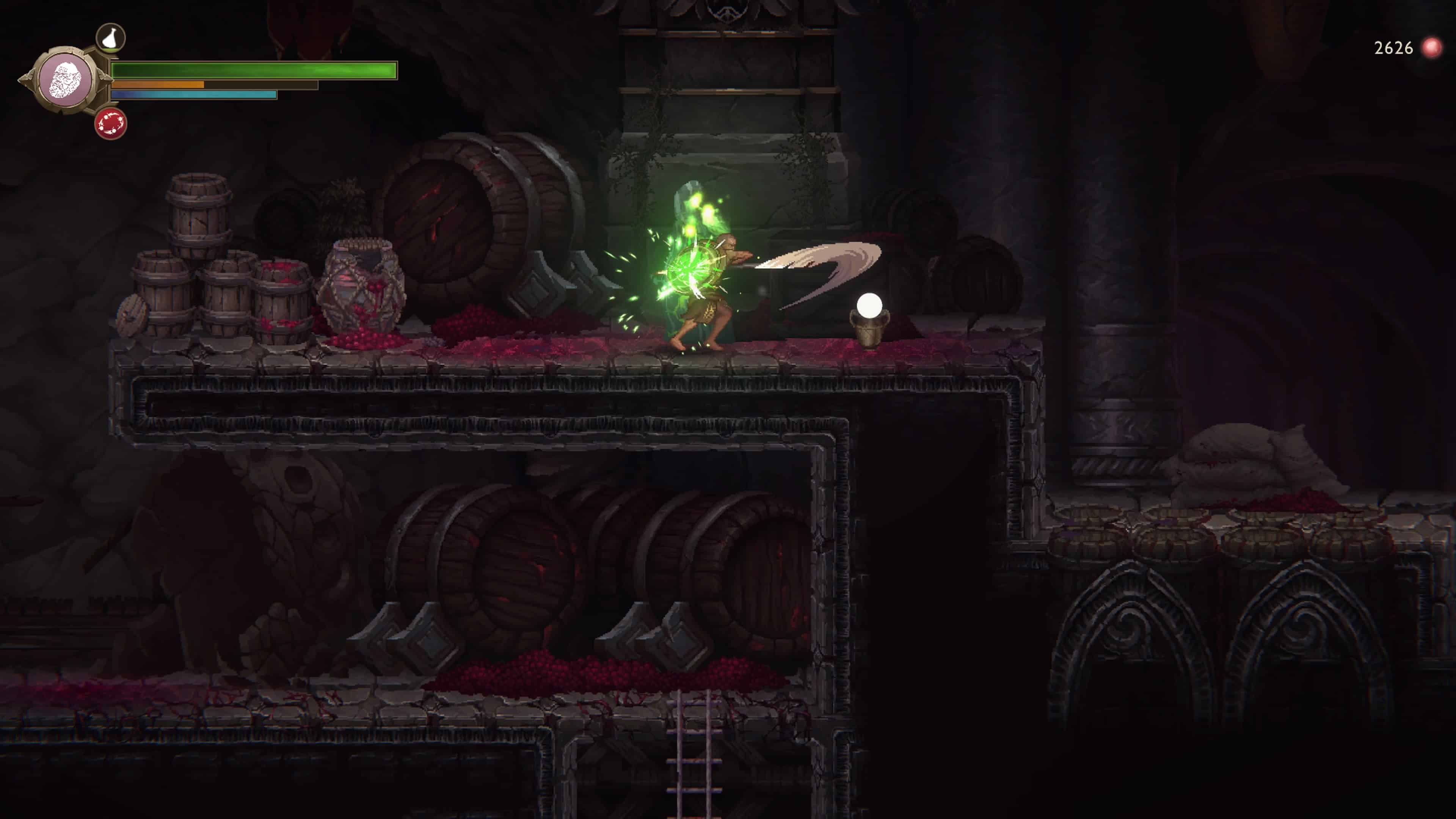 Concrètement, l’expérience de jeu est plus simpliste, et pas forcément super excitante sur le modèle metroidvania, en général plus digeste. D’ailleurs, la production se dote d’un système de progression à base de niveau de puissance, comme les deux volets nordiques. Par le biais de ressources que vous pouvez trouver ça et là, vous pouvez via des feux de camps, sauvegarder pour reprendre la santé, améliorer vos compétences au moyen d’orbe de sang, et enfin upgrader votre arme, bouclier ou gouris à porter sur des emplacements de ceintures (apportant des bonus passifs comme plus d’orbes, des stats de force en plus etc.).