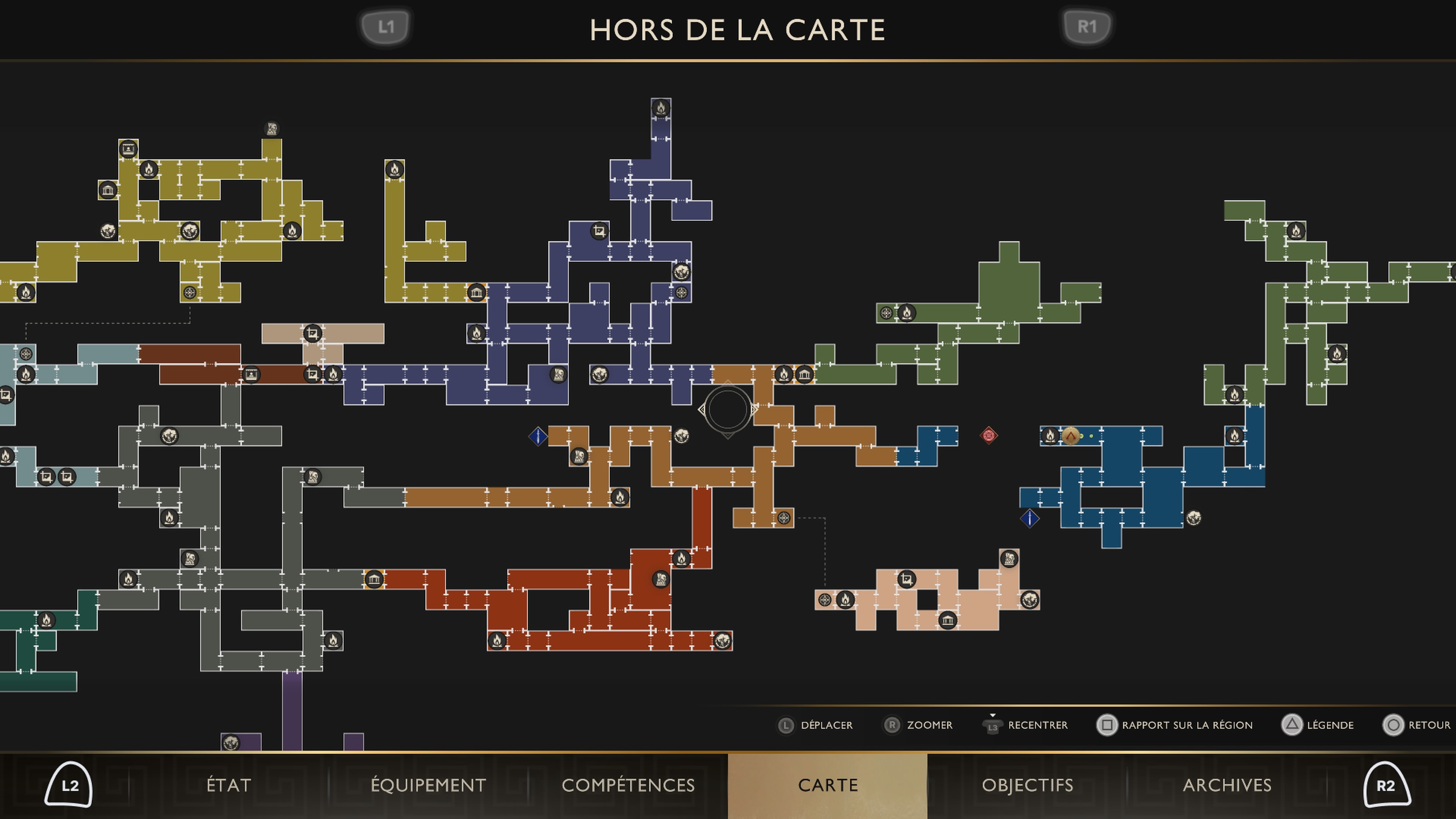 Sans surprise et il fallait s’y attendre, God of War : Sons of Sparta adopte la formule d’un bête metroidvania. A savoir que vous parcourrez une très grande carte peuplée de biomes différents. Vous serez plus ou moins libre sur où aller, et vous devrez accomplir dans un premier temps les objectifs de la quête principale afin d’avoir la possibilité d’avancer plus loin. Vous pouvez être au choix via les options guidées sur la prochaine mission qui apparait sur la map, ou bien tout simplement la jouer difficile, comme la plupart des metroidvania où vous avez parfois peu d’indications sur où aller et quoi faire. Cela est louable et permet de contenter tout le monde. Notez également que le système de jeu est littéralement repris (encore…), des deux excellents God of War de 2018 et 2022.