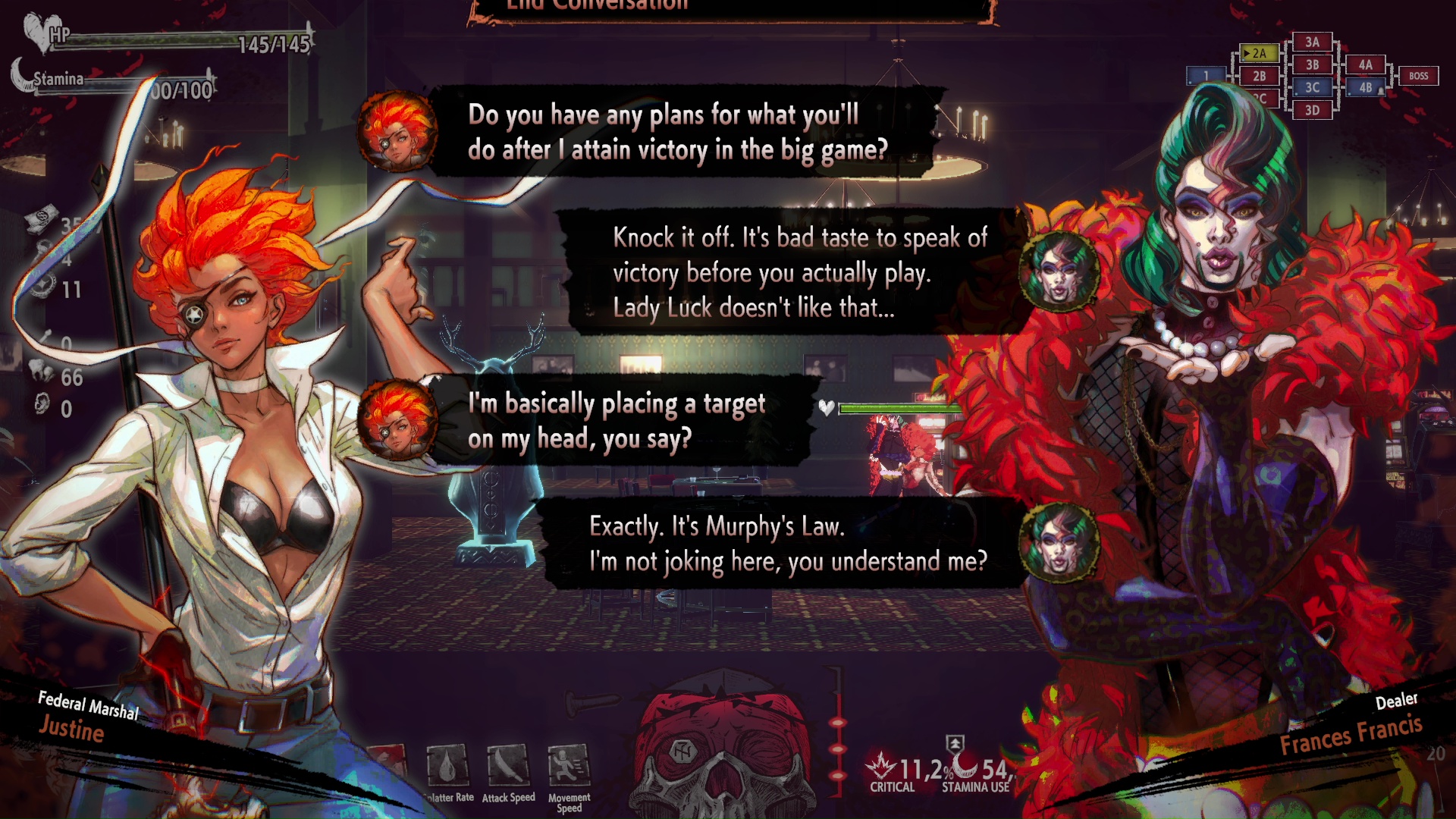 Au niveau du scénario, Hotel Barcelona dénonce un grand nombre de sujets, sûrement un peu trop. On ne sait pas toujours quel est le vrai point de vue du jeu, tellement les différents personnages sont diamétralement opposés. Le tout est raconté par le biais d’une histoire de vengeance saupoudrée de pouvoirs mystiques, complétée par des dialogues un peu ringards. Justine, l’héroïne, est une marshal des États-Unis. Elle est possédée par un tueur en série immortel et va utiliser son pouvoir pour se venger de la Sorcière, une autre tueuse en série, en abattant sur sa route de nombreux criminels de la même trempe. Vous l’aurez compris, Hotel Barcelona ne brille pas par sa narration.