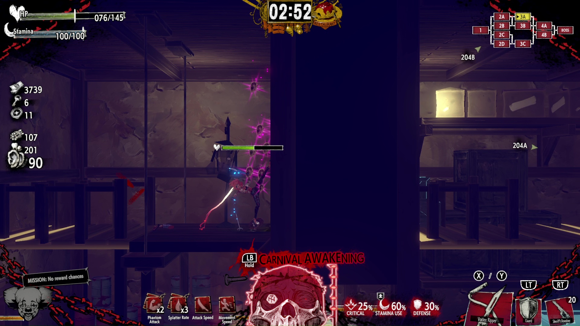 En revanche, le jeu est découpé en niveaux, ce qui l’éloigne de cette base du roguelike et semble nuire à la fluidité et à la relance naturelle des parties. Mais ce n’est pas vraiment le cas, bien au contraire, du moins à partir d’un certain moment. À la fin d’un niveau, on vous propose de lancer le niveau suivant en gardant toutes vos upgrades (ou de relancer le premier niveau quand vous atteignez le dernier). Cela est impossible au début, mais ensuite vous pourrez enchaîner les niveau et découper tous ces tueurs. Le sentiment de puissance est réellement présent.