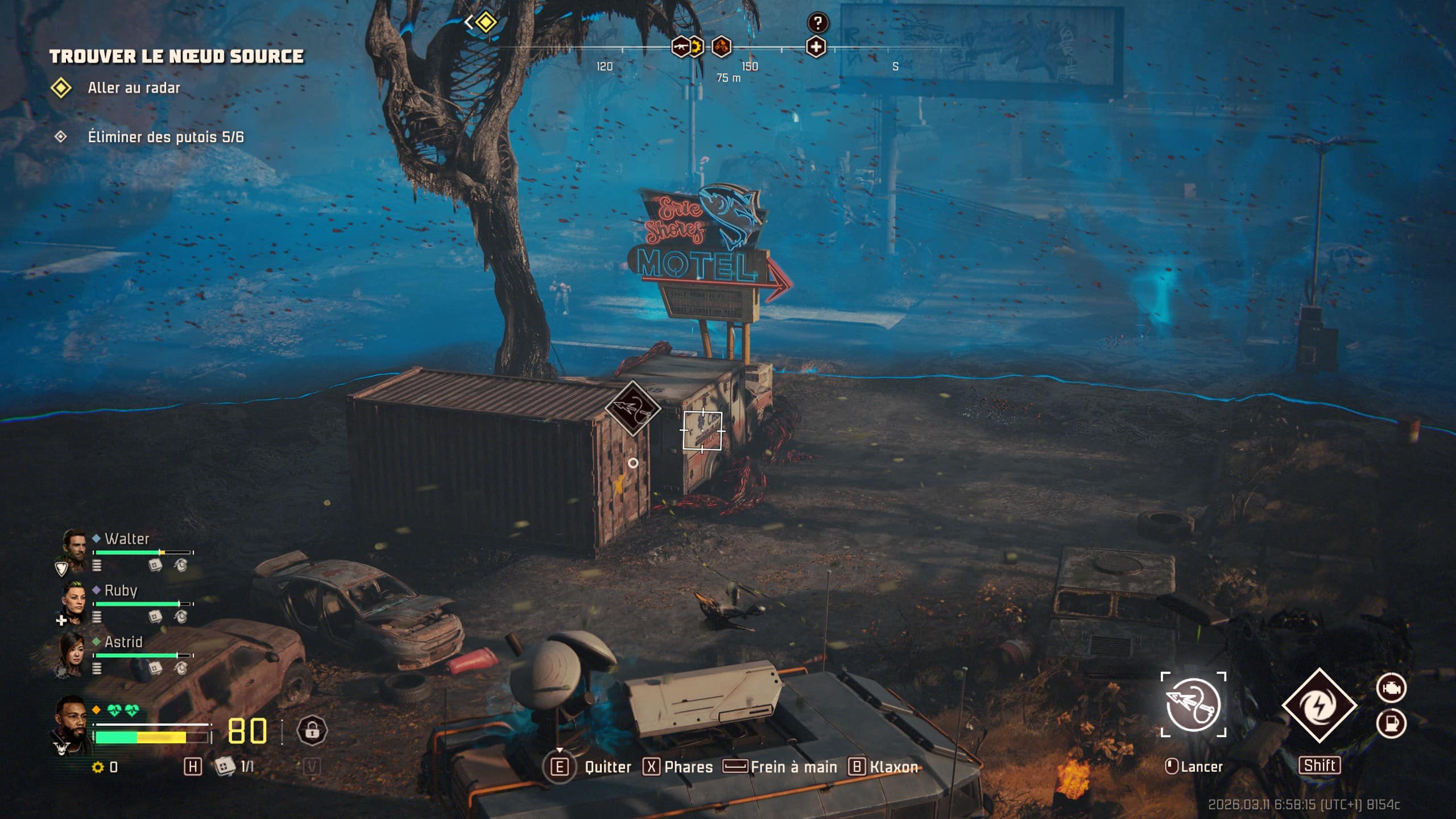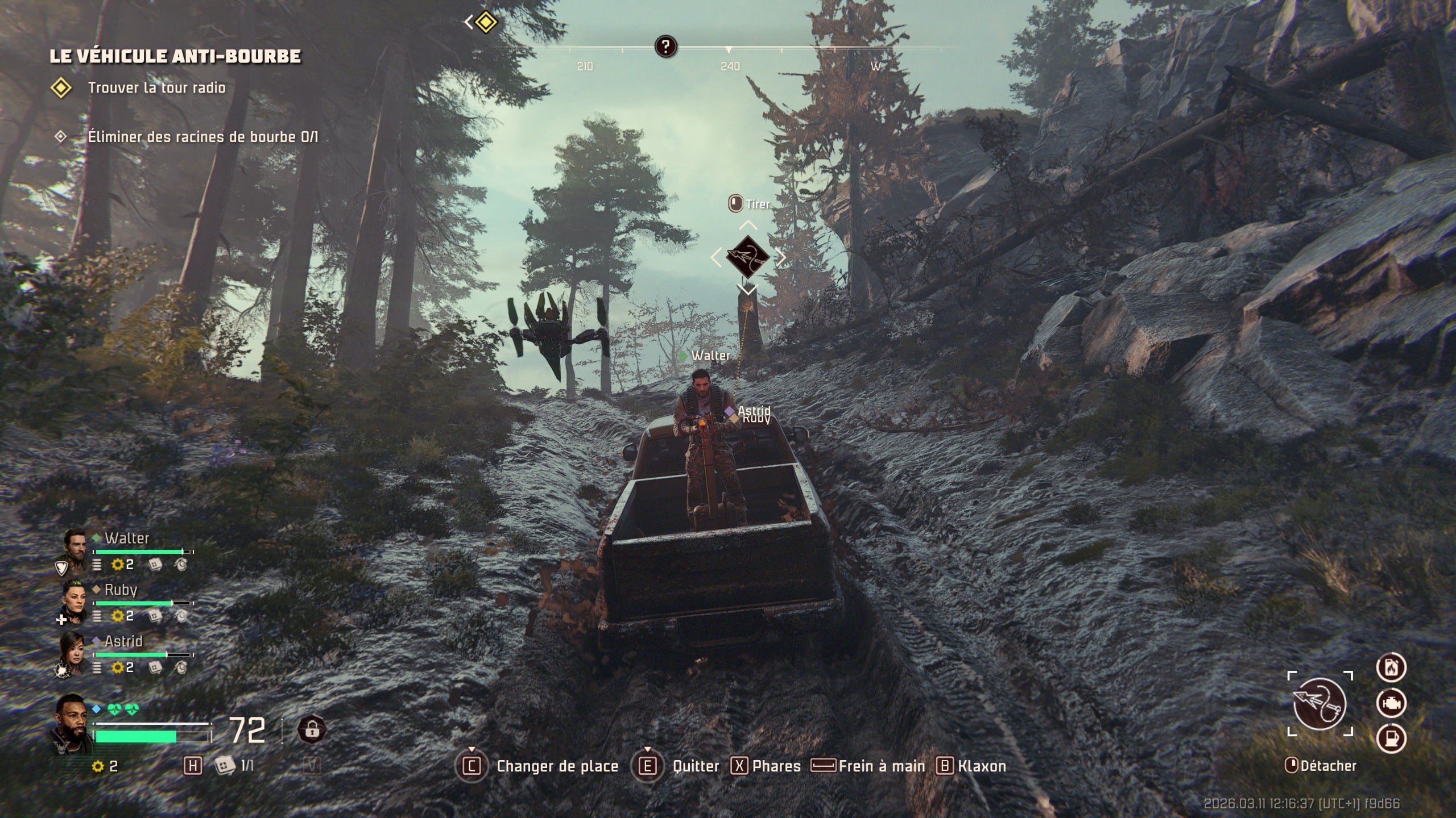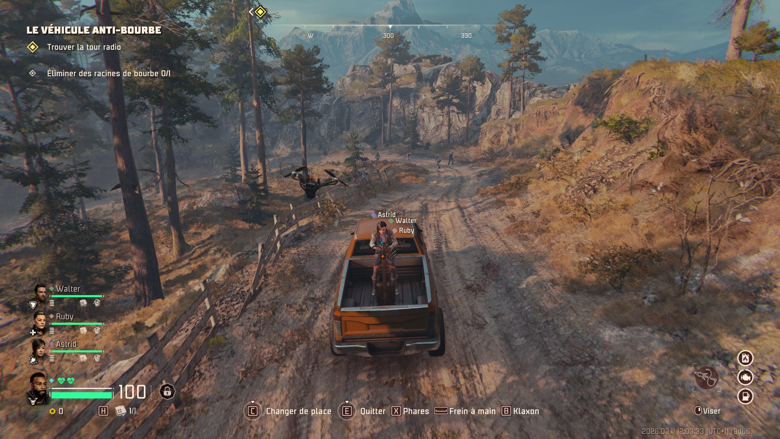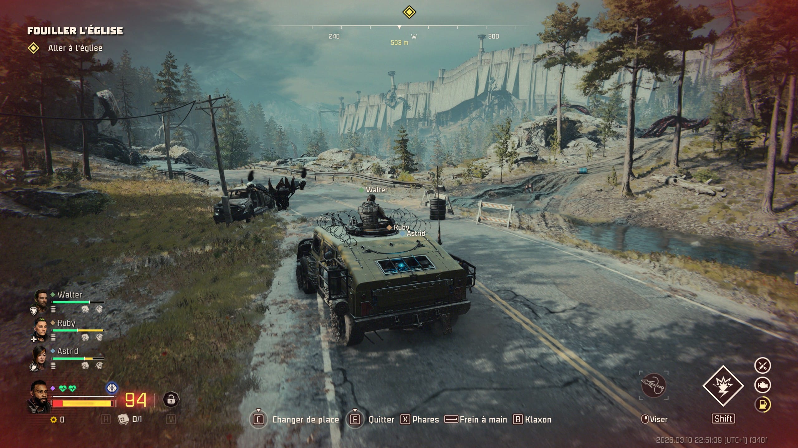 L’aspect déjà très chouette de John Carpenter’s Toxic Commando est de vous laisser la liberté de vous balader à pied ou en voiture. Car oui, le titre donne la capacité aux joueurs et joueuses d’évoluer à pied avec vos coéquipiers, ou via un bolide que vous trouvez en fouillant chaque map. Bien entendu, il faudra forcément faire attention à la jauge d’essence du véhicule, ainsi que tenter de réparer le moteur via un petit mini-jeu si ce dernier prend trop de dégâts. Par ailleurs, vous devrez également trouver des cartouches de munitions pour la mitrailleuse du véhicule, si elle en possède une, ou un baril d’essence, si vous avez un lance-flammes statique à bord.