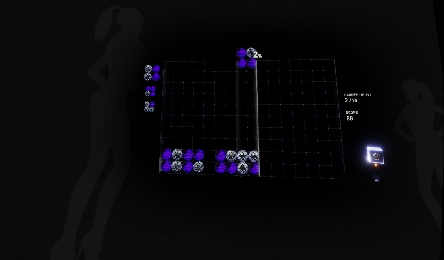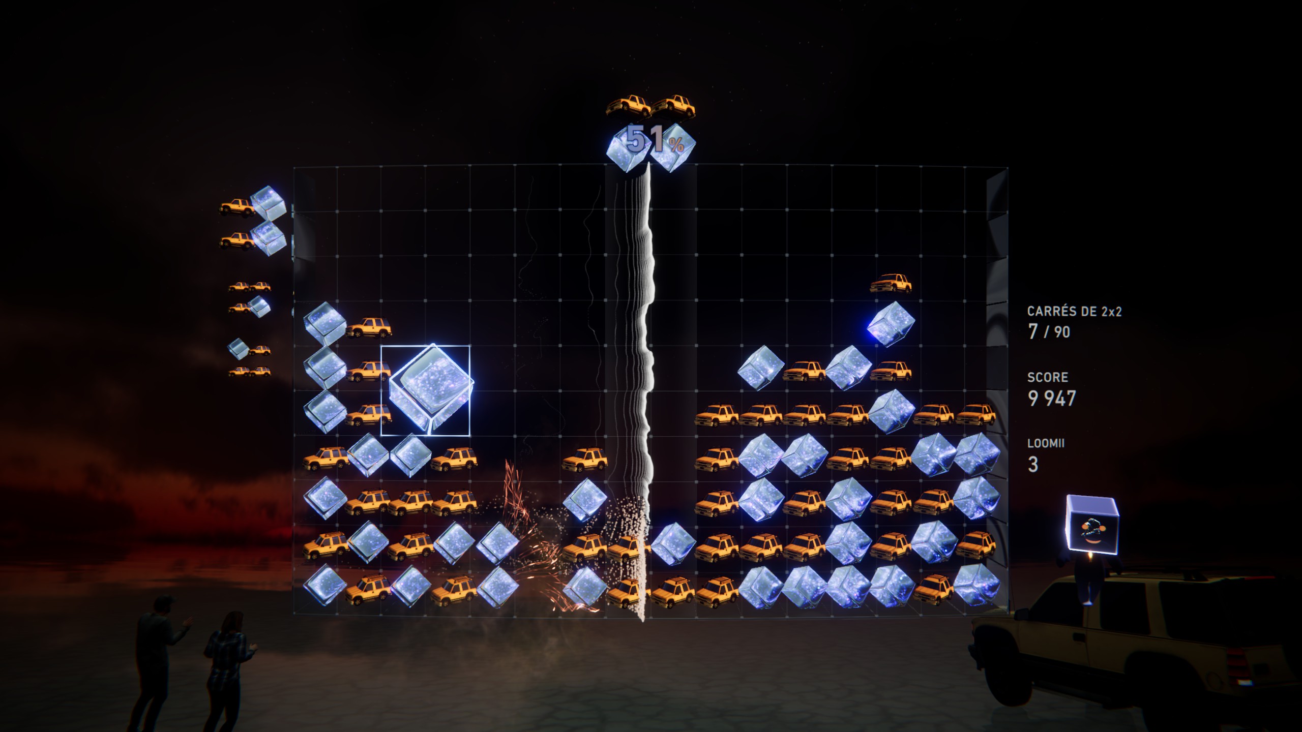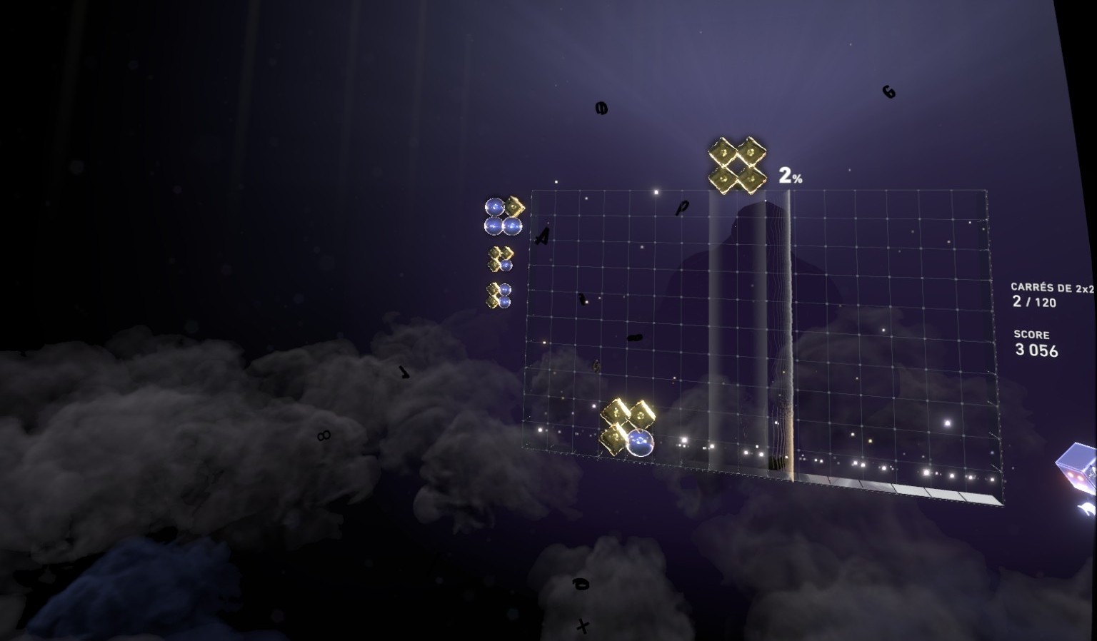 Maintenant que le tour de son contenu touffu est fait, reste le gameplay, qui campe sur les bases de Tetris Effect Connected, avec quelques subtilités bienvenues. Pratiquement comme sur le précédent jeu du studio, vous aurez un cube 2×2 qui tombera à chaque fois, et à vous de le placer convenablement pour former un autre cube de même couleur. Le principe est donc déjà un peu plus technique que dans Tetris Effect Connected, où il ne fallait que casser des lignes. Ici, vous devrez donc former des carrés 2×2 de même couleur, et attendre que la ligne passe pour les valider, et faire montrer votre score et le nombre de cubes détruits.