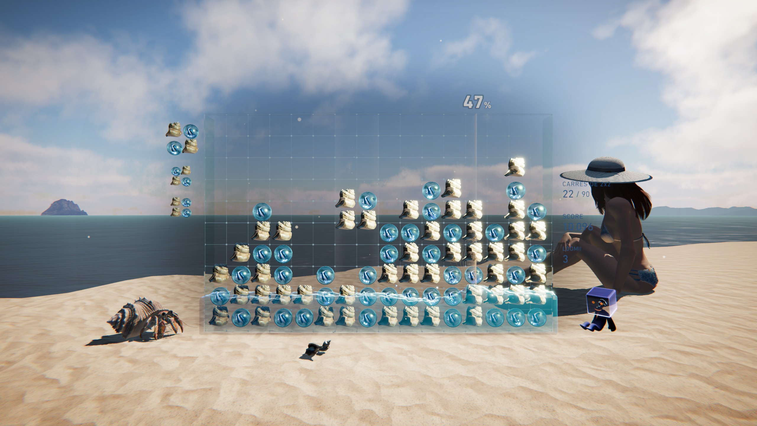 Viennent ensuite les musiques évolutives, le gros point fort du jeu. Commençant de manière douce, les musiques deviennent plus vives par la suite, et restent au service du gameplay. Ces thèmes musicaux vont plus ou moins intensifier la vitesse à laquelle les cubes tombent, et il va falloir être très réactif et plein de dextérité si vous ne voulez pas vous retrouver débordé trop rapidement. Cela accentue le côté très nerveux du gameplay, tout en apposant une patte additive déjà observée sur Tetris Effect Connected. Et concernant la progression, outre le mode survie où vous devez enchainer les musiques le plus longtemps possible sans temps mort, le mode périple vous demande systématiquement de dézinguer un nombre de cubes. Au passage, vous pourrez même à certains moments apposer un des blocs ornés d’un viseur avec un autre bloc d’une même couleur, afin d’effectuer une belle réaction en chaîne et vous en sortir.