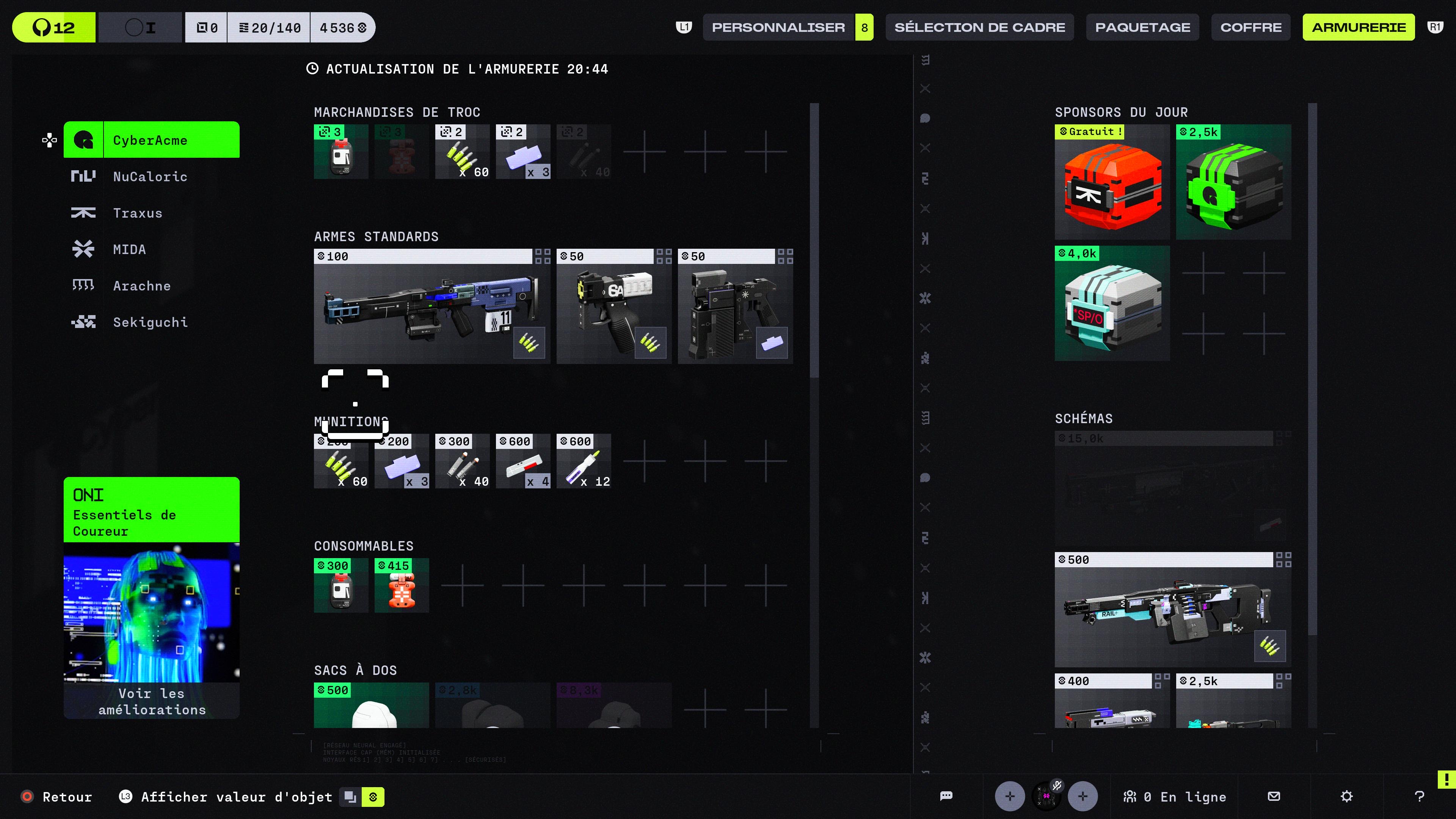 Le studio a fait le choix d’utiliser des icônes similaires pour les différentes catégories, comme les implants personnels ou les mods d’armes, ce qui devient vite problématique lorsque nous devons parcourir un inventaire rempli de ces objets octroyant des bonus à notre personnage. Il aurait fallu un signe distinctif dans le but qu’elles soient plus facilement reconnaissables. En conséquence, il nous est arrivé bon nombre de fois de perdre un temps considérable à survoler chaque case de l’inventaire, dans le seul but de prendre connaissance du bonus que confère un objet, une fois celui-ci équipé sur notre arme ou notre coureur.