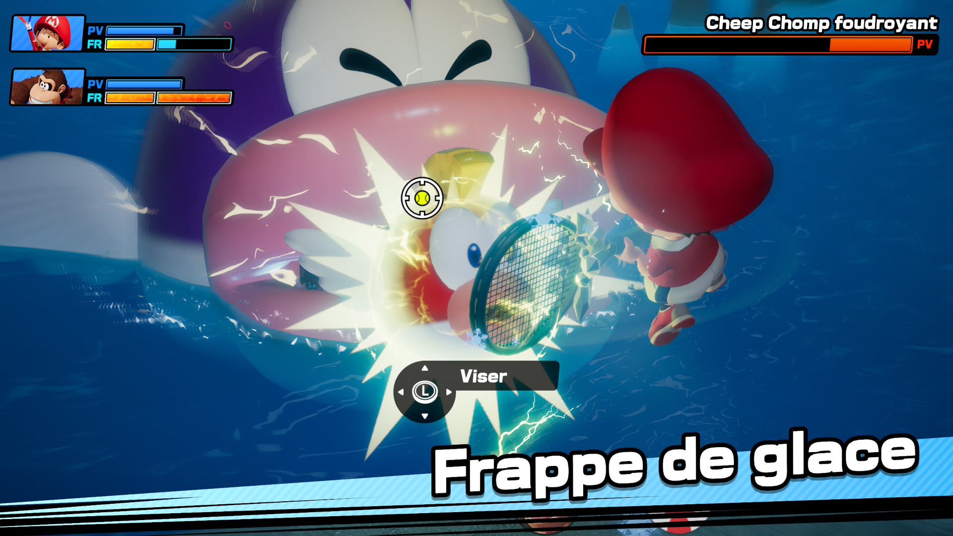 Bien évidemment cette frappe particulière ne doit pas toucher le sol de votre surface, au risque de déclencher l’habileté de la raquette frénétique que vous avez sélectionnée au préablable. En fonction de ce que vous avez choisi, la frappe frénétique pourra matérialiser de la foudre, du feu, voire de l’encre partout sur le terrain, pouvant justement vous faire perdre de la vie, vous ralentir et potentiellement vous faire perdre un précieux point, ou vous faire mener sur le set en cours. Cependant rassurez-vous, cette frappe frénétique est tout à fait contrable, bien qu’il faille logiquement anticiper la frappe de votre adversaire à l’instant T. Vous l’aurez compris, dans sa grande simplicité, Mario Tennis Fever reste globalement très profond dans son gameplay, même si le titre est passé à quelque chose de plus arcade dans le feeling.