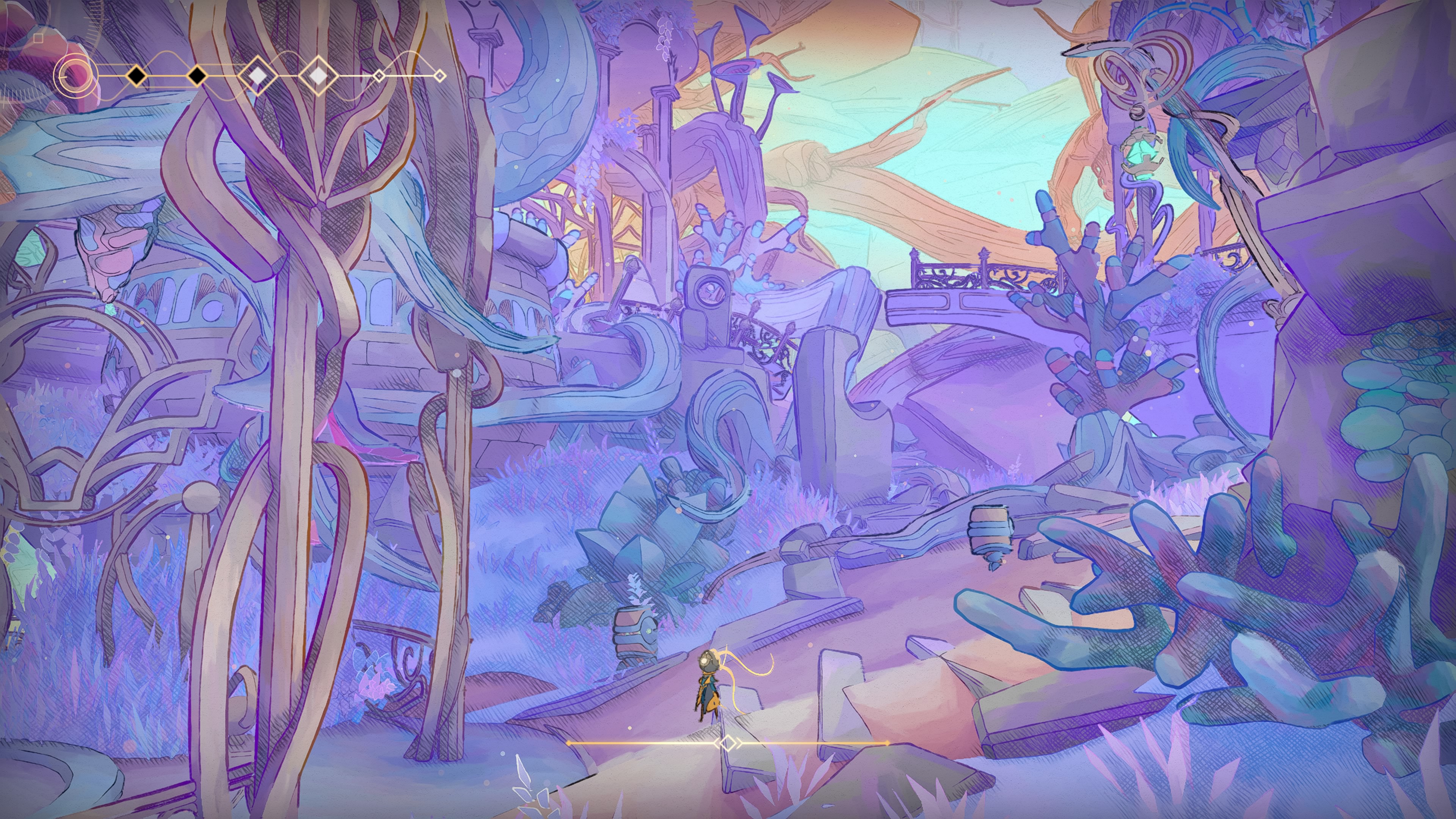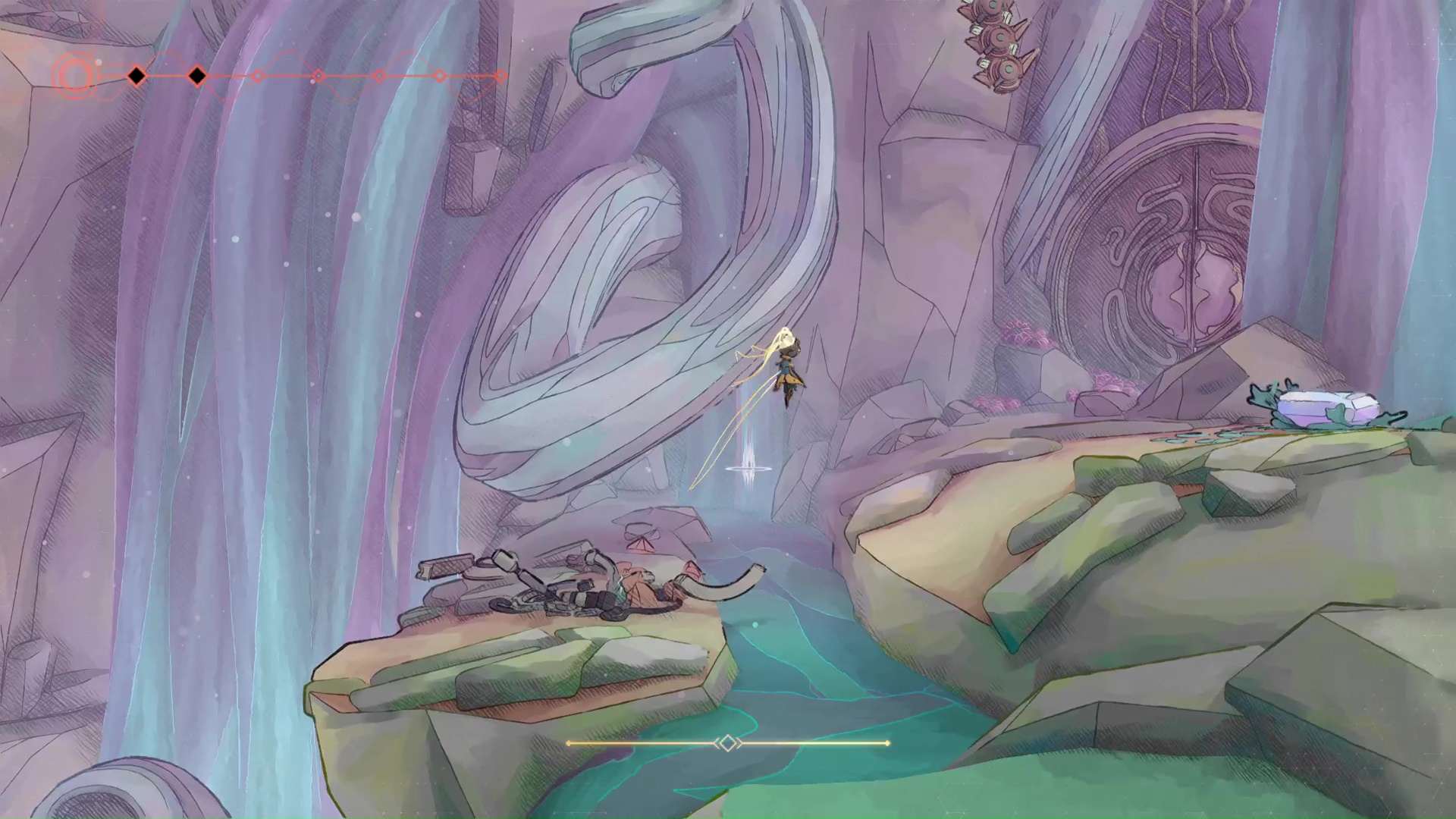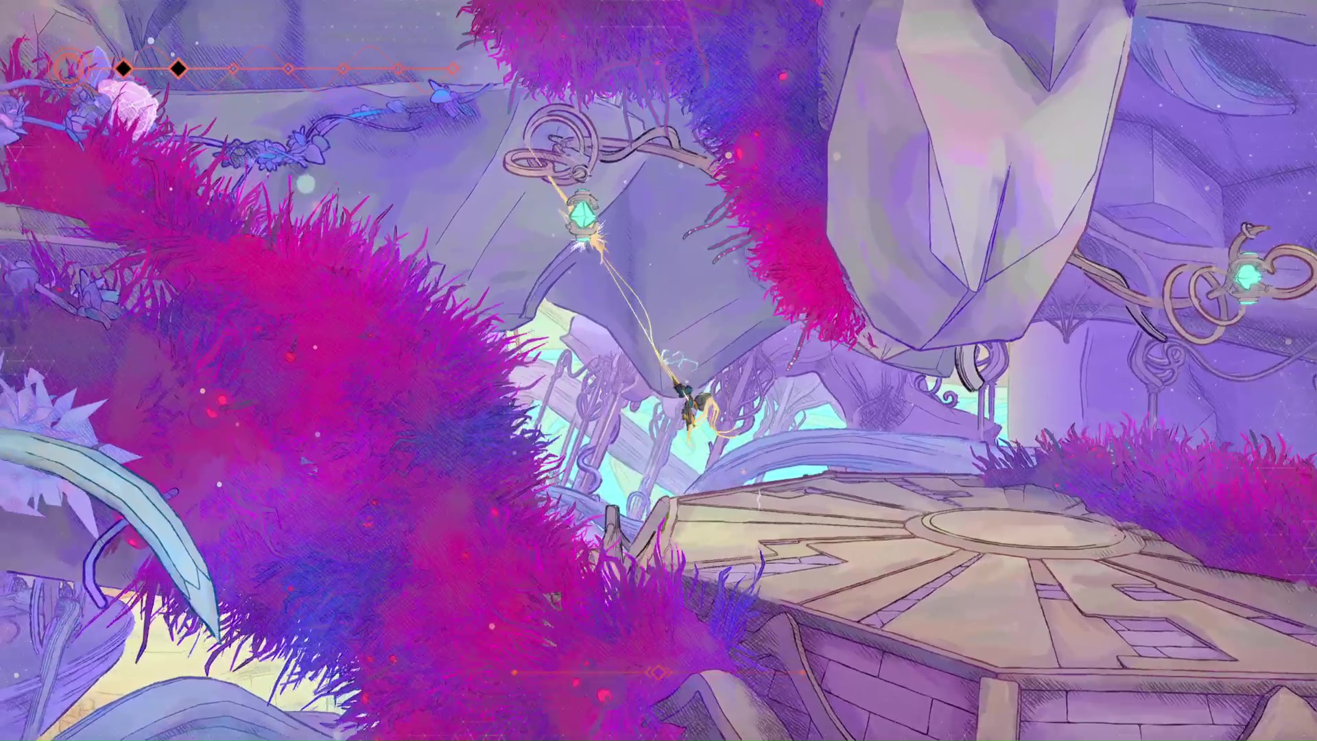 Logiquement débloquée une fois l’aventure assez avancée tant cette capacité chamboule complètement la manière d’évoluer à travers l’Arche, l’utiliser est un vrai un bonheur pour les mains et les yeux. Son animation et la maniabilité intuitive dont elle fait preuve sont tout bonnement hypnotisantes, en plus de devenir un atout essentiel pour un backtracking minutieux. Grâce aux Flâneuses, on peut effectivement revenir dans chaque biome et scruter le moindre angle mort ou grimper à n’importe quelle paroi.