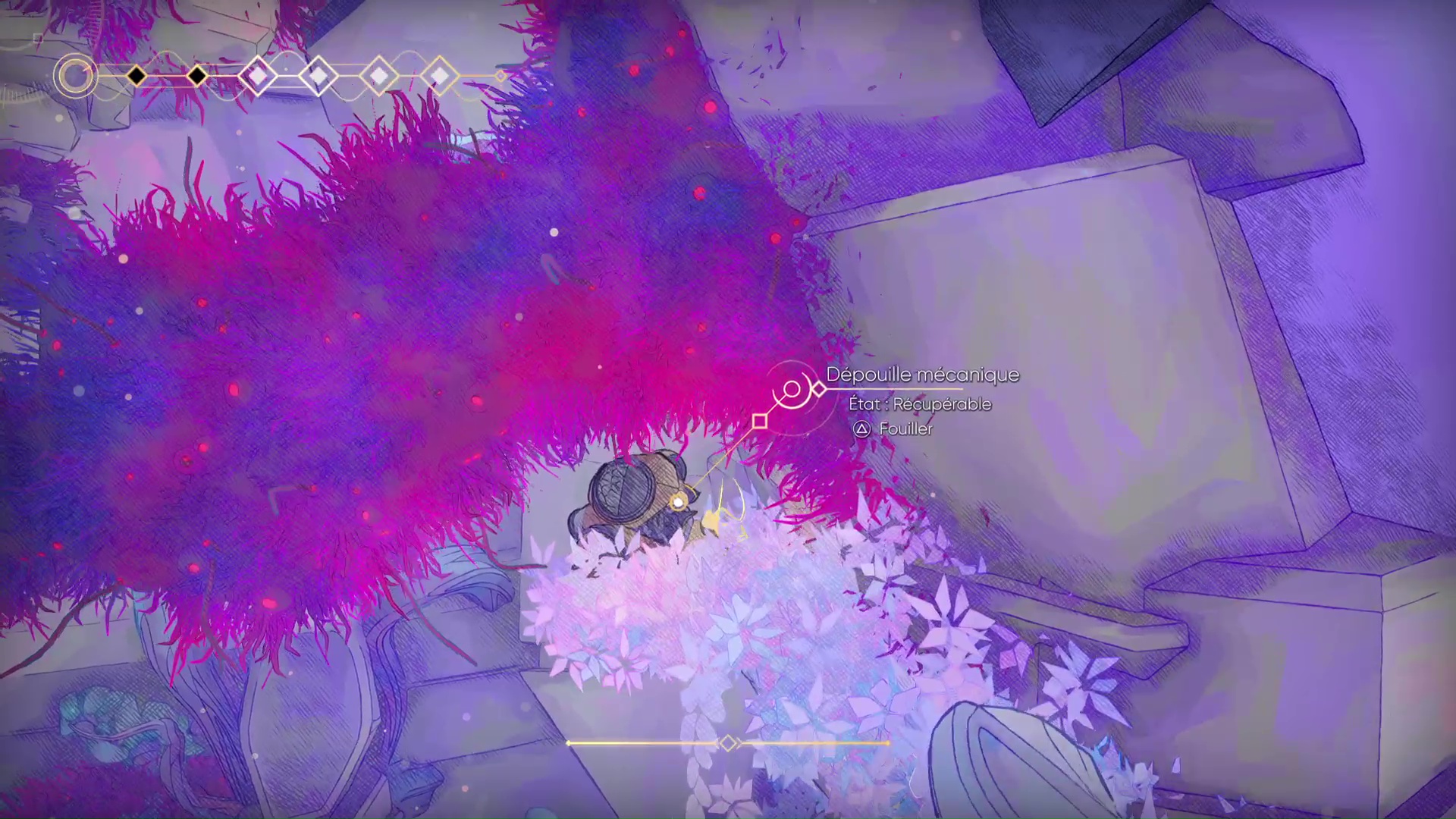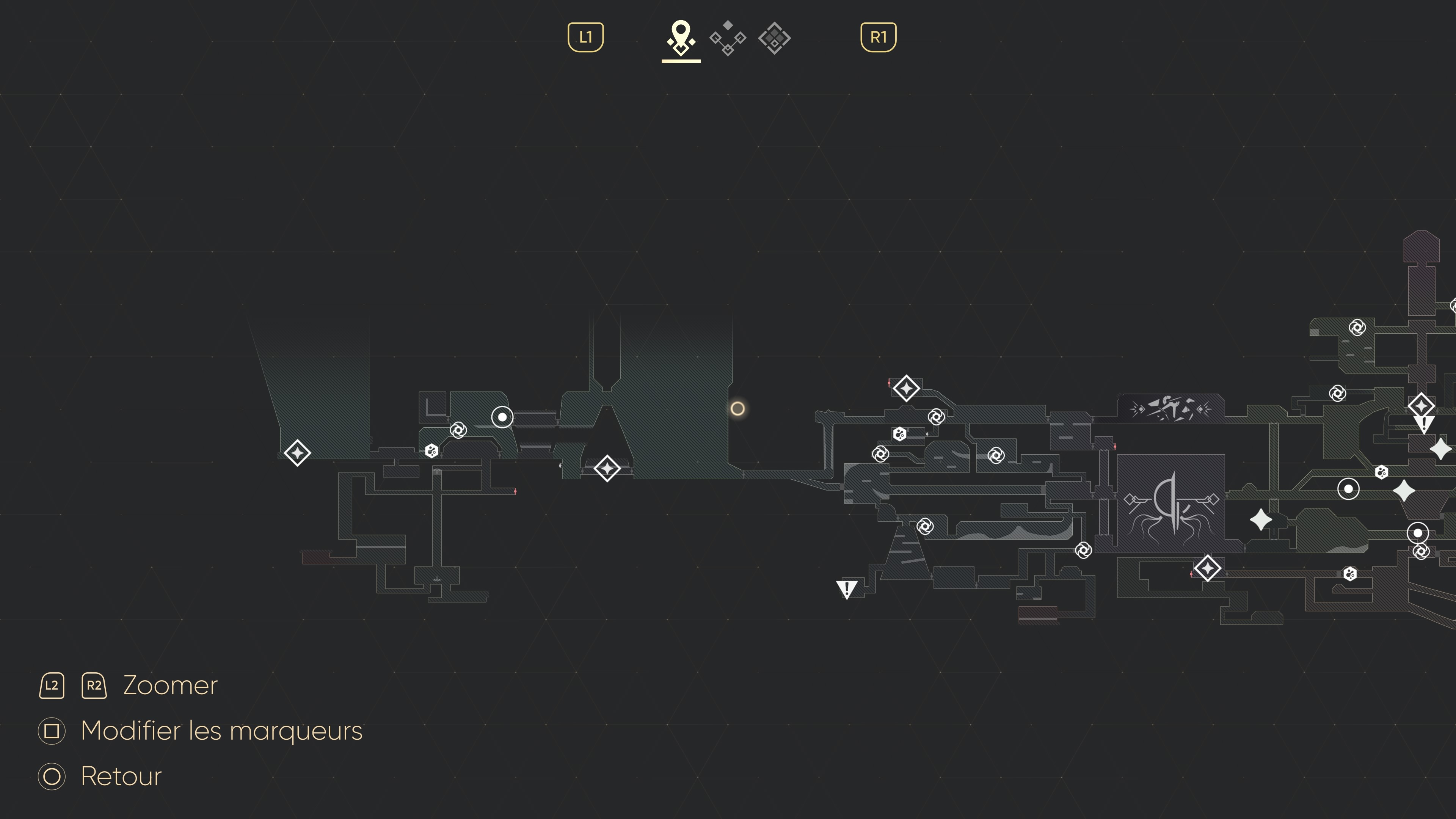 Heureusement, la carte nous indique, via des pointillés clignotants, que nous avons oublié de fouiller un coin jusqu’au bout. Hélas, non seulement ce n’est pas toujours le cas, mais en plus cela concerne l’aspect géographique de la zone. On peut avoir exploré à fond un endroit tout en ayant oublié un petit objet, et ça, rien nous ne le dira. Les informations sur la carte se cantonnent au strict minimum, en indiquant les fontaines de soin, les points de sauvegarde et les robots capables de cristalliser notre nacre.