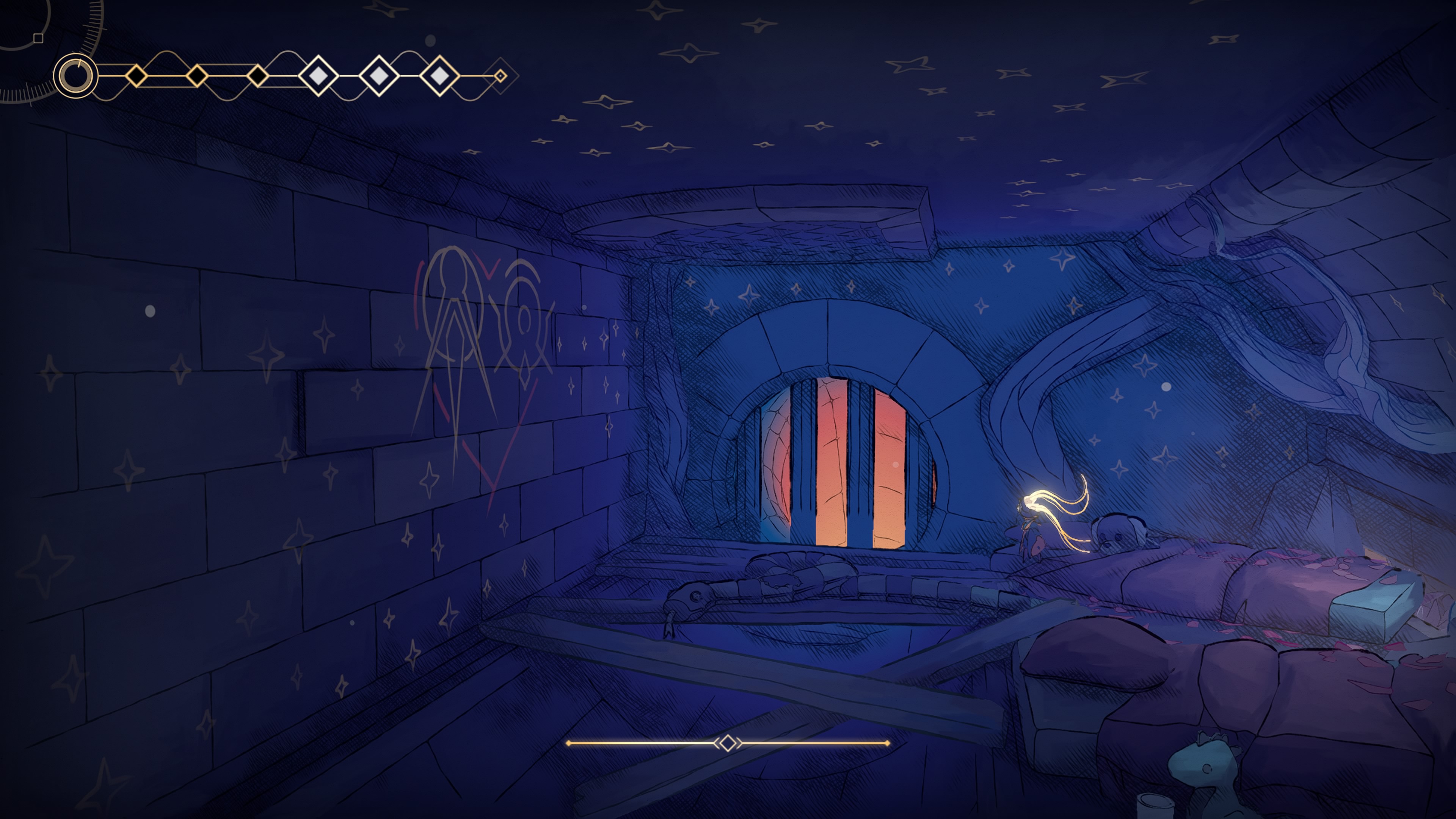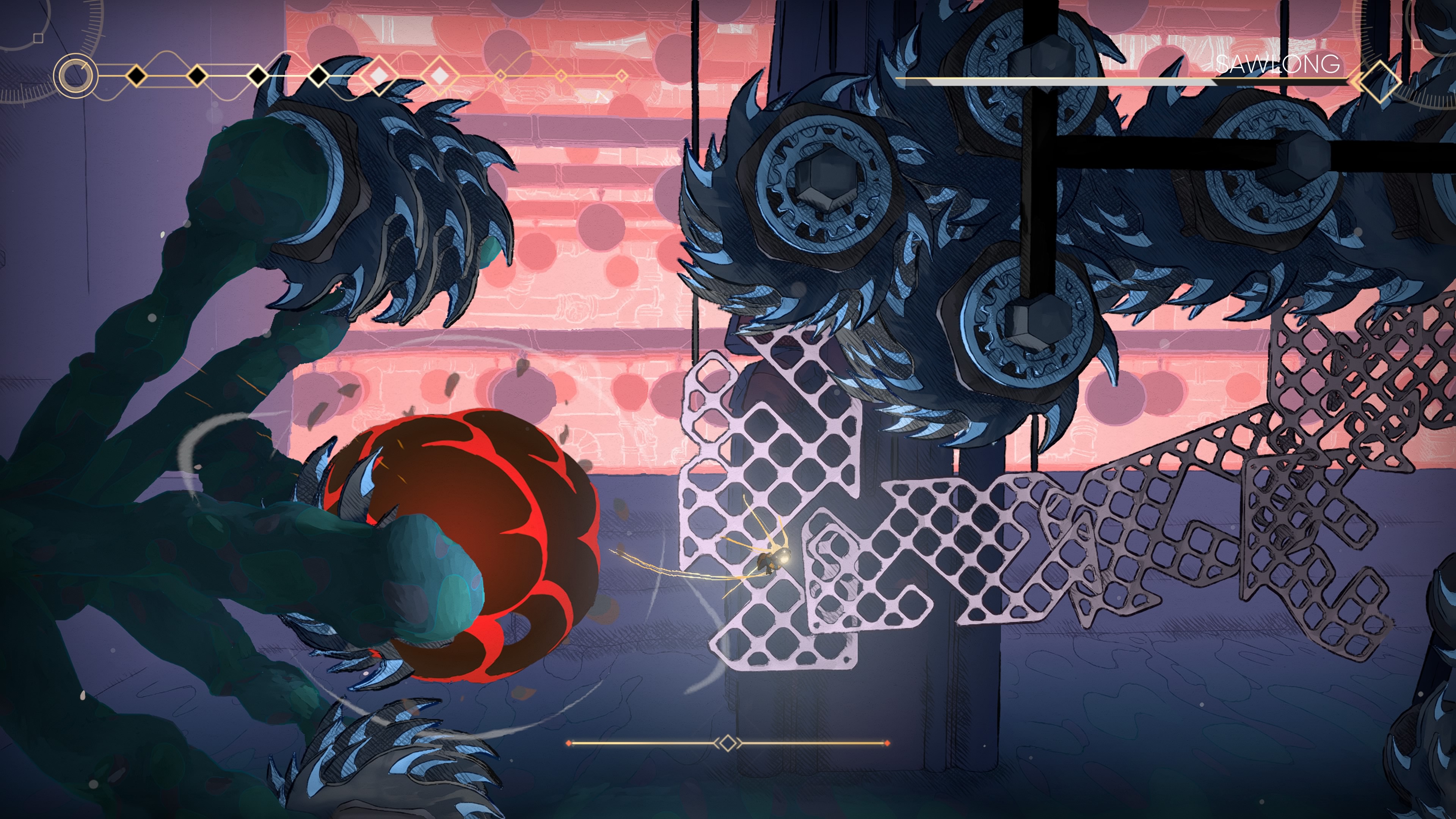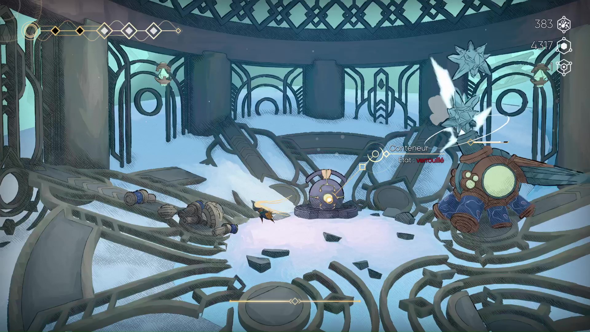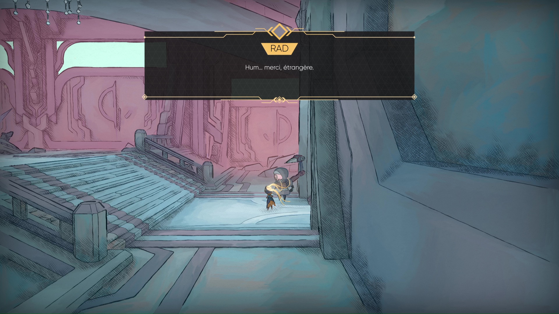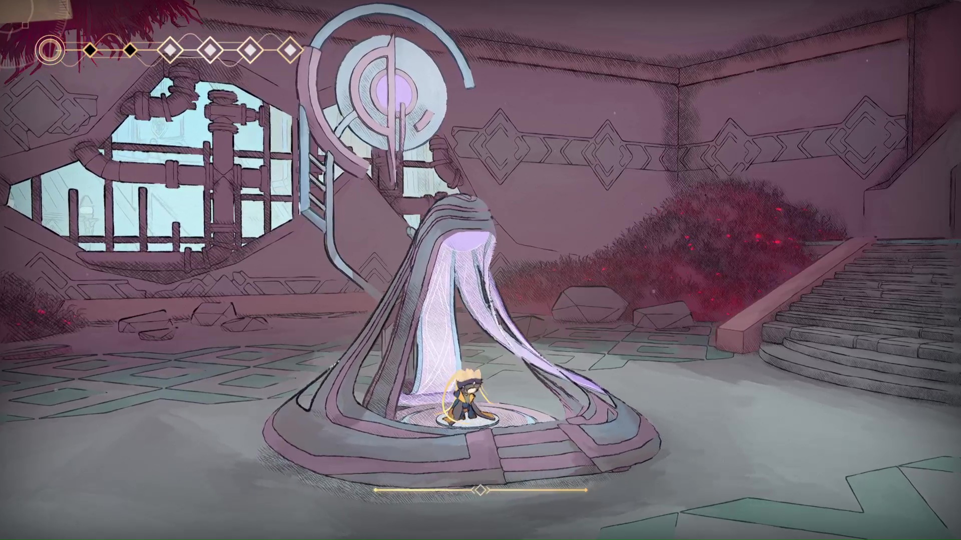 Réussir à installer une patte graphique aussi inspirée pose les premières pierres d’une exploration plaisante, bien renforcée par une bande-son agréablement surprenante. Menées par Nicolas Gueguen, les compositions synthétiques offrent une amplitude assez admirable entre la traversée chill du Sanctuaire (encore lui) et des combats de boss un peu plus rythmés.