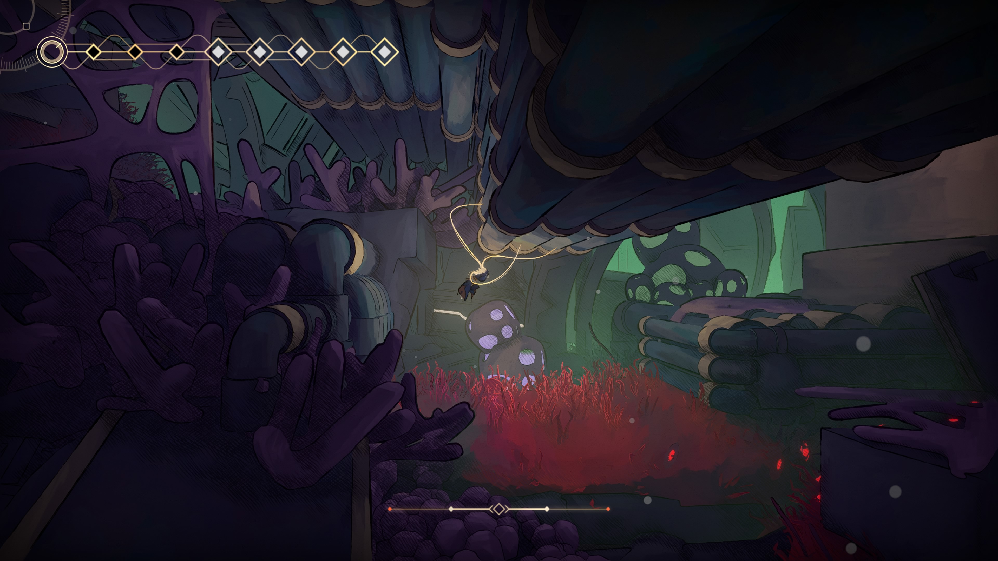 Mais dès que l’on obtient les premiers pouvoirs, comme le grappin ou la faculté de planer, très vite les possibilités s’ouvrent. La liberté de déplacement finit même par atteindre des sommets avec les Flâneuses, ou « pouvoir de l’araignée », pour que ce soit plus visuel. Concrètement, les filaments qui sortent de la tête de MIO lui servent de pattes d’araignée pouvant s’accrocher à n’importe quelle surface.