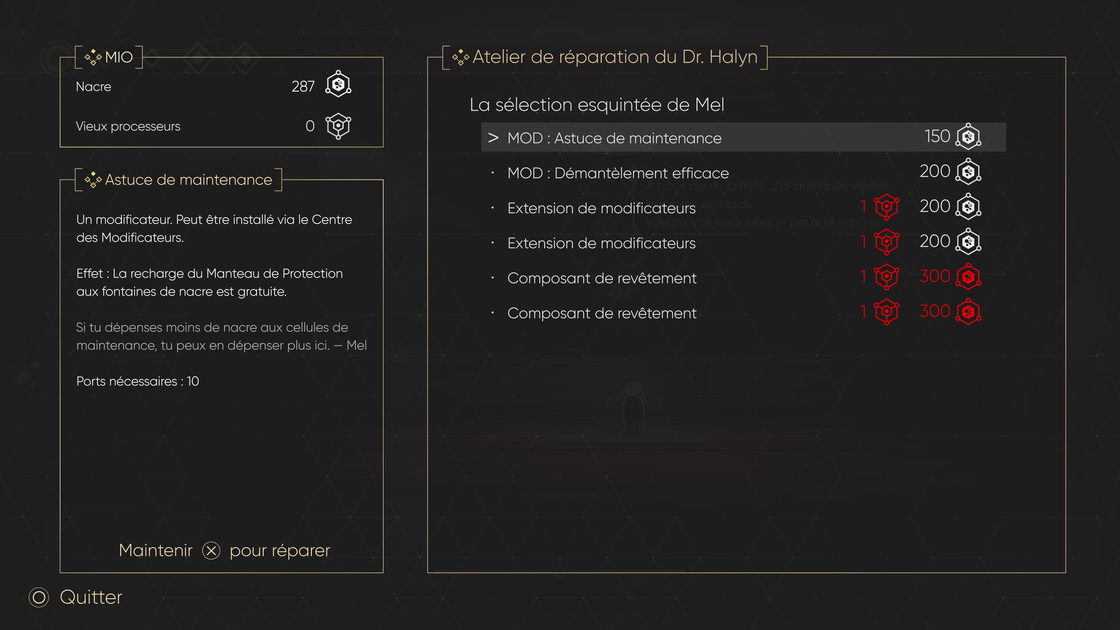 Ce n’est heureusement pas tout puisque l’on peut compter sur quelques robots amicaux pour nous offrir, entre autres, des modificateurs, en répondant à leur demande. Et puis il y a surtout Mel, un robot bricoleur disposant d’un atelier. En échange de nacre, que l’on gagne en battant des ennemis ou en brisant des tas de déchets, on est en mesure de lui acheter directement des mods, ou bien des places supplémentaires pour les installer, et même des « quarts de cœur » pour booster sa vie.