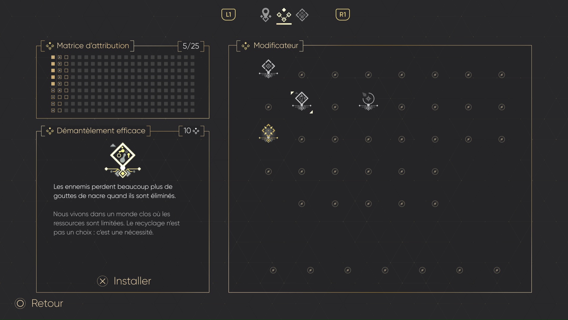 D’autres facilitent la récupération de la jauge d’énergie ou améliorent l’effet des pouvoirs comme le grappin ou le vol plané. Ces petits changements s’effectuent d’ailleurs via une interface très claire et élégante, à l’image du reste du jeu. Cela étant dit, installer ces modificateurs coûte de la place. Tout ne peut pas être fixé, ce qui encourage à choisir un build. La bonne nouvelle, c’est que l’on peut modifier nos combinaisons assez facilement, en se rendant à l’un des points de sauvegarde. De plus, des malus s’invitent dans l’équation. En échange d’un affaiblissement de nos performances, on accueille un gain de place plus ou moins important sur le circuit de MIO.