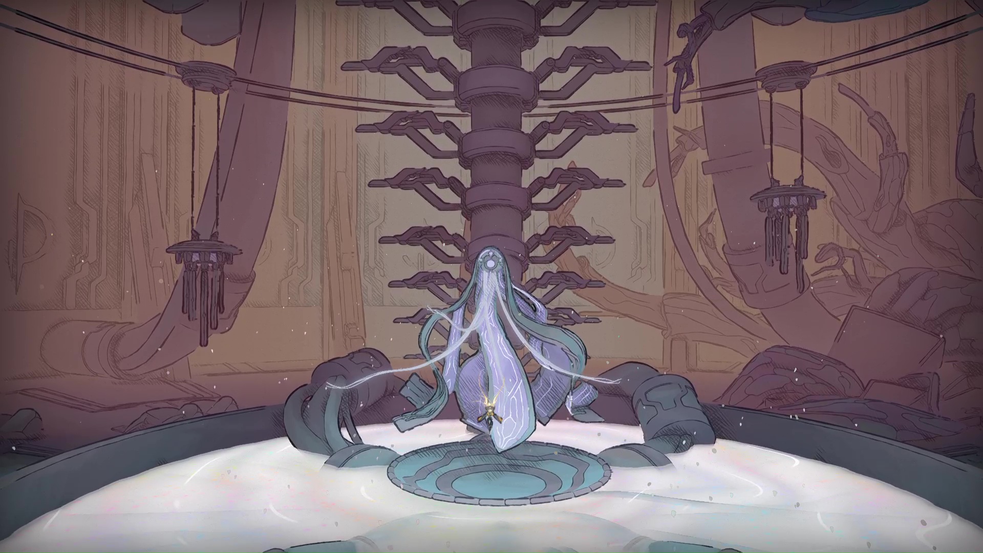 Sobrement guidé par le personnage répondant au nom de Shii, nous nous lançons alors à la recherche de ces entités majeures, en quête de réponse. Au début de notre visite, l’histoire est en effet très cryptique. Mais au lieu de partir dans une intrigue façon Hollow Knight où les tenants et aboutissants peuvent demeurer assez flous y compris une fois le terme de l’aventure atteint, on a ici droit à une narration parfaitement distillée.
