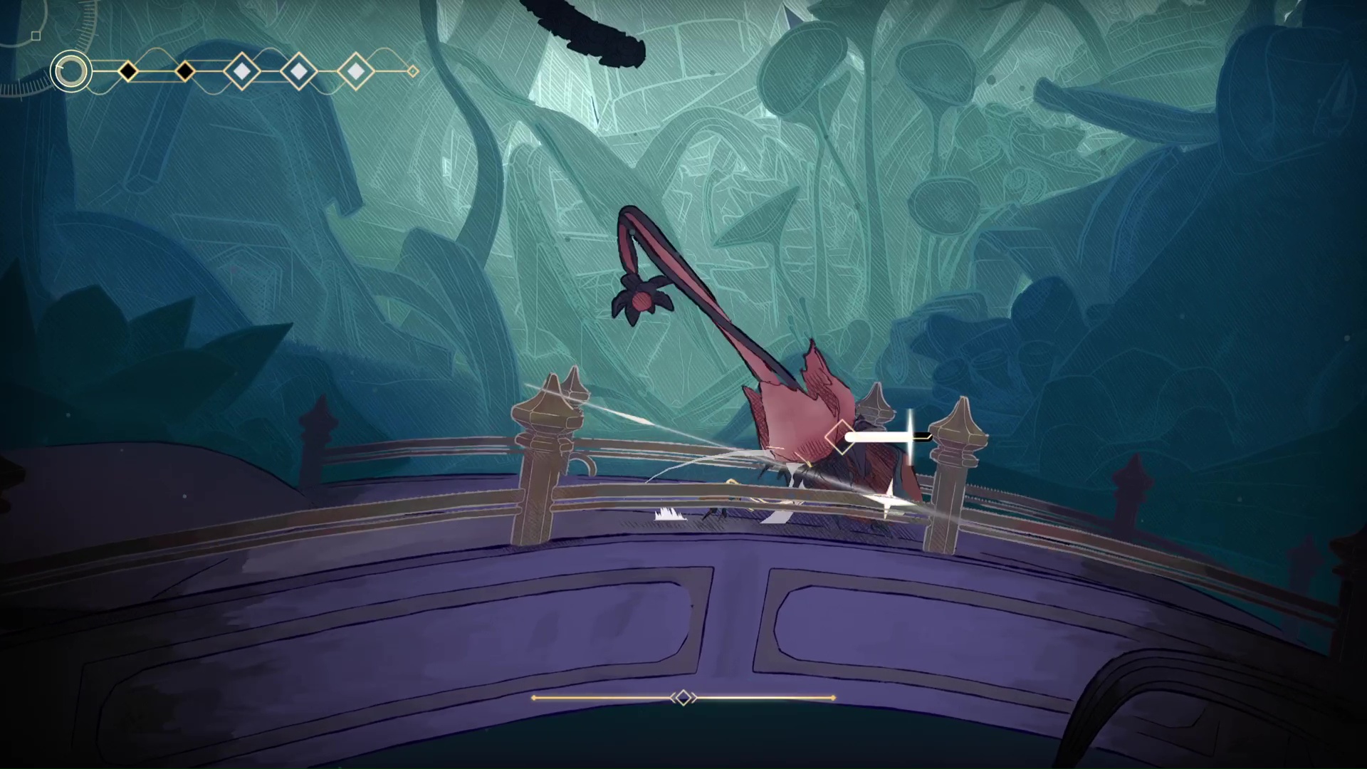 Au début de l’aventure, on rencontre donc quelques soucis à vouloir enchaîner des mouvements trop vite, causant maladroitement des sauts ratés voire la perte de points de vie. Heureusement, on pourra aussi compter plus tard sur des éléments du décor ou des ennemis pour la récupérer. C’est également de cette manière que se gère la récupération en l’air d’un double saut. Quand on vous dit que le gameplay est aérien, on ne ment pas.