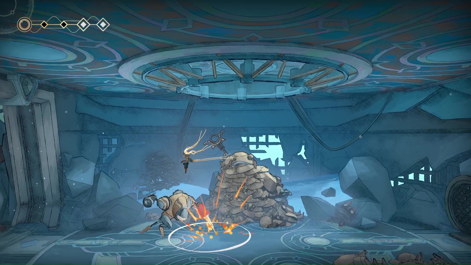 À l’inverse, les plus férus d’action frénétique regretteront sans doute un gameplay de combat trop basique. MIO dispose effectivement d’un combo de trois attaques… et c’est tout. Le reste se joue du côté des mouvements spéciaux. Là où le grappin nous offre de la verticalité pour les phases de plateforme, il sert aussi à se rapprocher des ennemis aériens. Les Flâneuses garantissent quant à elles d’utiliser les parois comme solution pour esquiver une attaque, etc.