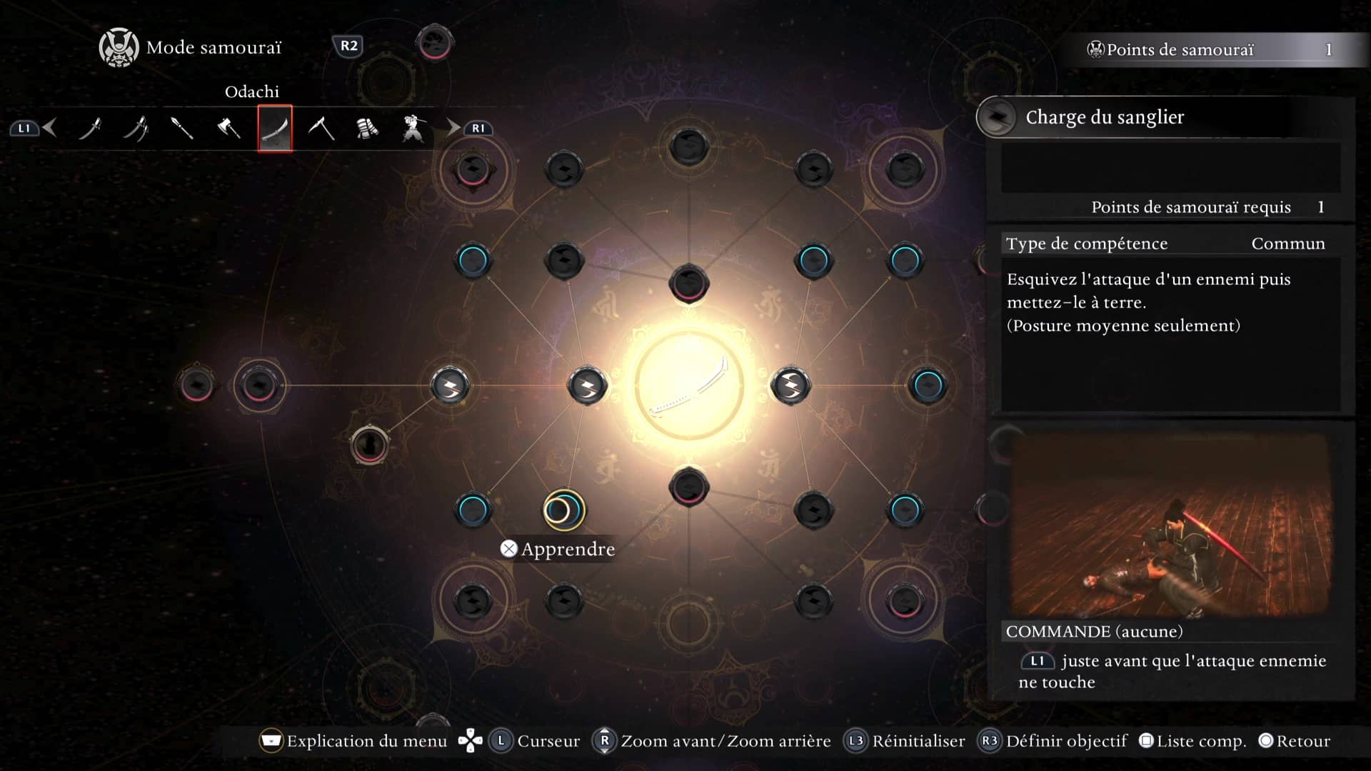 Idem pour le menu des compétences d’armes, qu’il faut régulièrement consulter pour voir ce que l’on a débloqué, avant de basculer sur un autre menu consistant cette fois à équiper les compétences en question sur chaque arme et chaque combinaison de bouton, si disponible. Et puis il faut faire un tour à la forge, pour aller démanteler le surplus d’équipement, ou bien le vendre, ou le remodeler. Ah et n’oublions pas les « titres », des exploits à réaliser octroyant là aussi des avantages permanents, ou même la gestion des noyaux d’âme, voués à booster notre attaque et défense tout en pouvant invoquer nous-mêmes des yokai…