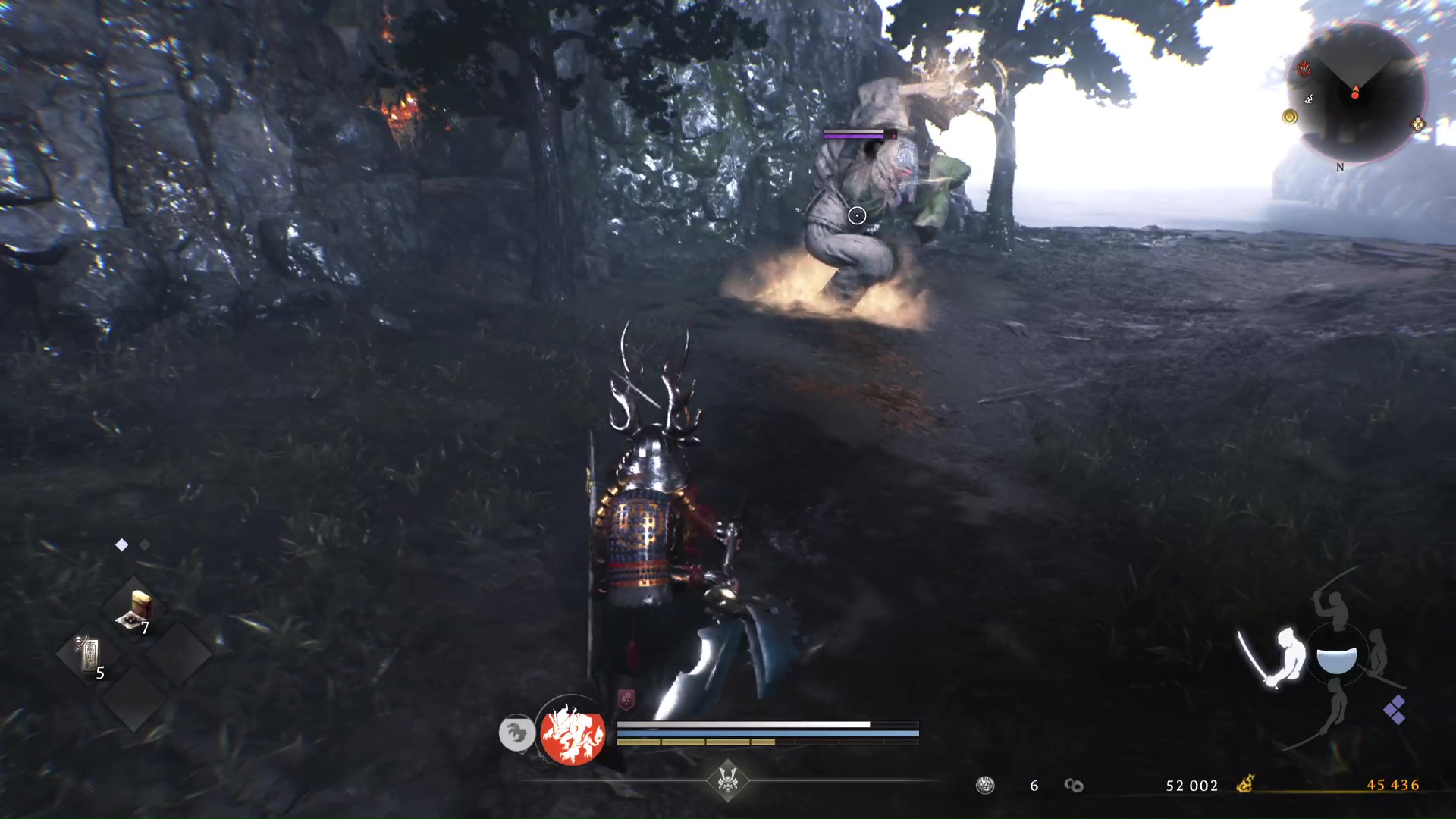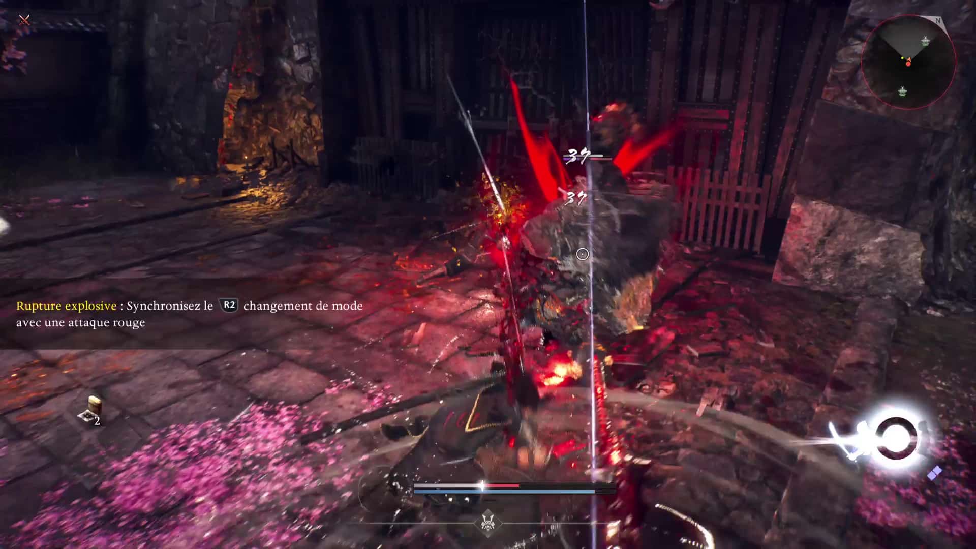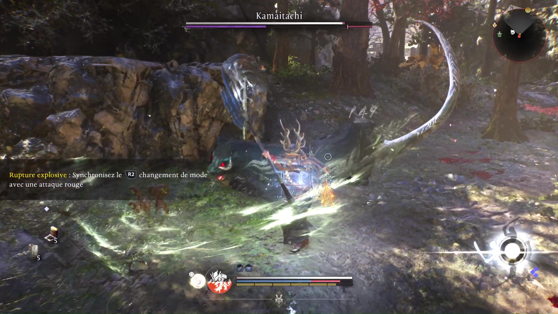 Illustration concrète lors d’un combat de boss : il est par exemple préférable d’opter pour le rôle de ninja afin de rester mobile et ainsi visualiser et esquiver ses patterns, puis lorsque l’on connait un peu mieux la bête, on sait quand frapper fort avec le samouraï. Et puis, on se construit nos propres habitudes pour chaque rôle. Se mettre en garde, parer ou réduire la jauge de Ki adverse sont des actions à privilégier du côté du samouraï, tandis que gérer un groupe d’ennemis ou réaliser des esquives répétées s’avère plus aisé aux commandes du ninja.