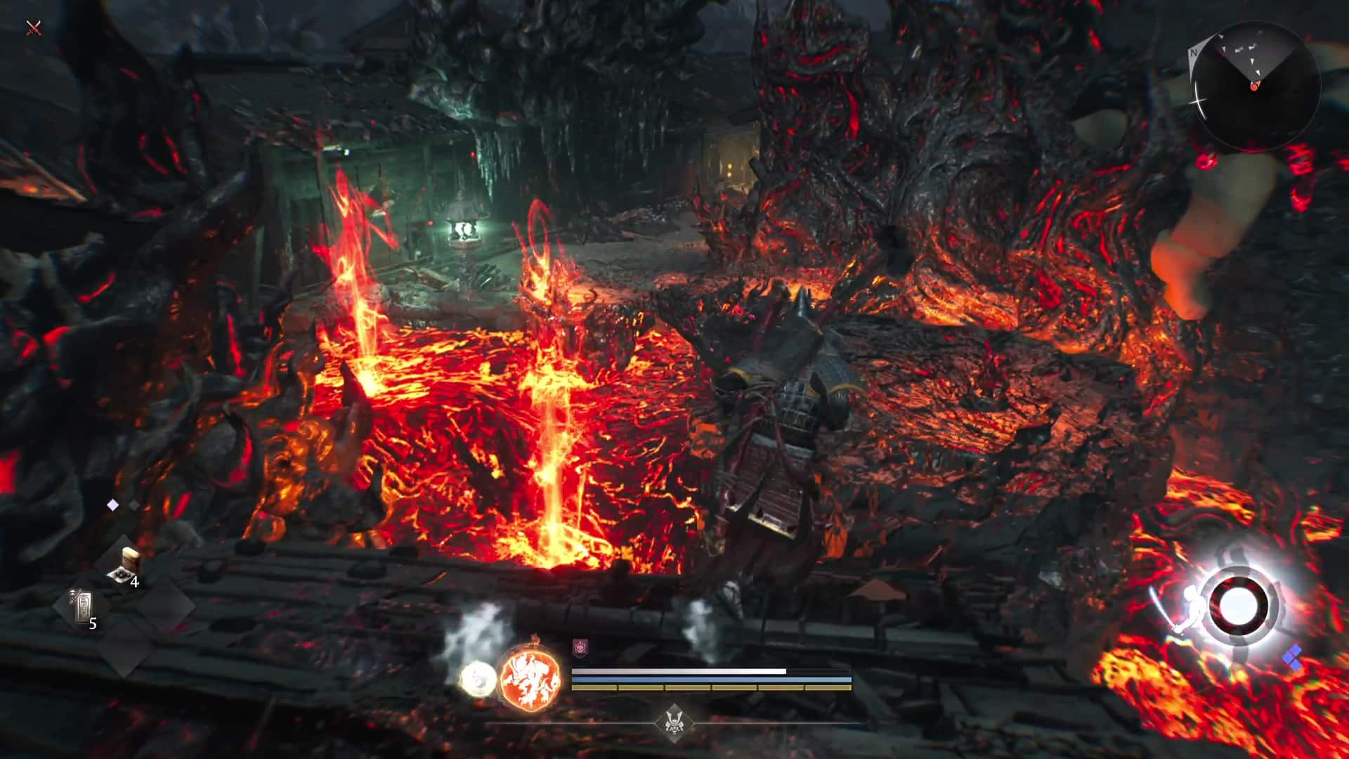 Une utilisation à coupler avec l’émergence des zones du « Royaume Yokai », sortes de flaques spirituelles maléfiques créées par les démons et qui doivent donc être purifiées via cette impulsion de Ki, sous peine de retarder voire empêcher la récupération d’énergie. Mentionnons aussi le système de posture, articulant là aussi la vitesse de récupération d’endurance. Celle-ci augmente et il est plus simple de bouger si la posture est basse. A contrario, une posture haute puise davantage dans le Ki mais inflige de plus gros dégâts.