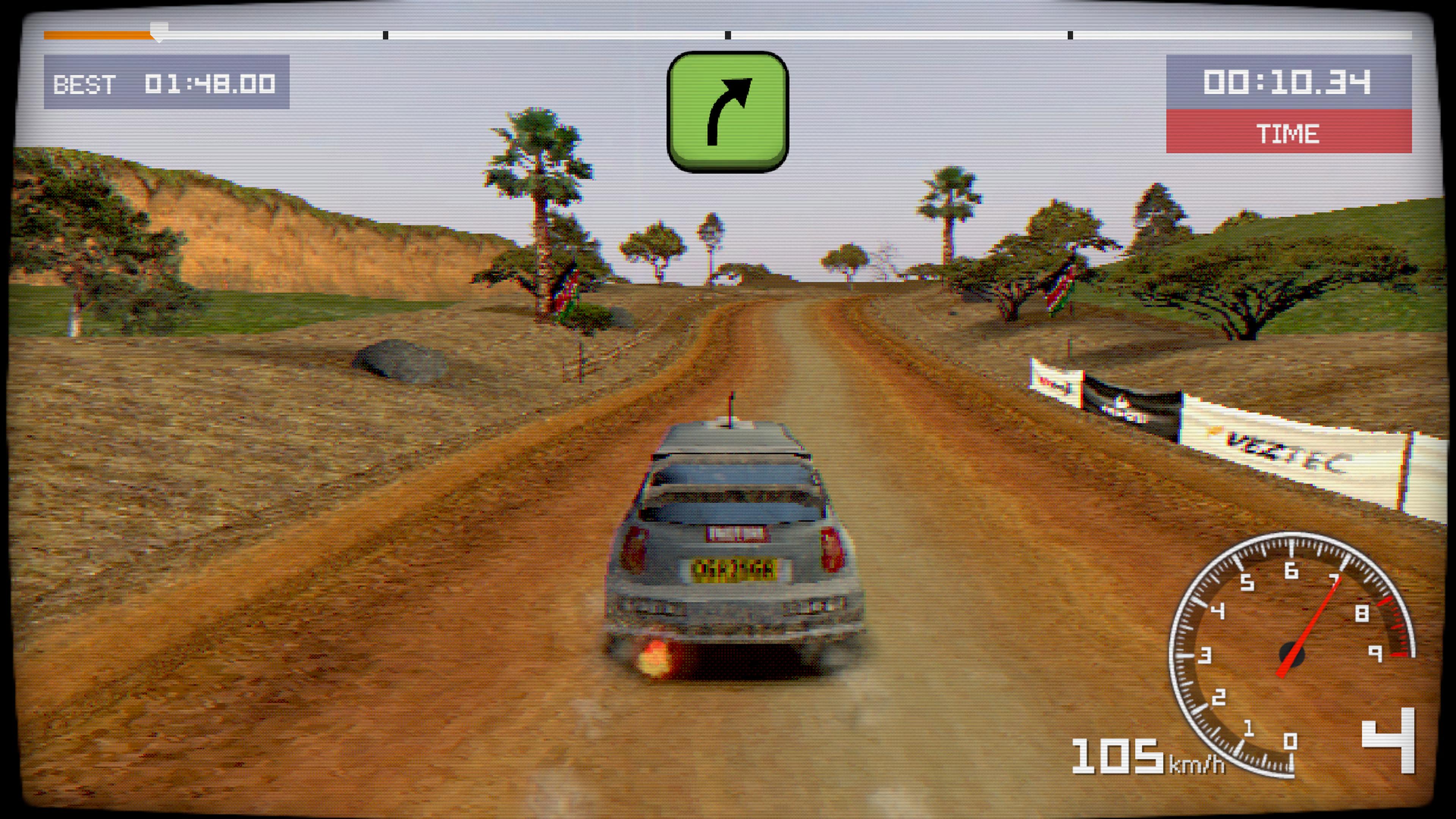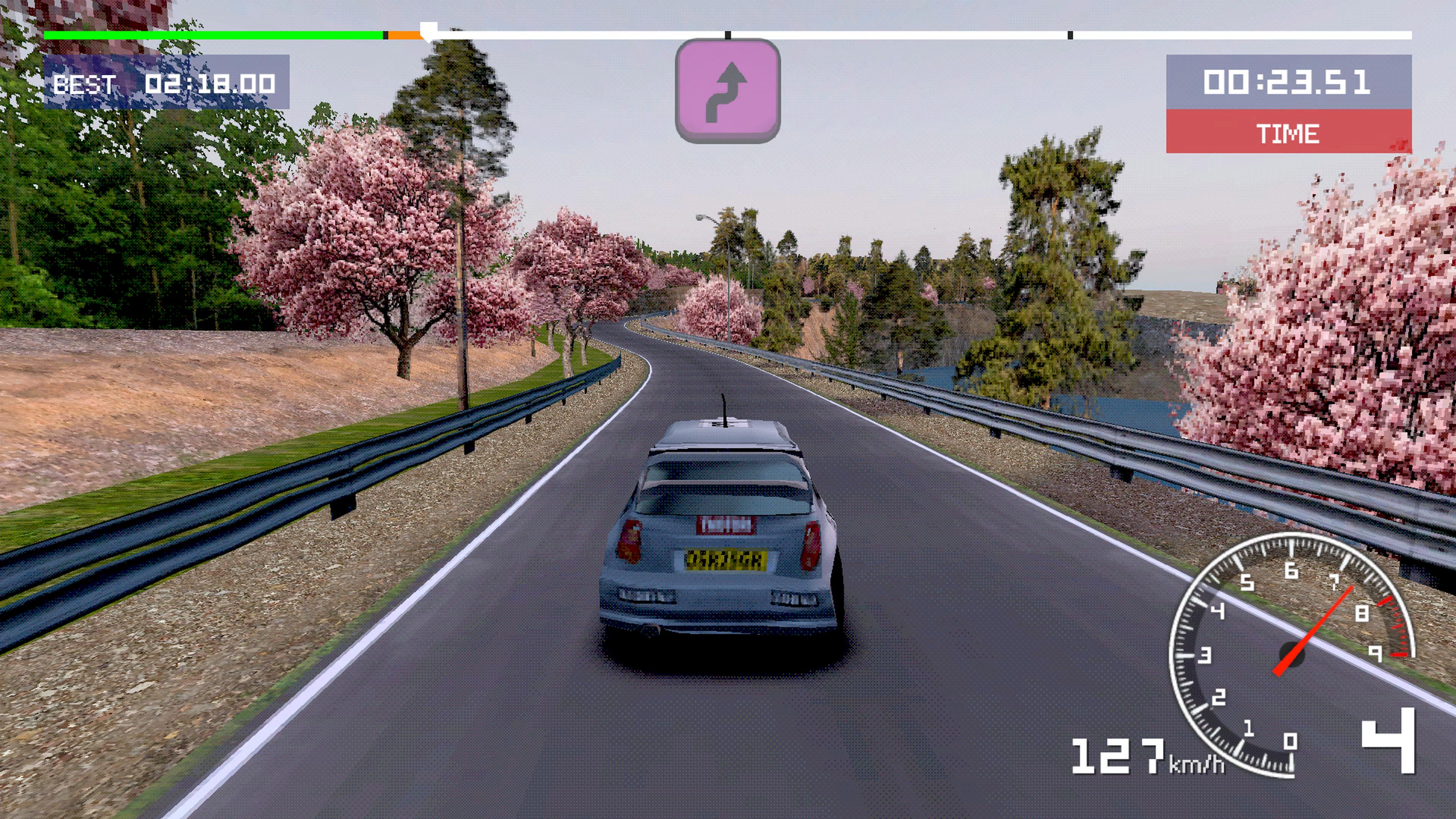 Old School Rally, c’est donc un jeu de course s’inspirant, on vous le donne en mille, de la compétition de rallye automobile. Comme en 2002 avec l’excellent Colin McRae Rally 3, pour ne citer que ce classique, le titre nous fait voyager à travers la planète, en nous proposant des tracés se situant un peu partout, du Japon au Kenya, en passant par l’Allemagne et l’Australie. Des localisations qui ont évidemment leur spécificités propres, que ce soit la présence appuyée de neige faisant abondamment glisser notre véhicule, ou des routes goudronnées extrêmement sinueuses, par exemple. Le résultat visuel ressemble à s’y méprendre à un jeu PlayStation première du nom, avec des pixels apparents et un nombre de polygones réduit.