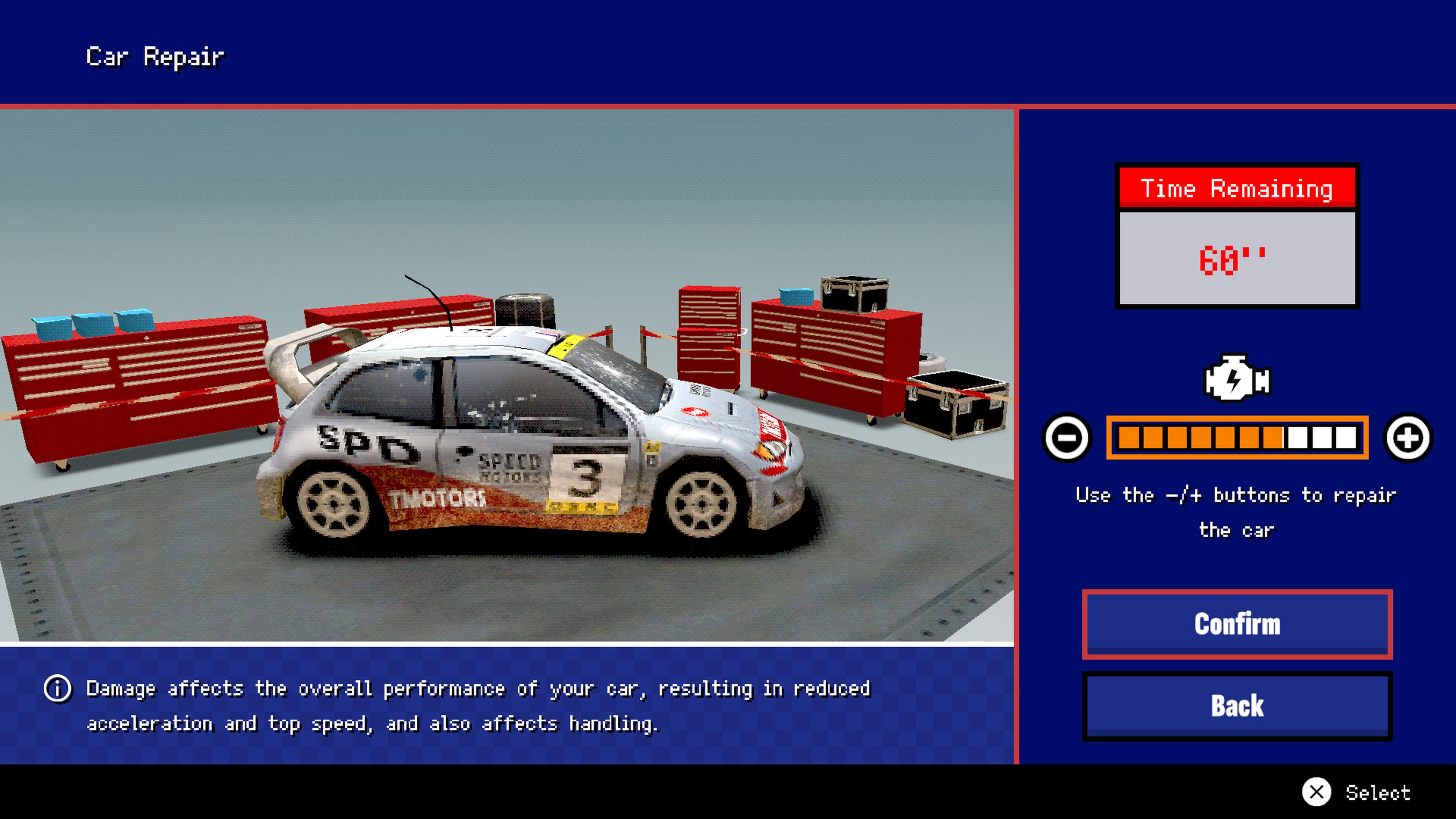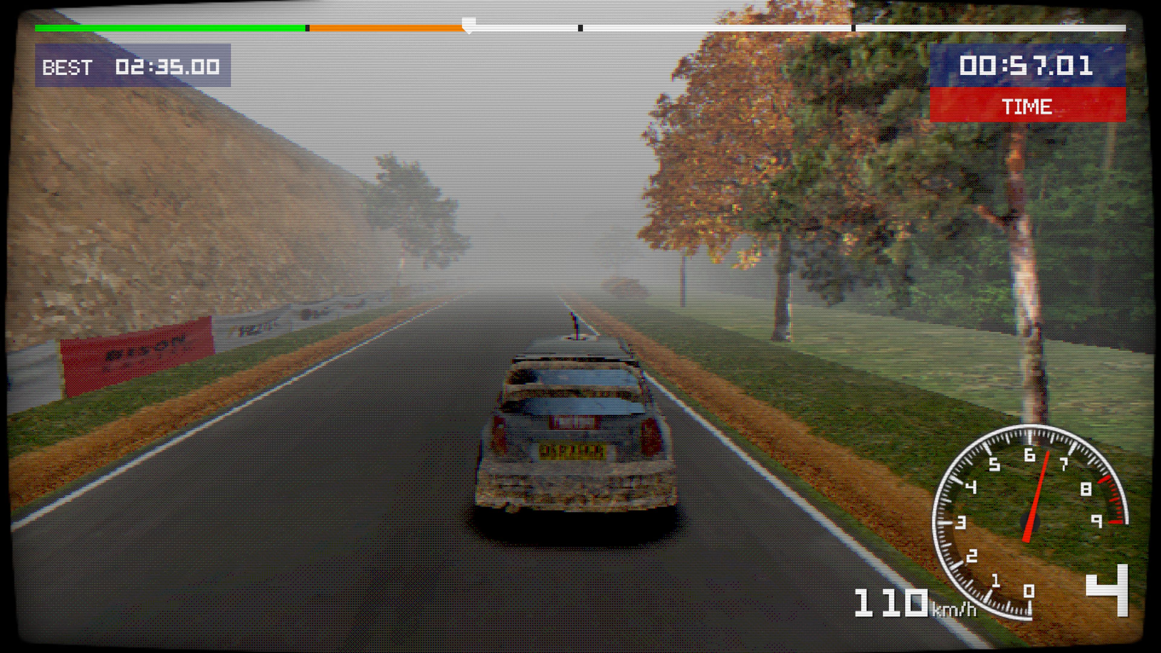 Et c’est certainement chez ce cador du jeu de rallye qu’il faut chercher la principale inspiration de cet Old School Rally, au nom si évocateur, développé par Frozen Lake Games. Un studio méconnu à qui l’on doit déjà deux anecdotiques jeux de voiture rappelant plutôt les formules de jeux Nes et Master System, ainsi qu’un Red Dead-like sans grande prétention, tous trois étant originellement pensés pour le marché mobile. Ce qui cantonnait à une ambition bien moindre, cela va sans dire, qu’un Old School Rally sortant sur consoles Sony et Nintendo ainsi que sur PC. Même si l’on regrettera qu’il faille se contenter de textes en anglais. Notez d’ailleurs qu’on reste étrangement dans une gamme de prix que ne renierait pas un Google Play Store. Comptez 19,99 sur consoles, et 9,75 euros sur Steam.