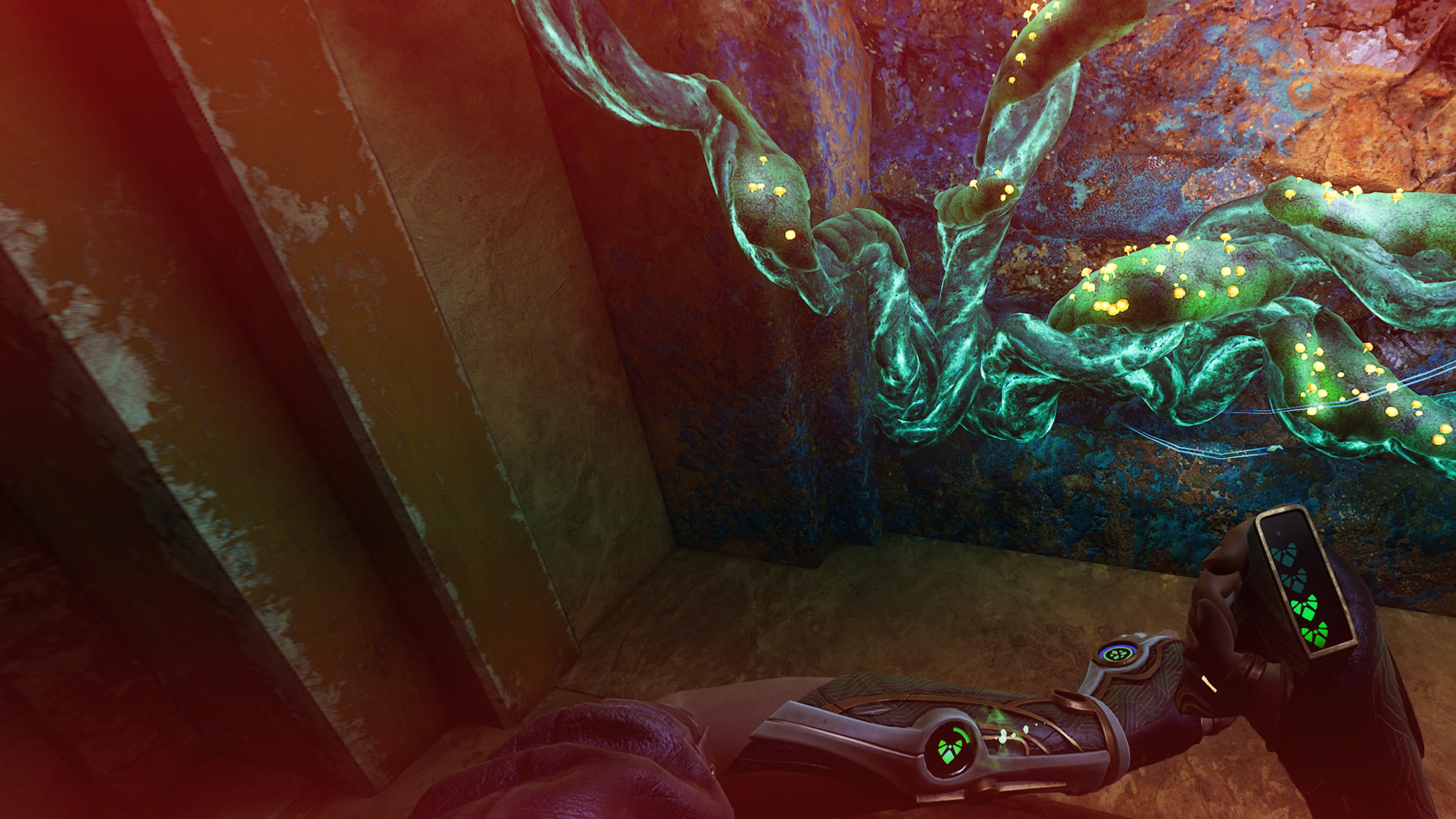 Toutefois, le soft trouve le bon équilibre avec un côté organique saisissant. Que ce soit dans les munitions à aller récupérer dans des cocons jusqu’au système de soin, tout est bien ficelé. D’ailleurs pour se soigner, il faudra récolter des champignons qui rempliront un appareil qu’il faudra ensuite utiliser comme une seringue sur votre bras gauche. Des mécaniques classiques d’un jeu VR, qui sont utilisées intelligemment dans les améliorations de Rosa. En parcourant les niveaux, vous trouverez des statues qui vous donneront des améliorations secondaires ou primaires, en coordination avec la narration. Vous obtiendrez soit des éléments dictés par la narration, ou bien des upgrades comme un peu plus de vie, ou la possibilité d’emporter un peu plus de soins sur vous. Une feature qui fonctionne, et Reach aurait dû en faire plus sur ce point.