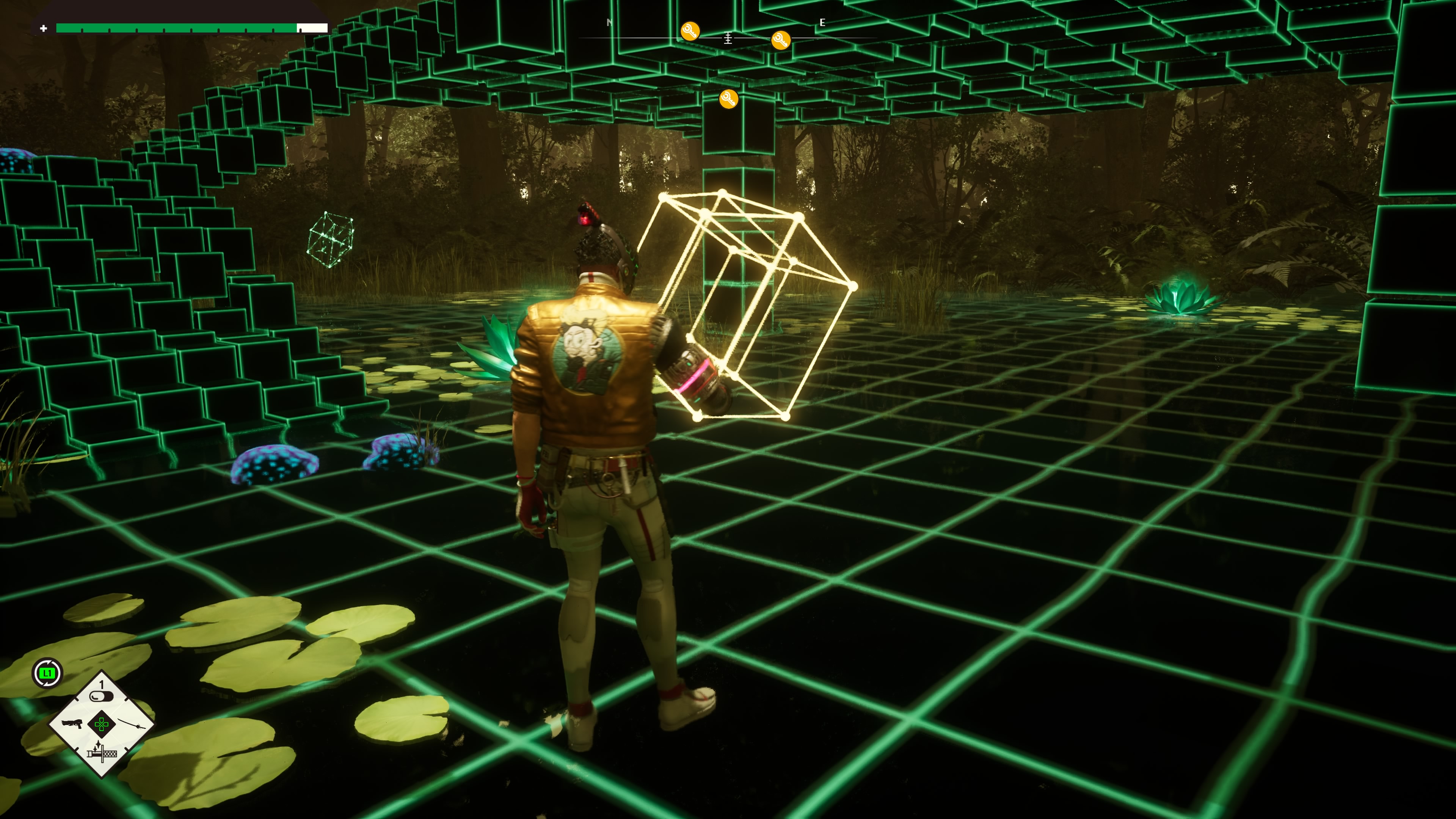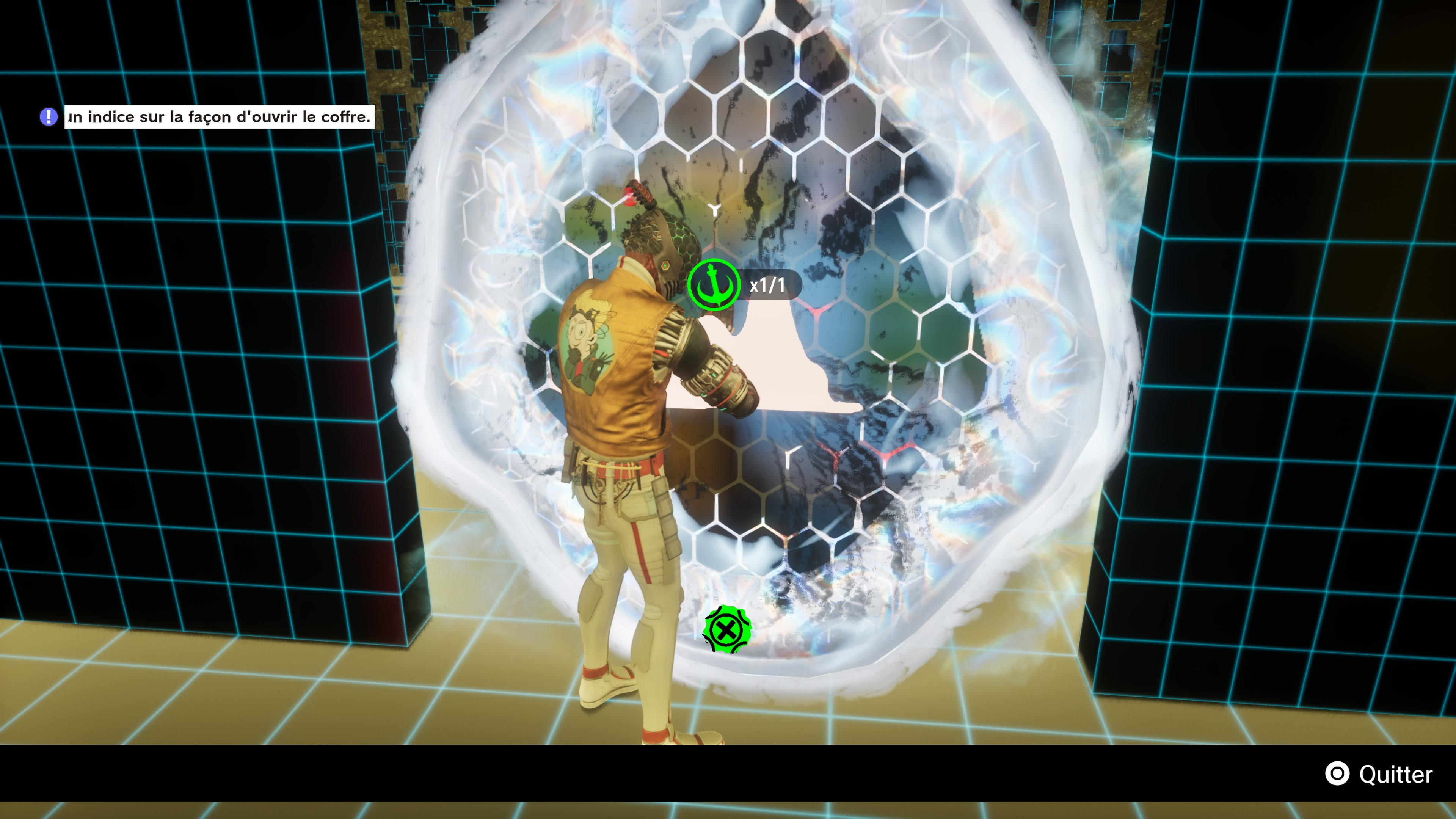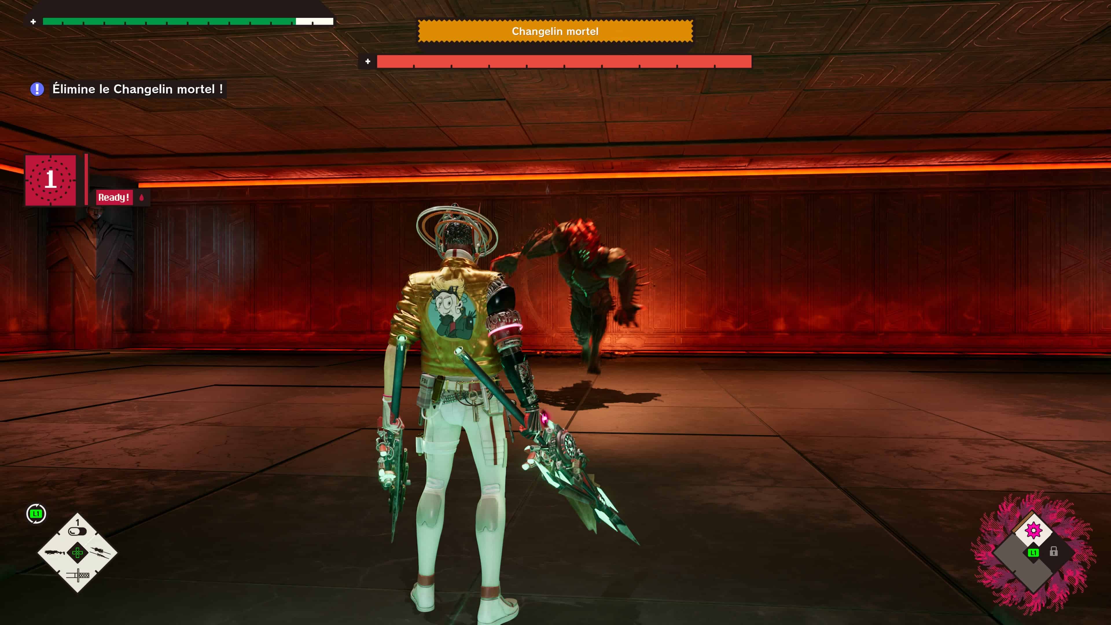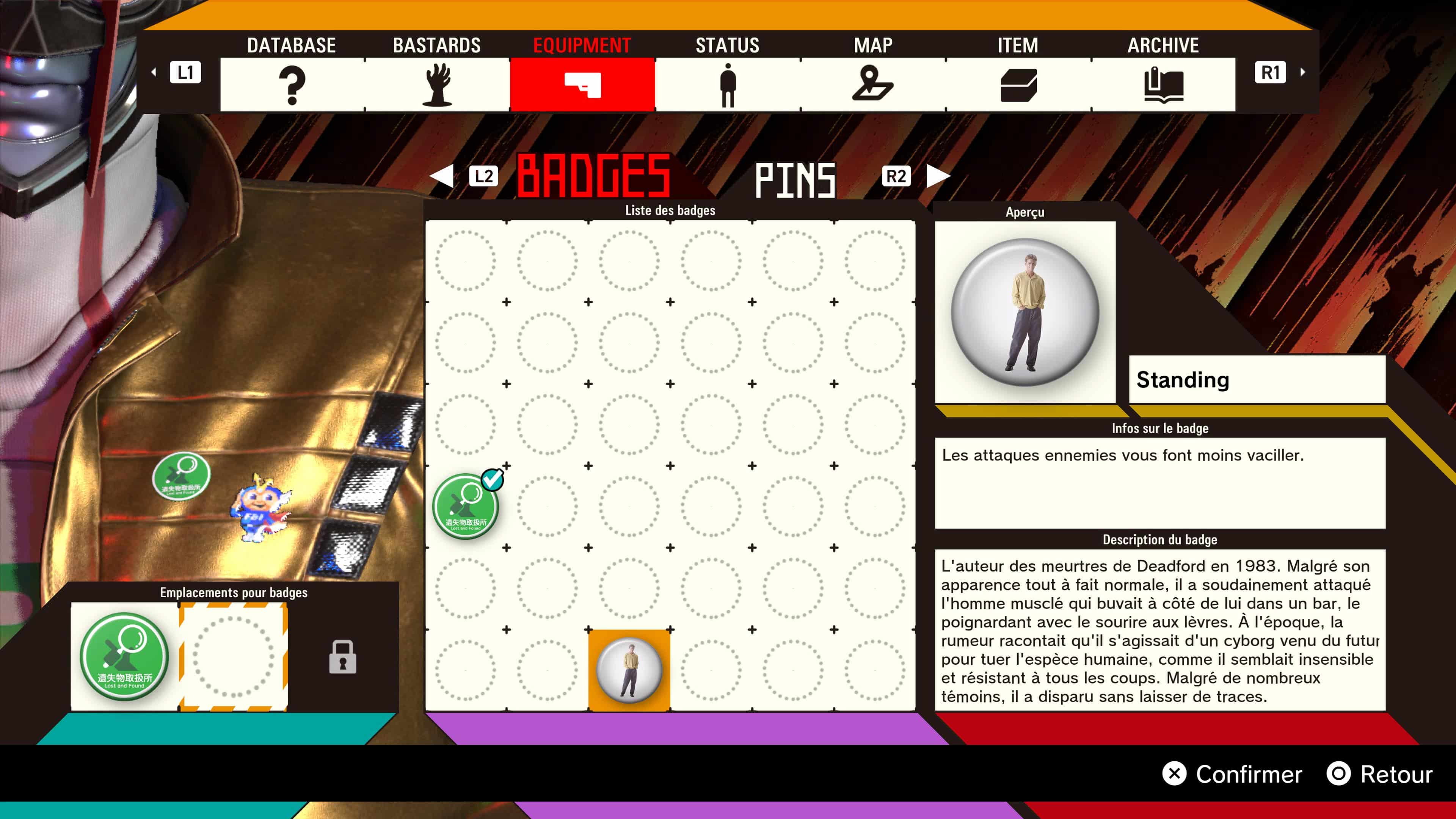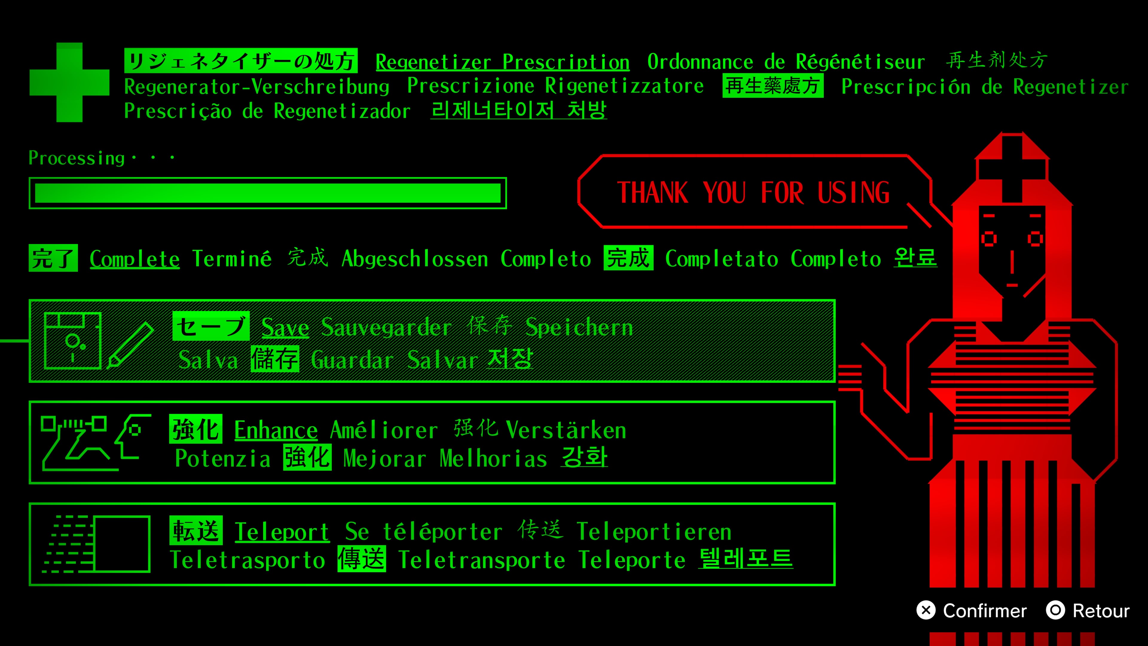 Reste ensuite les phases en pixel art de Romeo is a Dead Man, parvenant à apporter une légère dose de fraicheur. Ces séquences de jeu arrivent principalement quand vous vous promenez à bord de votre QG, soit le vaisseau Last Night. Dans ce dernier, vous pouvez dans un premier temps aller dans une boutique spécifique, où il est possible d’acheter des éléments pour concocter des plats voire des badges, qui donnent des bonus à votre héros quand vous les équipez. Tout ceci s’achète avec de la fluomasse émeraude, que vous pouvez dénicher principalement dans les niveaux ou en décimant vos adversaires. C’est simpliste, mais efficace.