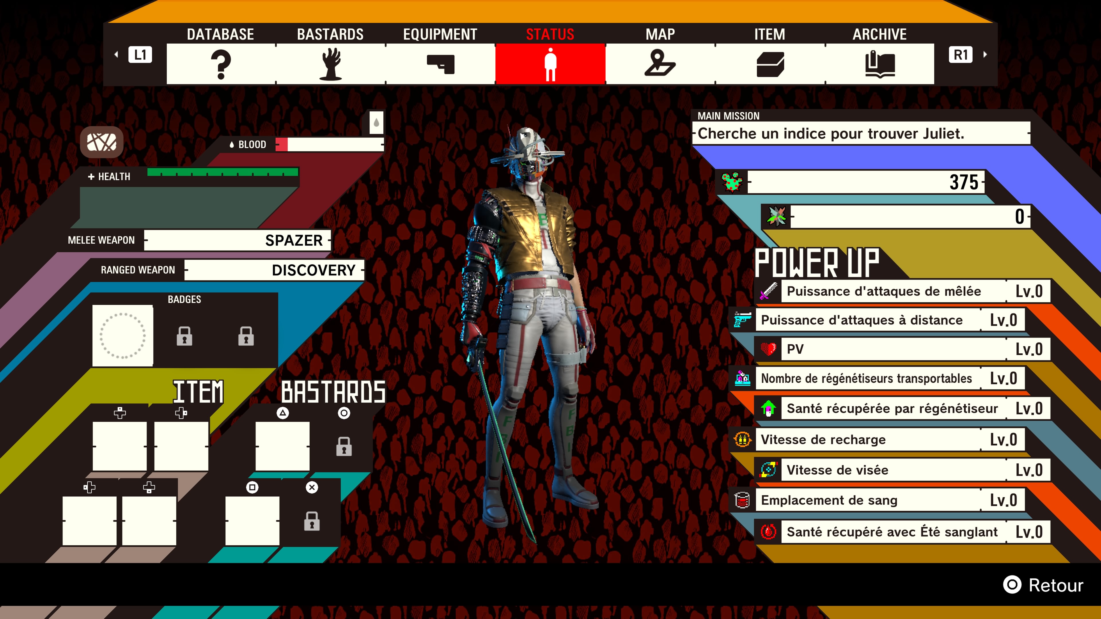 Concernant l’amélioration de votre arsenal, vous devrez utiliser de la cristallite pour les faire monter en niveau et statistiques. Cela sera pour améliorer son absorption de sang, son été sanglant, son attaque normale ou destructrice. D’ailleurs, sachez que vous devrez au début débloquer toutes vos armes, afin de les améliorer ensuite. Outre ce système générique et peu inventif, vous aurez à disposition un pistolet laser, un bazooka, une mitrailleuse ainsi qu’un fusil à pompe. Côté arme blanche, vous bénéficierez d’une katana, une arme lourde, de corps à corps ainsi que de deux lames à la porter moyenne. Il faudra dire que dans l’ensemble, Romeo is a Dead Man offre quelque chose d’assez banal, et sans jamais se démarquer à part les badges et l’utilisation des bâtards.