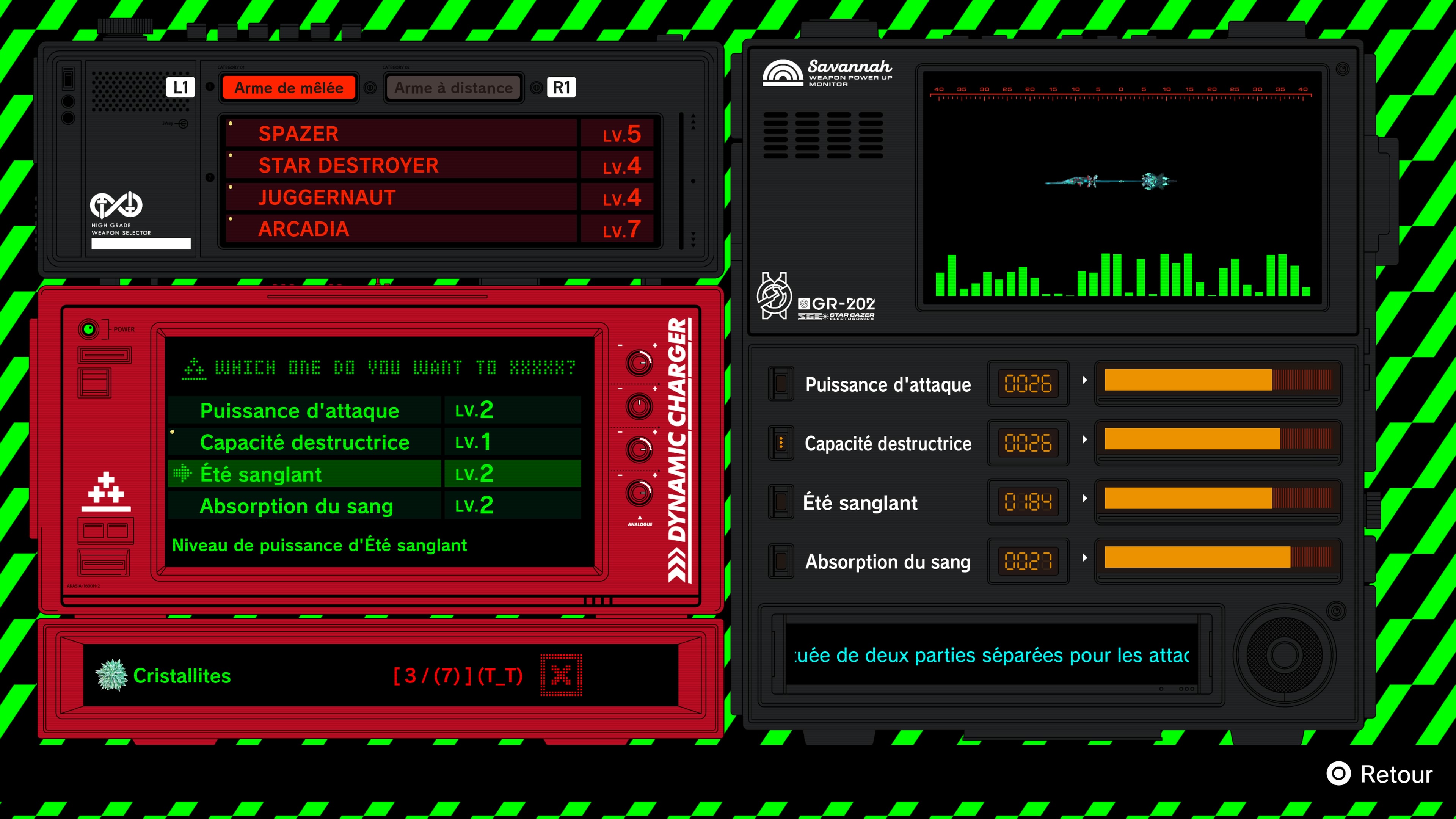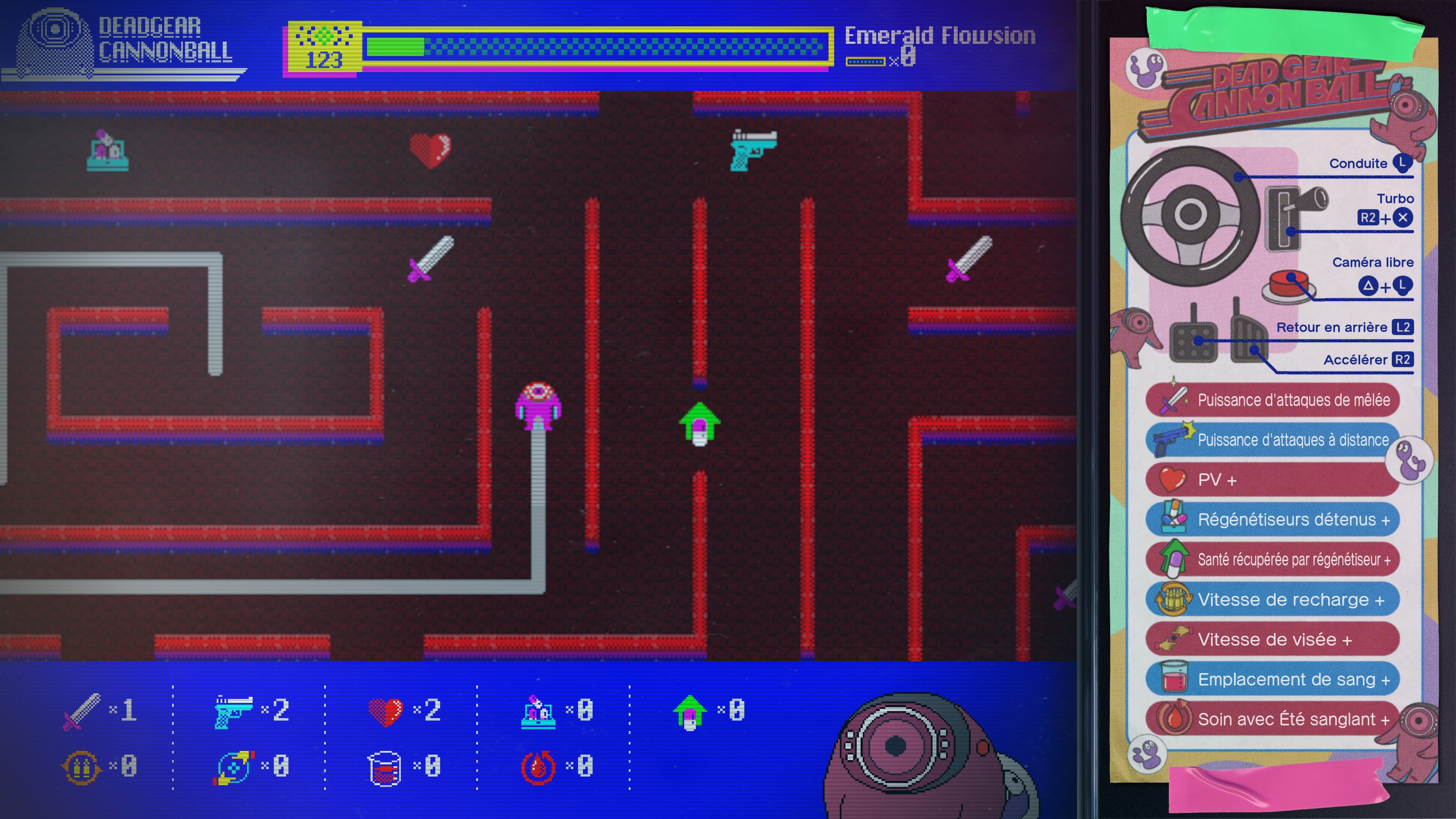 Dans les autres choses à faire dans ce vaisseau, vous pourrez accéder directement à l’amélioration de votre personnage et l’amélioration de ses armes. Pour le premier, vous allez améliorer Roméo via un petit mini jeu nommé Deadgear Canonball, prenant la forme d’un labyrinthe où il faudra avancer sur les icônes indiquées pour bénéficier de l’amélioration désirée (plus de dégâts en attaque basique ou arme à feu, bonus de rechargement, plus de sang récolté pour l’été sanglant voire plus de santé etc.). Pour ce faire, vous devrez utiliser votre fluomasse émeraude durement récoltée pour faire avancer le bougre. Voilà clairement une petite mécanique interactive sympa, et qui upgradera votre personnage.