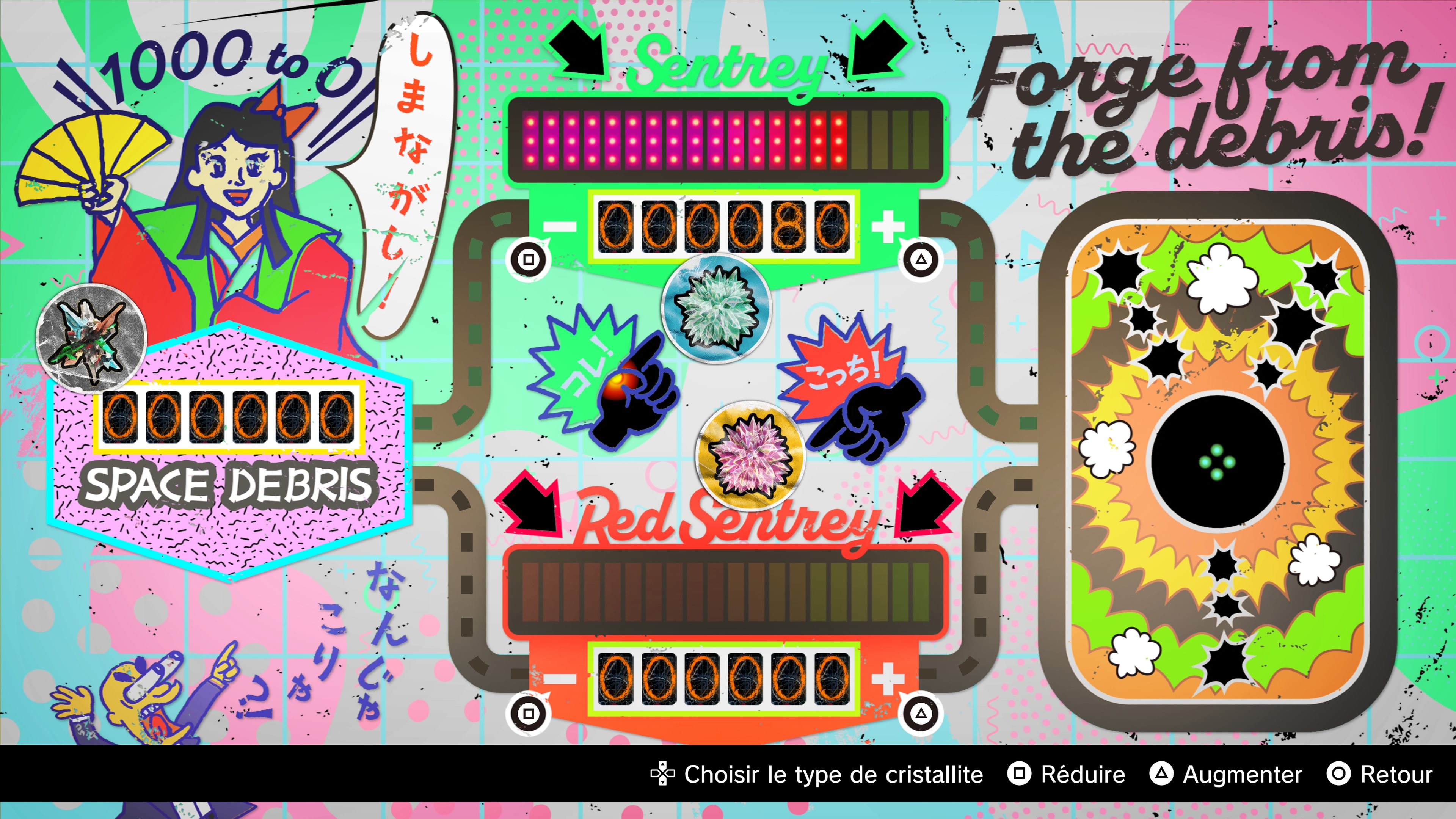 Sous la forme d’une map à rails, car vous pouvez sélectionner la zone ou aller et mettre les gaz vers la direction souhaitée, vous pouvez aussi attraper avec un viseur lors de votre vadrouille, quelques débris. Ces derniers peuvent être justement utilisé pour générer de la critallite verte ou rouge, qui vont servir à donner un coup de boost à vos armes. Qui plus est, vous pourrez accéder en plus des niveaux, à des donjons. Se nommant tous Palace Athène, ces derniers vont vous proposer de parcourir diverses salles, et y affronter mini-boss et ennemis en tout genre. La finalité sera de récupérer des récompenses plus ou moins importantes en fonction de la difficulté comme des badges à bonus, mais aussi de la cristallite en grande quantité. Au premier abord plaisants en guise de contenu annexe, ces donjons s’avèrent vite répétitifs, et n’apportent pas plus de plus value que ça sur la longueur. Encore un élément secondaire sous-exploité comme ces phases en vaisseau, finalement limitée comme la plupart des activités sur le Last Night.
