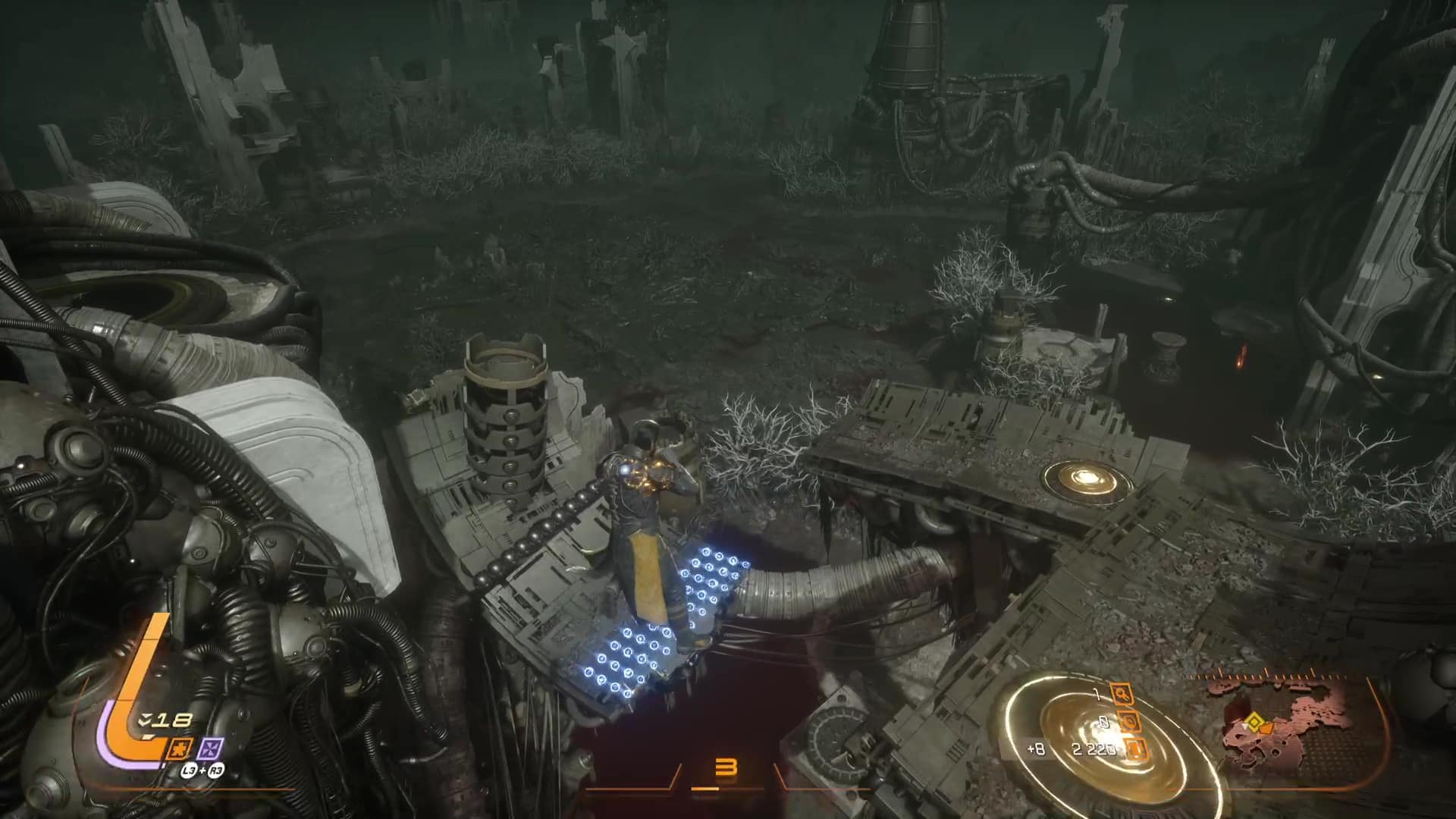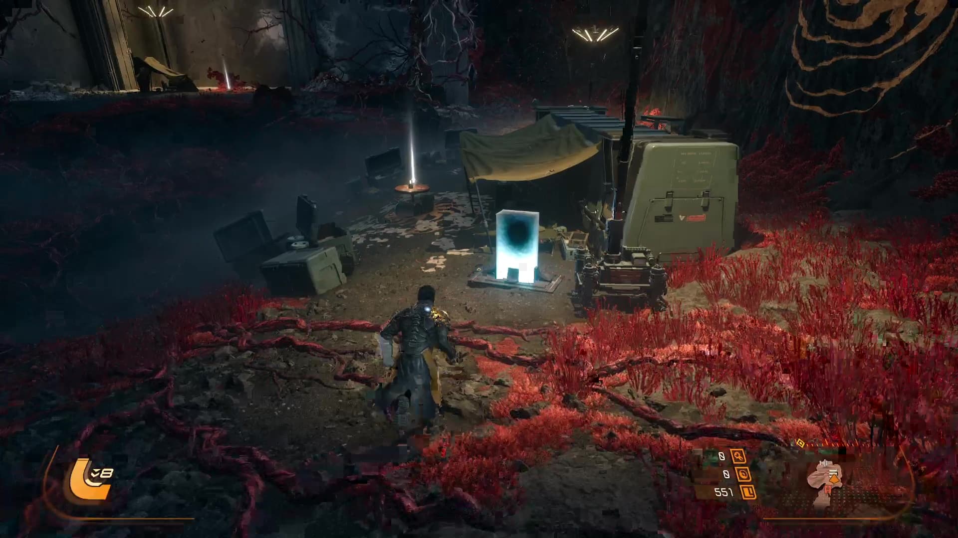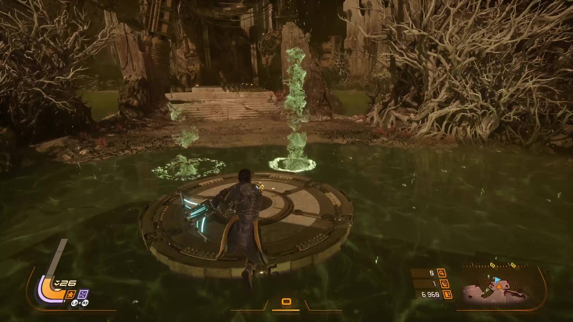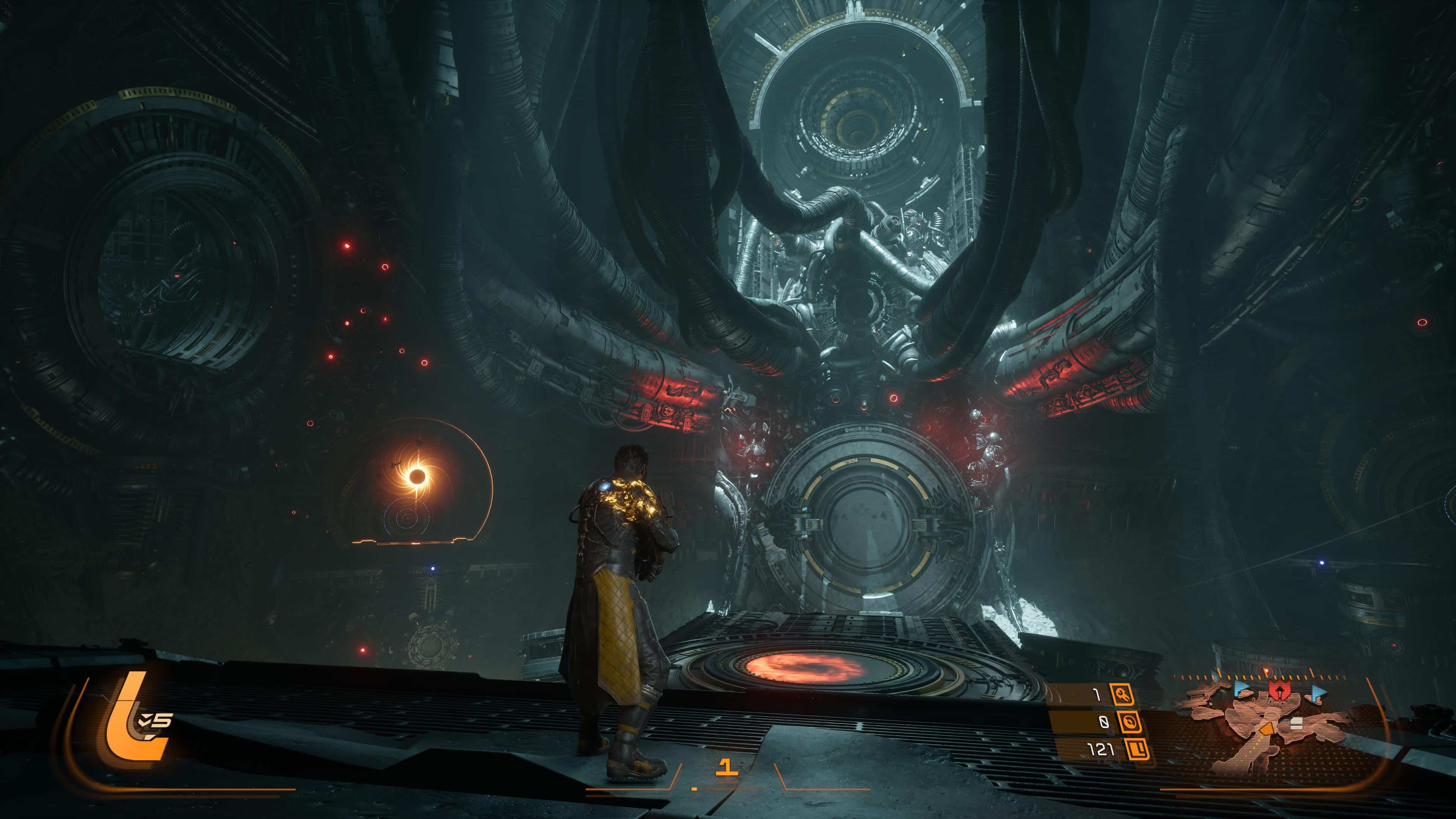 Un souci atténué par des patchs et surtout définitivement chassé ici par Saros. Hormis dans le cadre d’un combat de boss, il est possible à tout moment de suspendre le cycle et revenir plus tard. Une bénédiction pour celles et ceux ne pouvant se lancer que dans de courtes sessions, à mettre aux côtés d’un système de voyage rapide depuis le hub du jeu, le Passage. En atteignant un nouveau biome, on débloque en effet un téléporteur permettant d’y revenir directement. Une mécanique toute bête dit comme ça mais plus souple et instantanée que son prédécesseur.