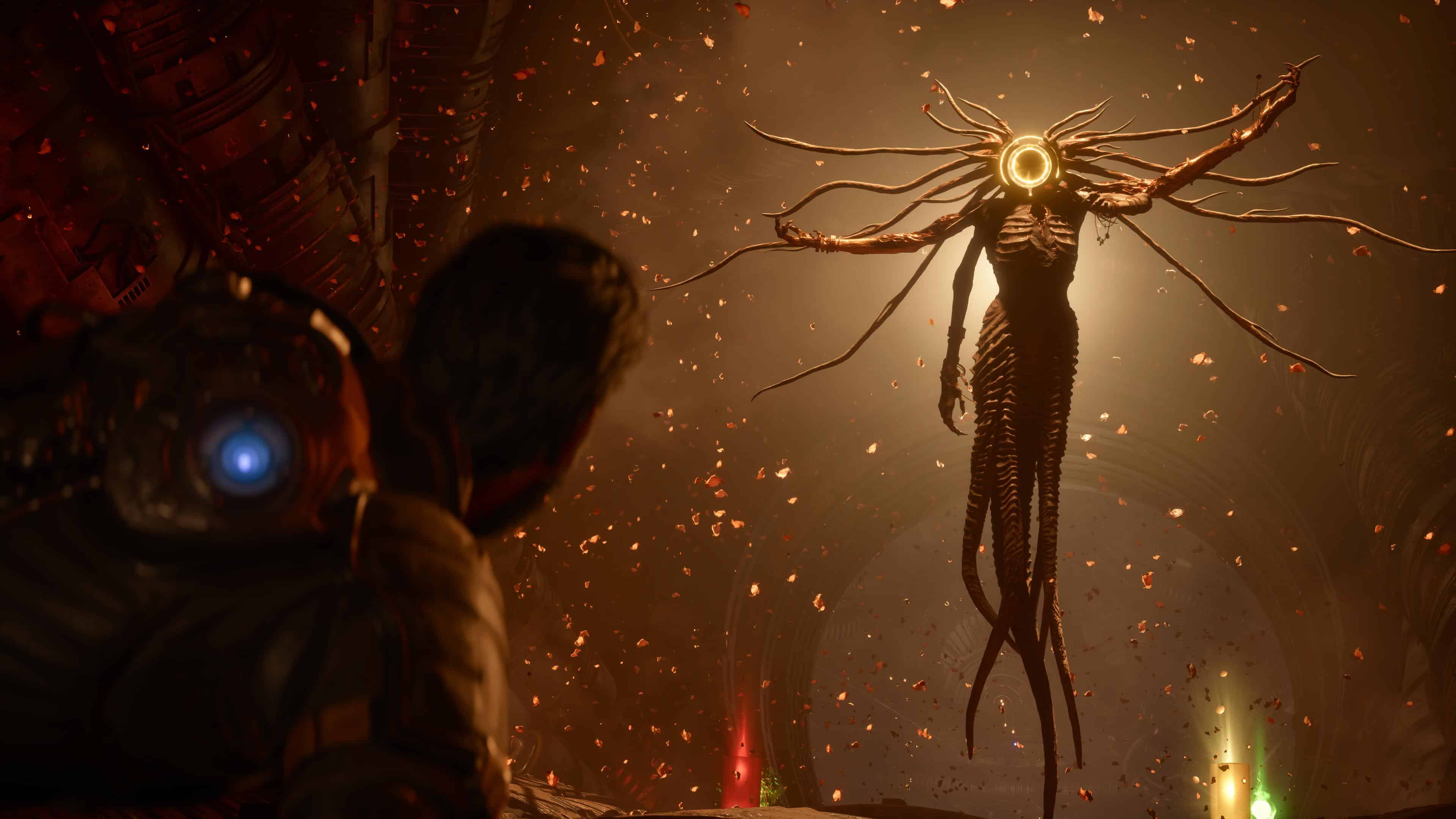 En tout cas, la plus grande réussite des environnements de Saros se trouve dans leur capacité à nous faire sentir tout petit. Outre la faune locale et ses autres résidents, ce sont aussi les infrastructures immenses érigées sur Carcosa qui participent à ce sentiment que nous ne sommes pas à notre place. Sentiment amplifié par le déclenchement des éclipses. On l’a déjà mentionné, elles modifient chaque biome en les rendant plus périlleux. Mais la transformation est aussi visuelle puisque la lumière orangée du soleil vient teinter les décors, de quoi livrer un autre cachet avec de surcroit cette épée de Damoclès constamment au-dessus de notre tête.