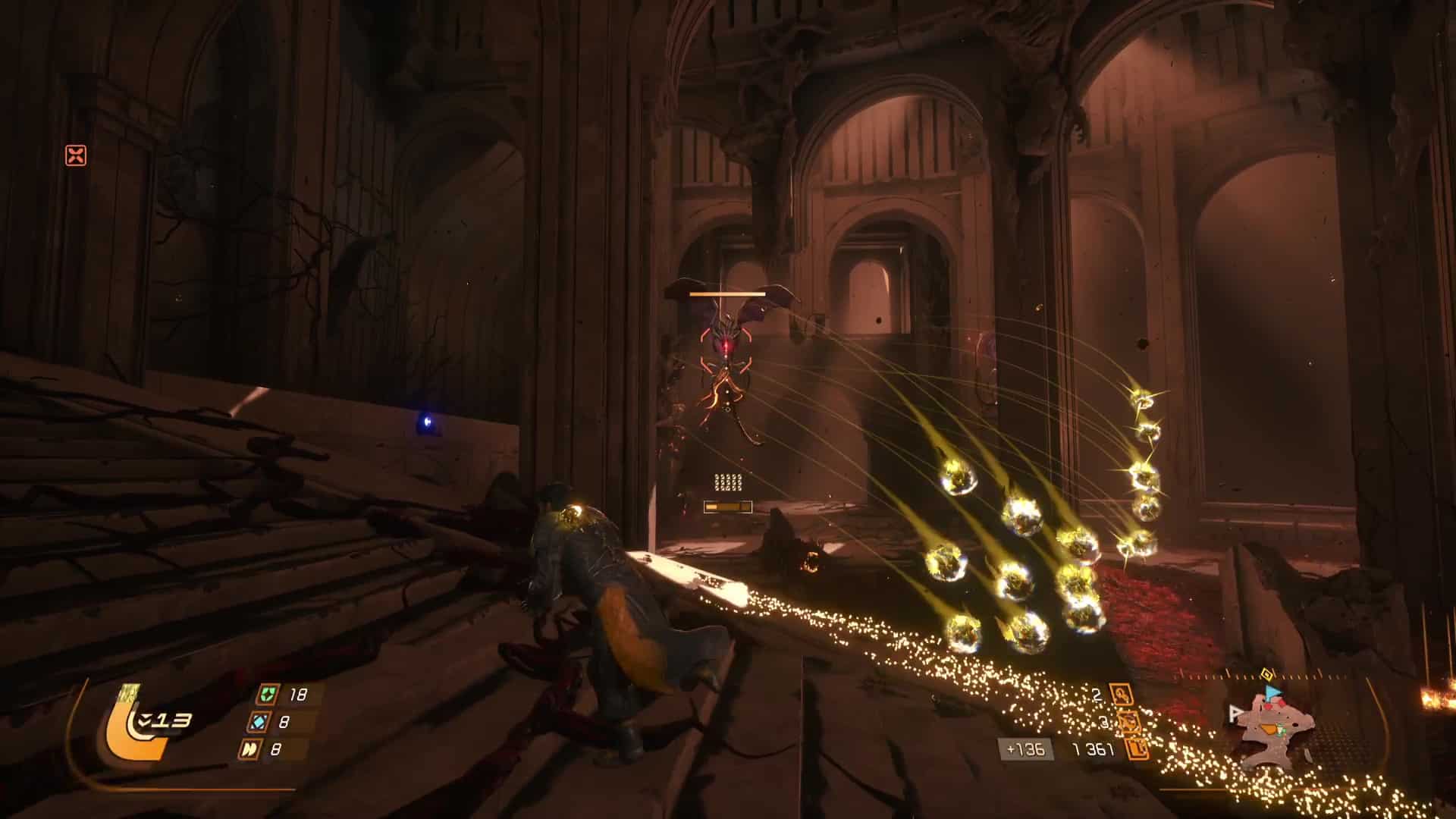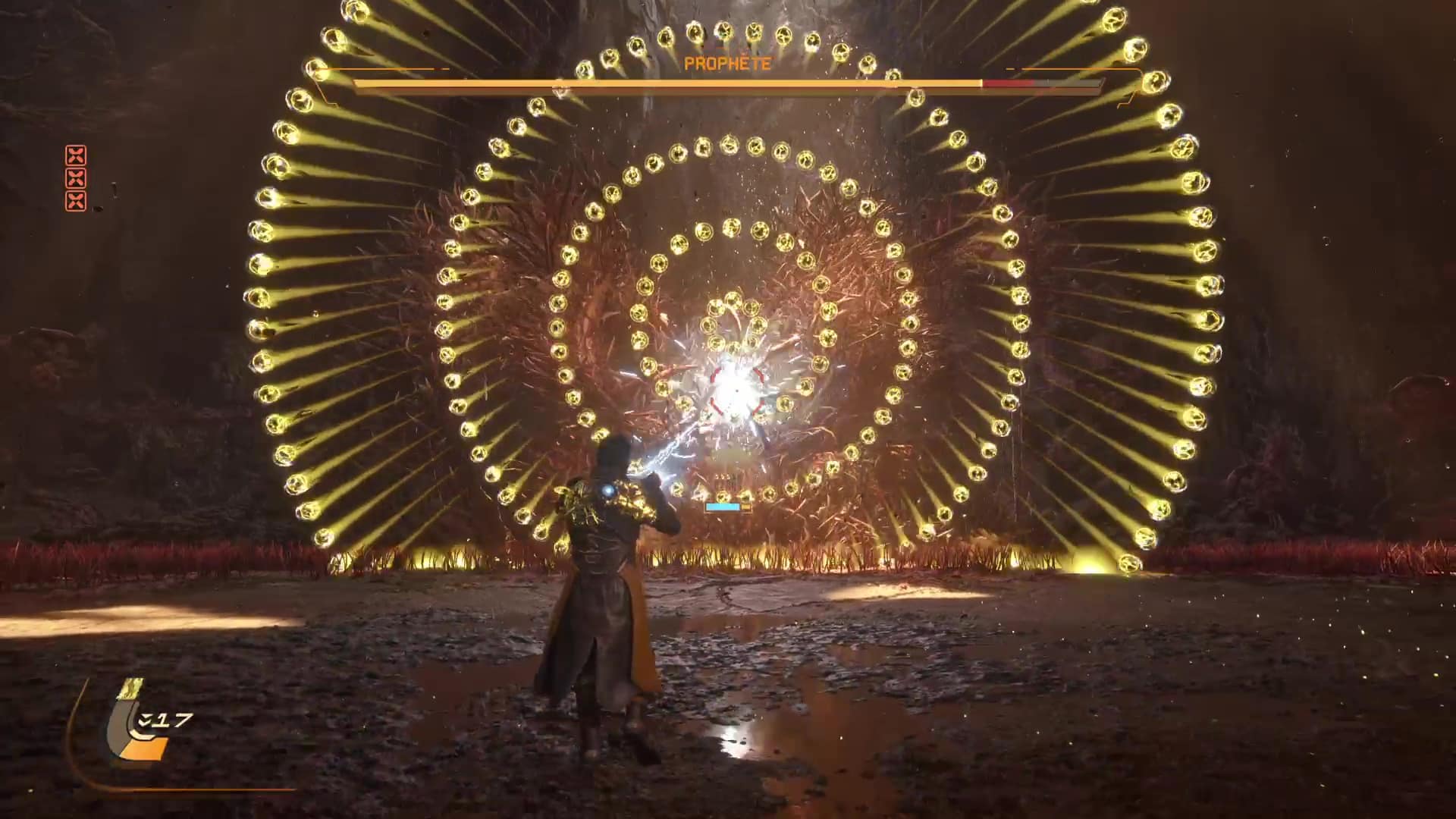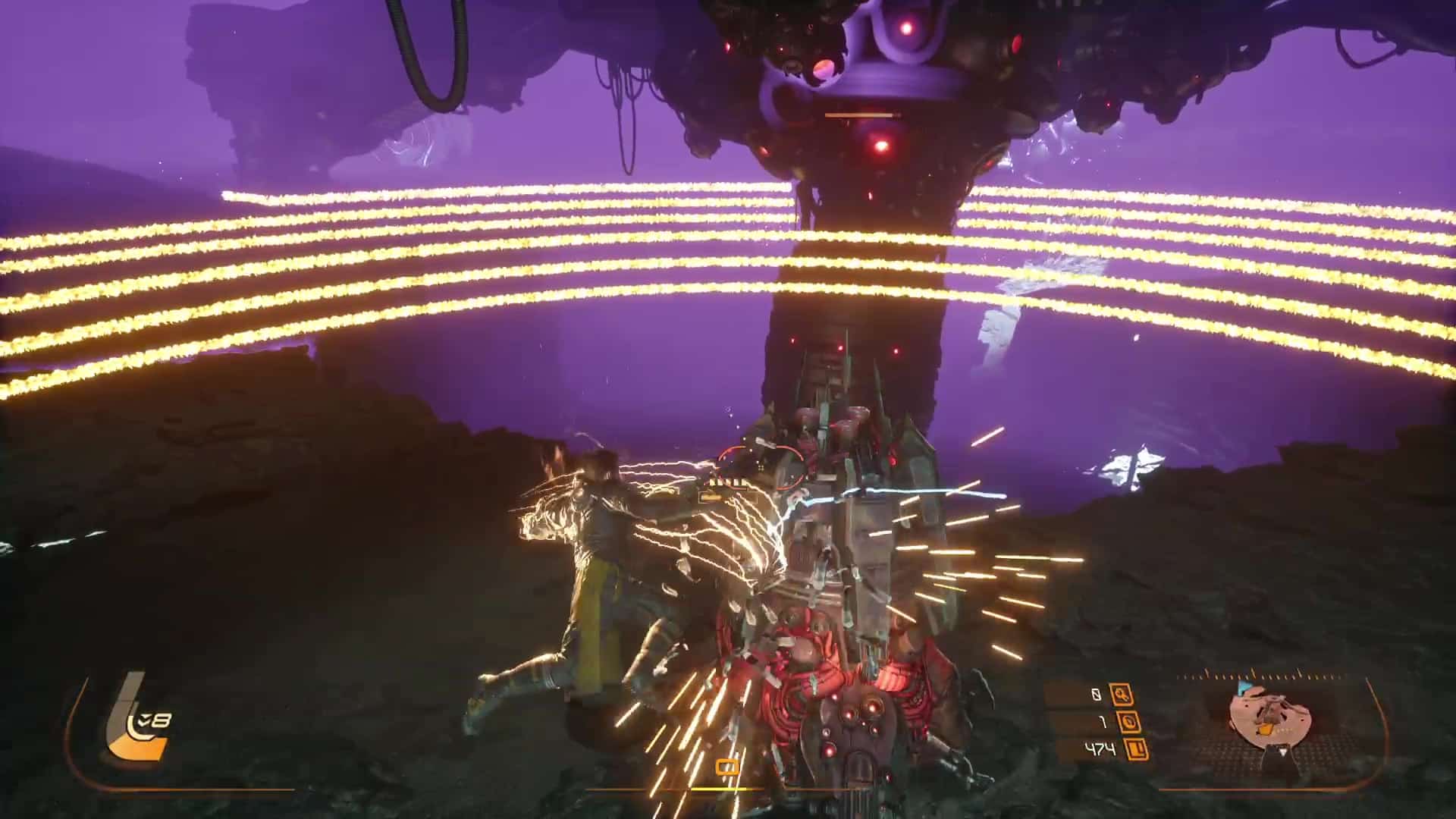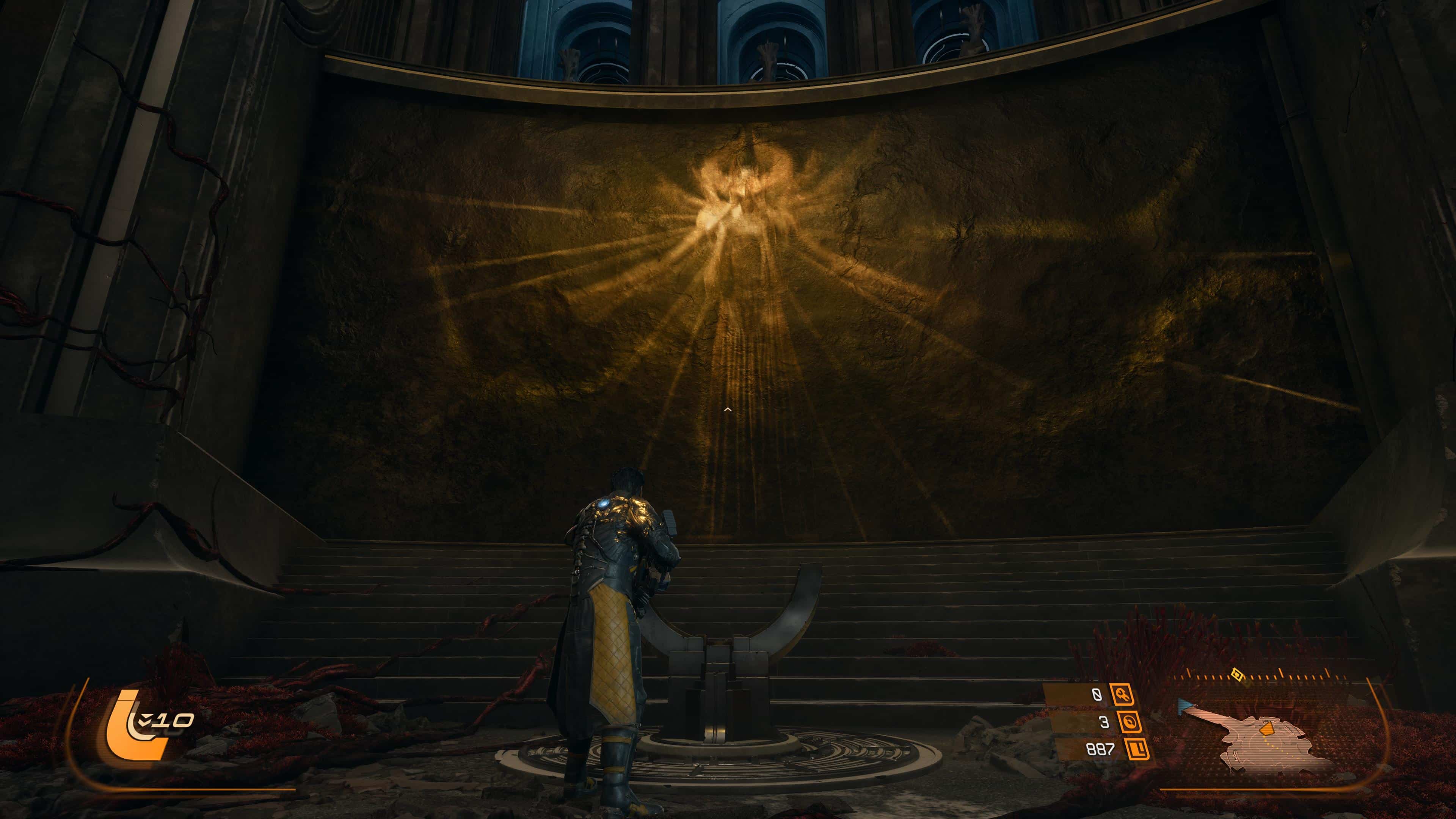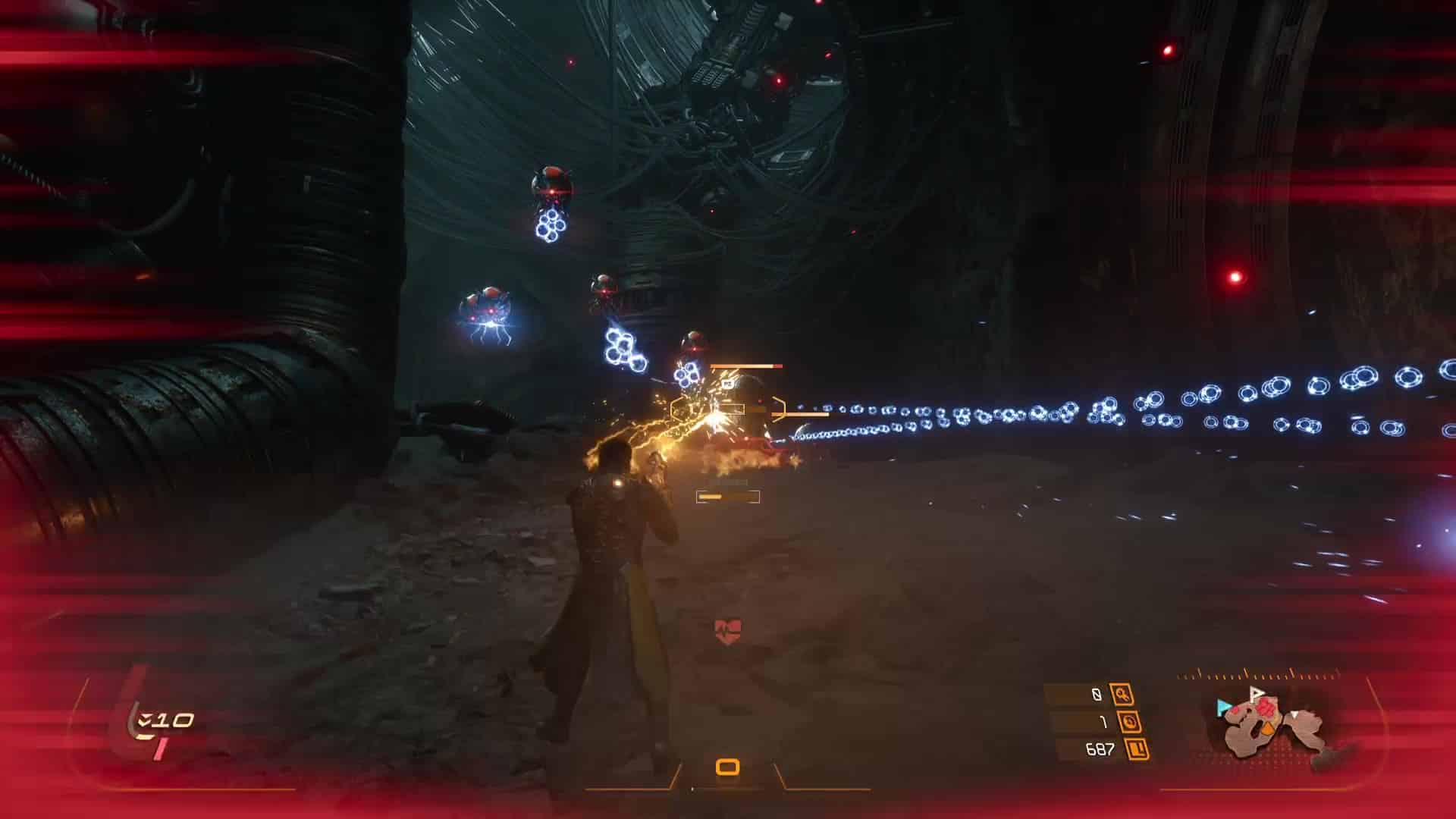 Quant aux projectiles jaunes, ils sont symbole de corruption, et s’ils peuvent être contenus par le bouclier et absorbés, de la corruption va s’accumuler sur la barre de vie d’Arjun, réduisant sa vie maximale. L’esquive via des ruées reste donc une option souvent préférentielle pour survivre en combat, même si l’équipe de développement nous a laissé la possibilité de purifier la corruption accumulée… en utilisant l’arme énergétique. Eh oui, le cycle ne concerne pas que l’éclipse carcosienne, il s’inscrit directement dans la boucle de gameplay.