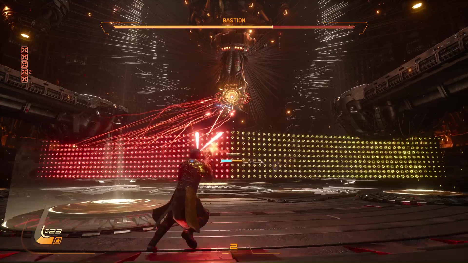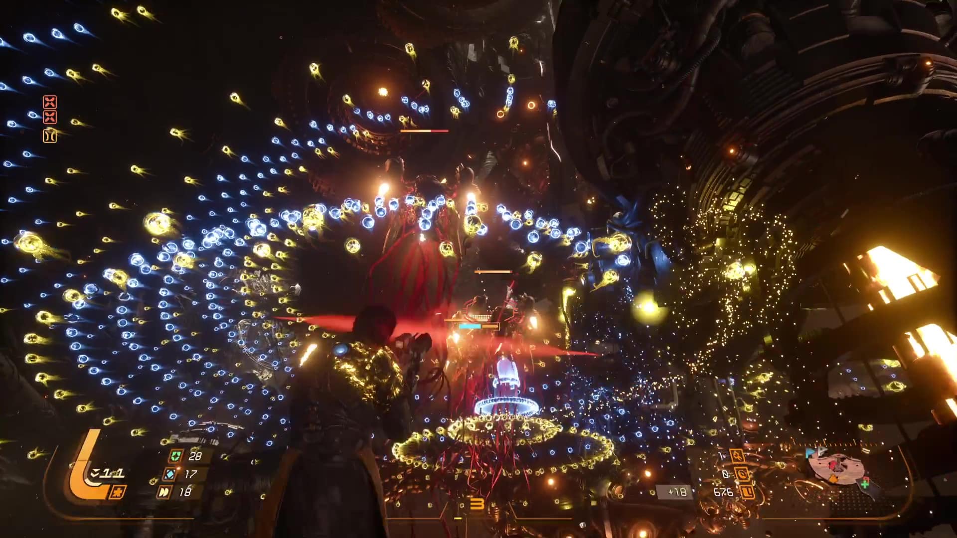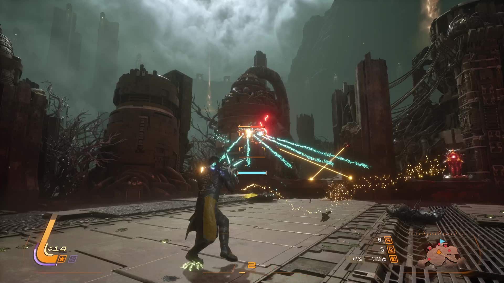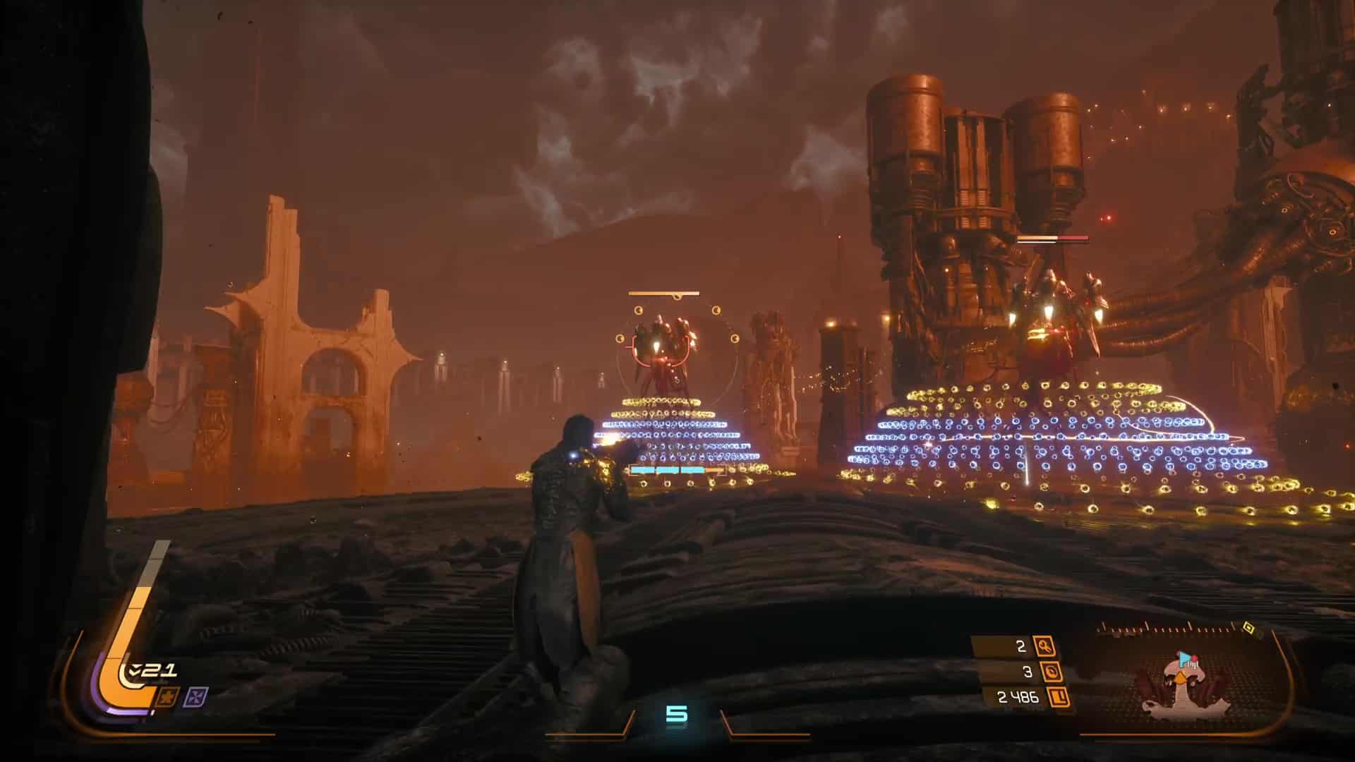 Quant aux projectiles jaunes, ils sont symbole de corruption, et s’ils peuvent être contenus par le bouclier et absorbés, de la corruption va s’accumuler sur la barre de vie d’Arjun, réduisant sa vie maximale. L’esquive via des ruées reste donc une option souvent préférentielle pour survivre en combat, même si l’équipe de développement nous a laissé la possibilité de purifier la corruption accumulée… en utilisant l’arme énergétique. Eh oui, le cycle ne concerne pas que l’éclipse carcosienne, il s’inscrit directement dans la boucle de gameplay.