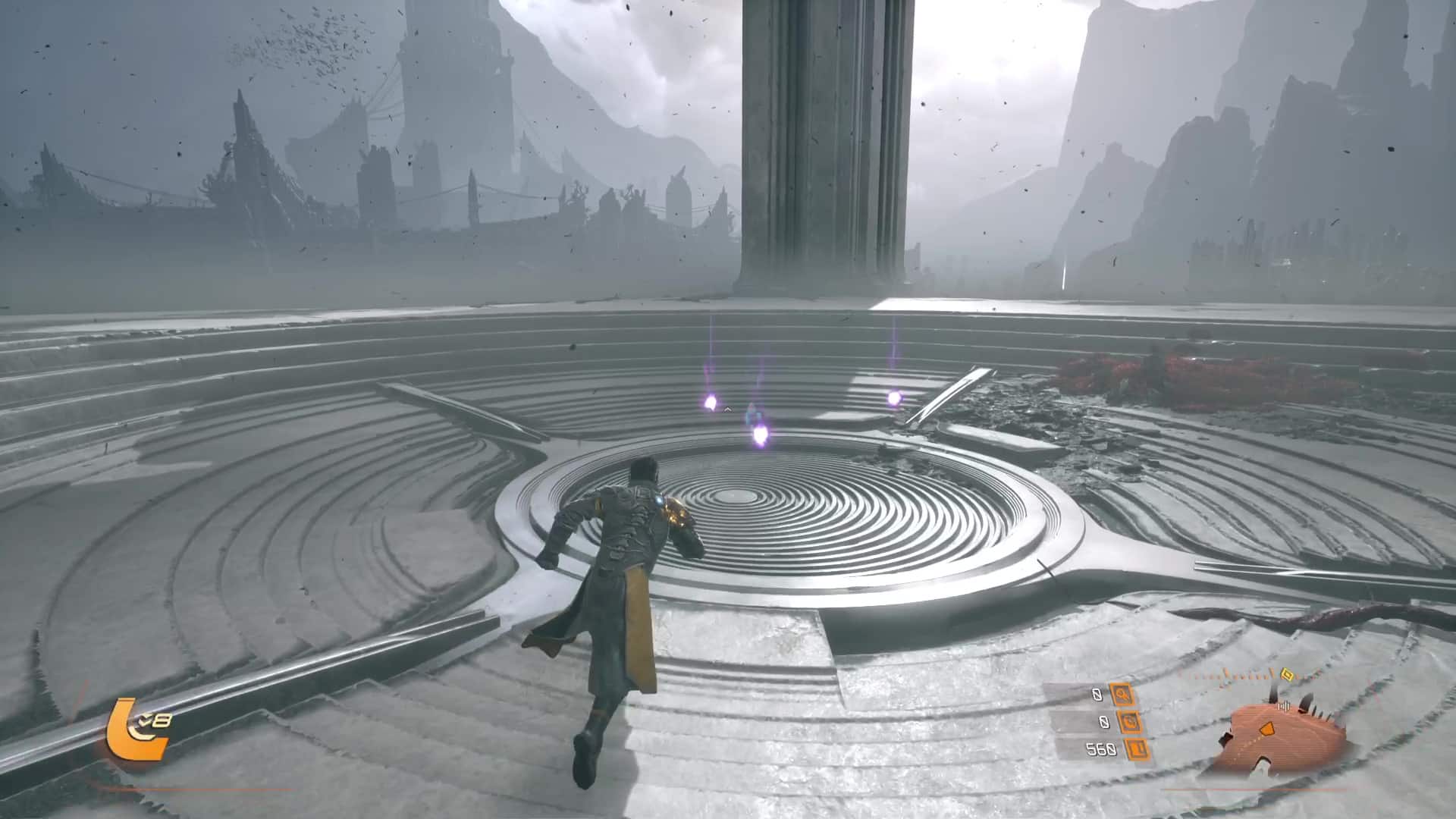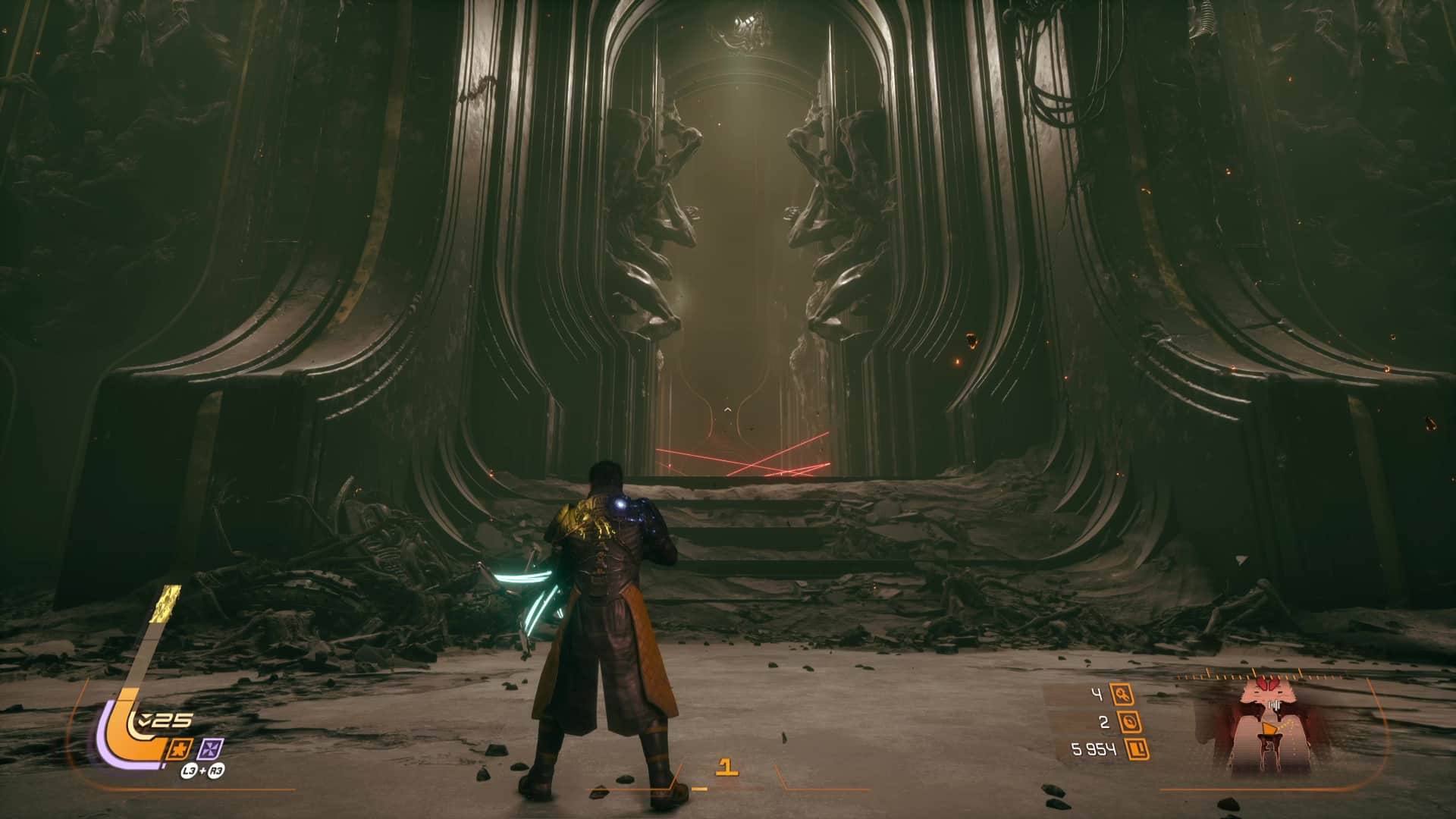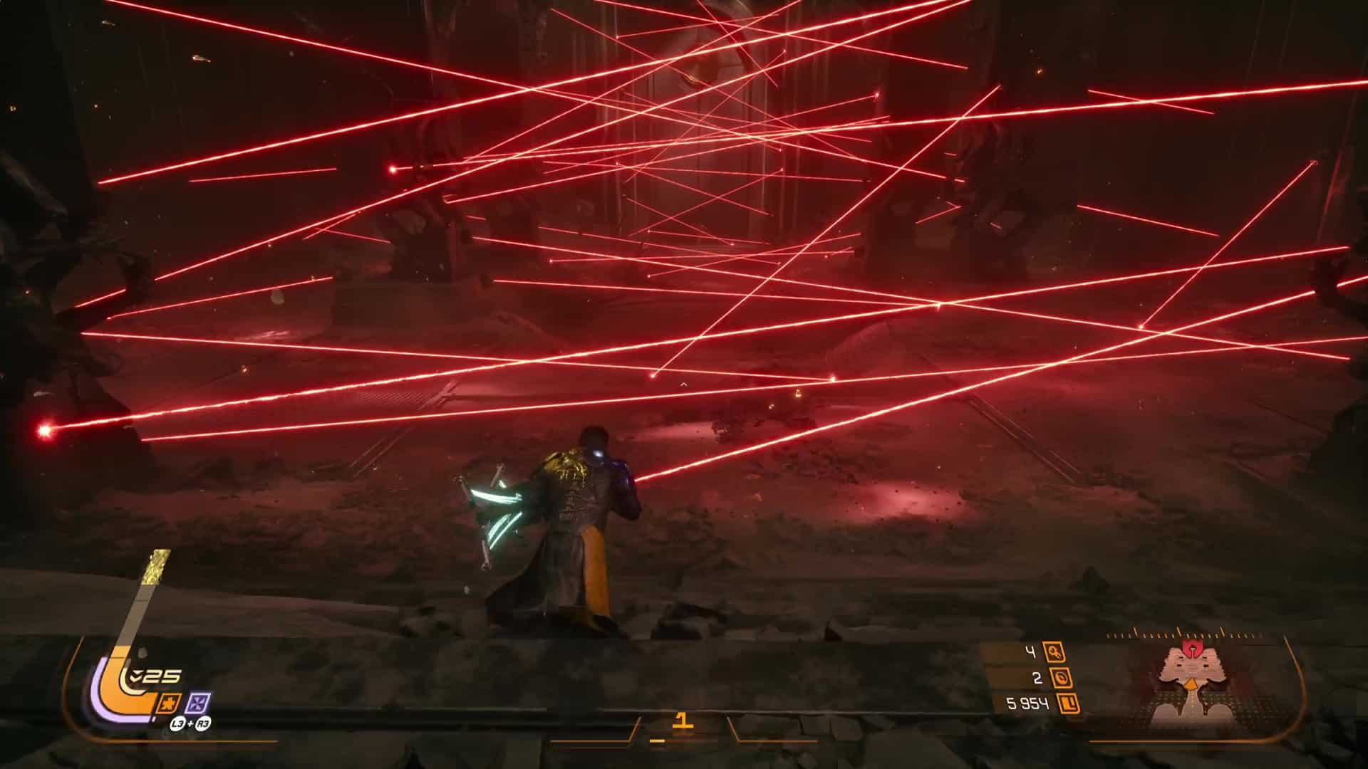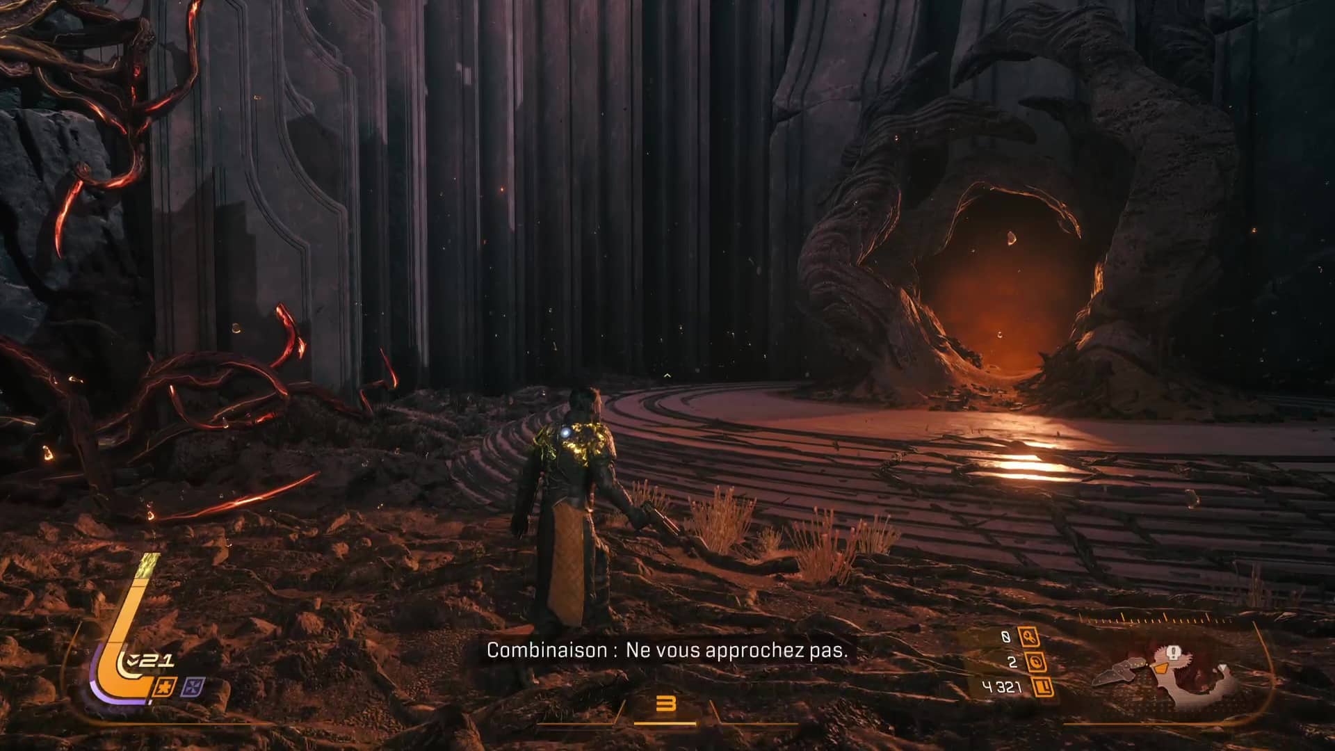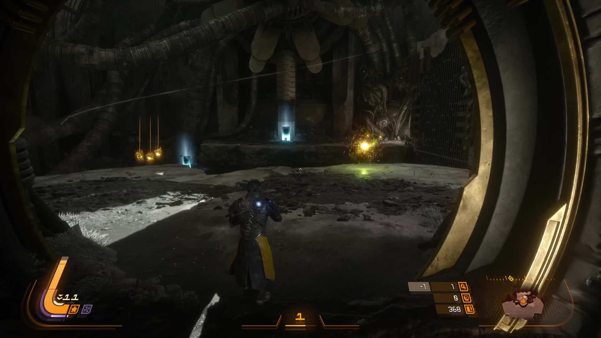 Quant aux projectiles jaunes, ils sont symbole de corruption, et s’ils peuvent être contenus par le bouclier et absorbés, de la corruption va s’accumuler sur la barre de vie d’Arjun, réduisant sa vie maximale. L’esquive via des ruées reste donc une option souvent préférentielle pour survivre en combat, même si l’équipe de développement nous a laissé la possibilité de purifier la corruption accumulée… en utilisant l’arme énergétique. Eh oui, le cycle ne concerne pas que l’éclipse carcosienne, il s’inscrit directement dans la boucle de gameplay.