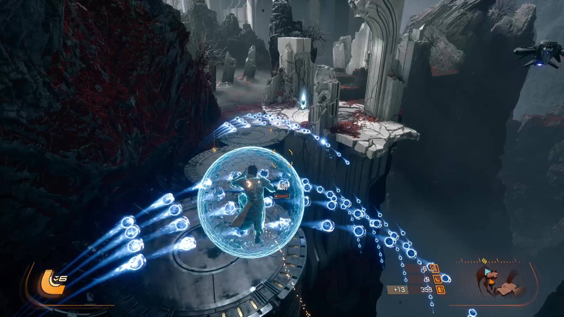 À cela s’ajoute les armes énergétiques capables de réaliser de grandes différences sur le terrain, pour peu que l’on dispose assez d’énergie pour les utiliser, ce qui nous amène à une grande nouveauté de cet opus : le bouclier Soltari. À la pression maintenue de la touche R1, Arjun déploie autour de lui une protection capable d’absorber certains projectiles adverses. Si cet outil semble surtout défensif, il apporte également offensivement puisque les boules absorbées alimentent donc la jauge d’énergie permettant d’utiliser l’arme énergétique équipée.