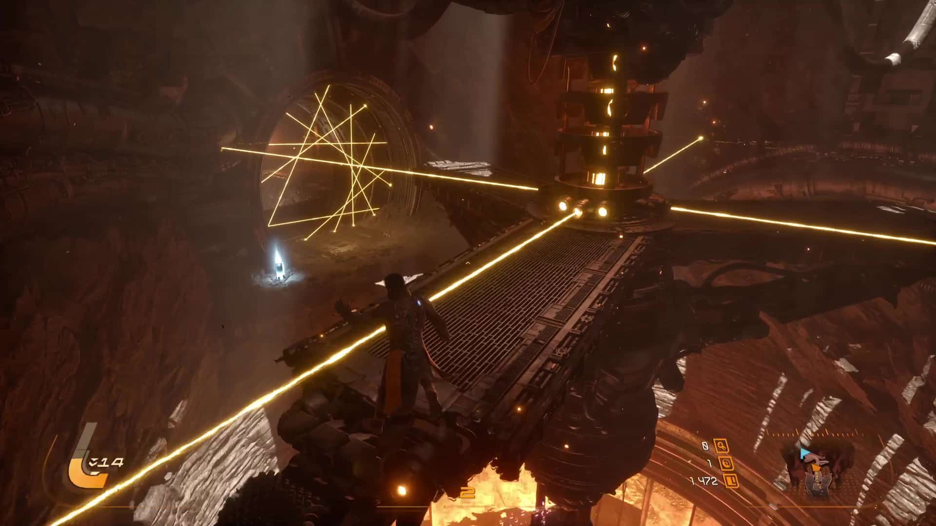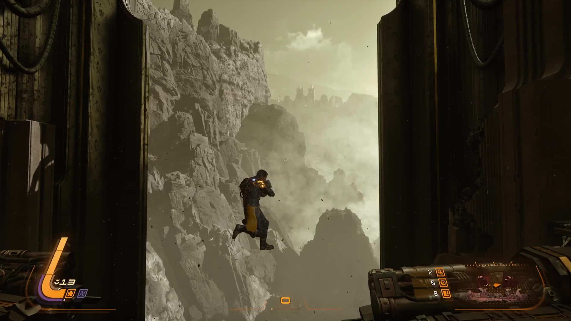 Toujours en intégrant des salles générées procéduralement pour la majorité d’entre elles, aux côtés de zones principales fixes, la planète varie les excursions en extérieur et en intérieur. Tantôt nous arpentons des falaises abruptes, tantôt nous nous enfonçons dans les profondeurs suffocantes de grottes où la technologie minière est omniprésente. Et puis, un autre biome encore tranche significativement avec le reste grâce à ses intérieurs sacrés et le gimmick déroutant bien que gadget de l’inversion de la gravité.