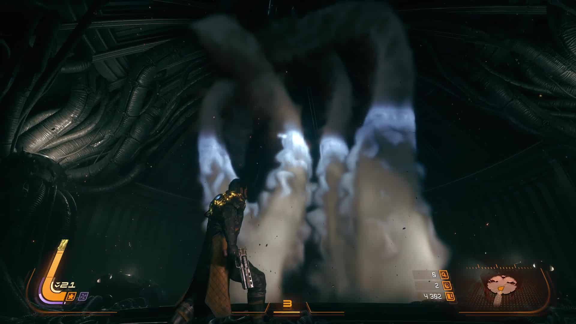 Il est donc plus rapide de retourner se frotter à ce qui a pu nous tuer et de mieux se familiariser avec le biome pour lequel ça pourrait coincer. Et Dieu sait que les menaces sont nombreuses sur Carcosa. Elle se veut comme une planète hostile et on le sent passer. On nous le fait d’ailleurs comprendre dès les premières minutes de jeu car Saros nous livre un tutoriel express intelligent avec en point d’orgue un premier boss façon Soulslike contre lequel il est quasi « normal » de perdre. Les bases de gameplay du jeu sont claires, la température de ses affrontements et de son degré d’exigence goûtés et le tout est condensé en une poignée de minutes, ce qui constitue une parfaite entrée en matière.