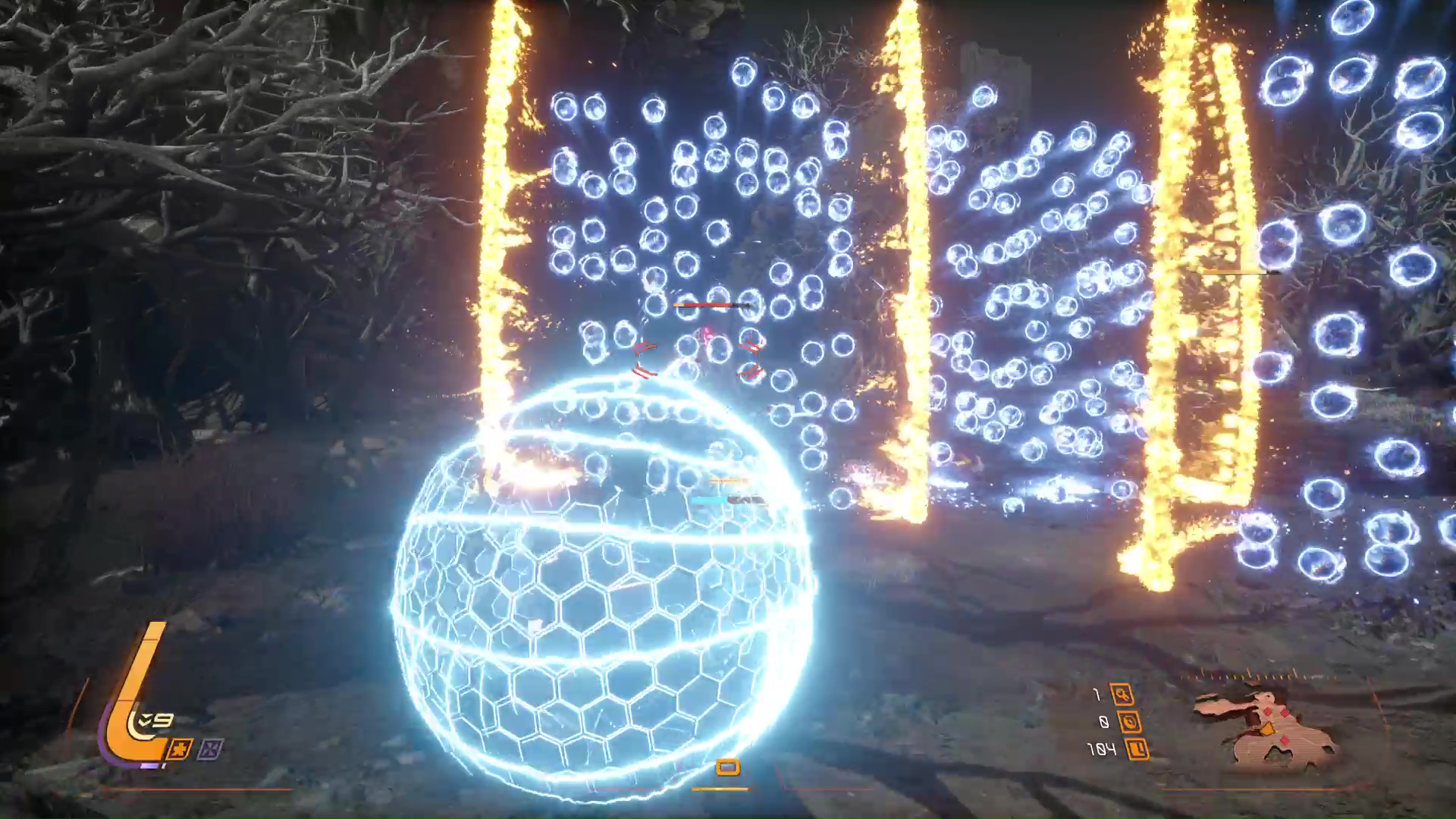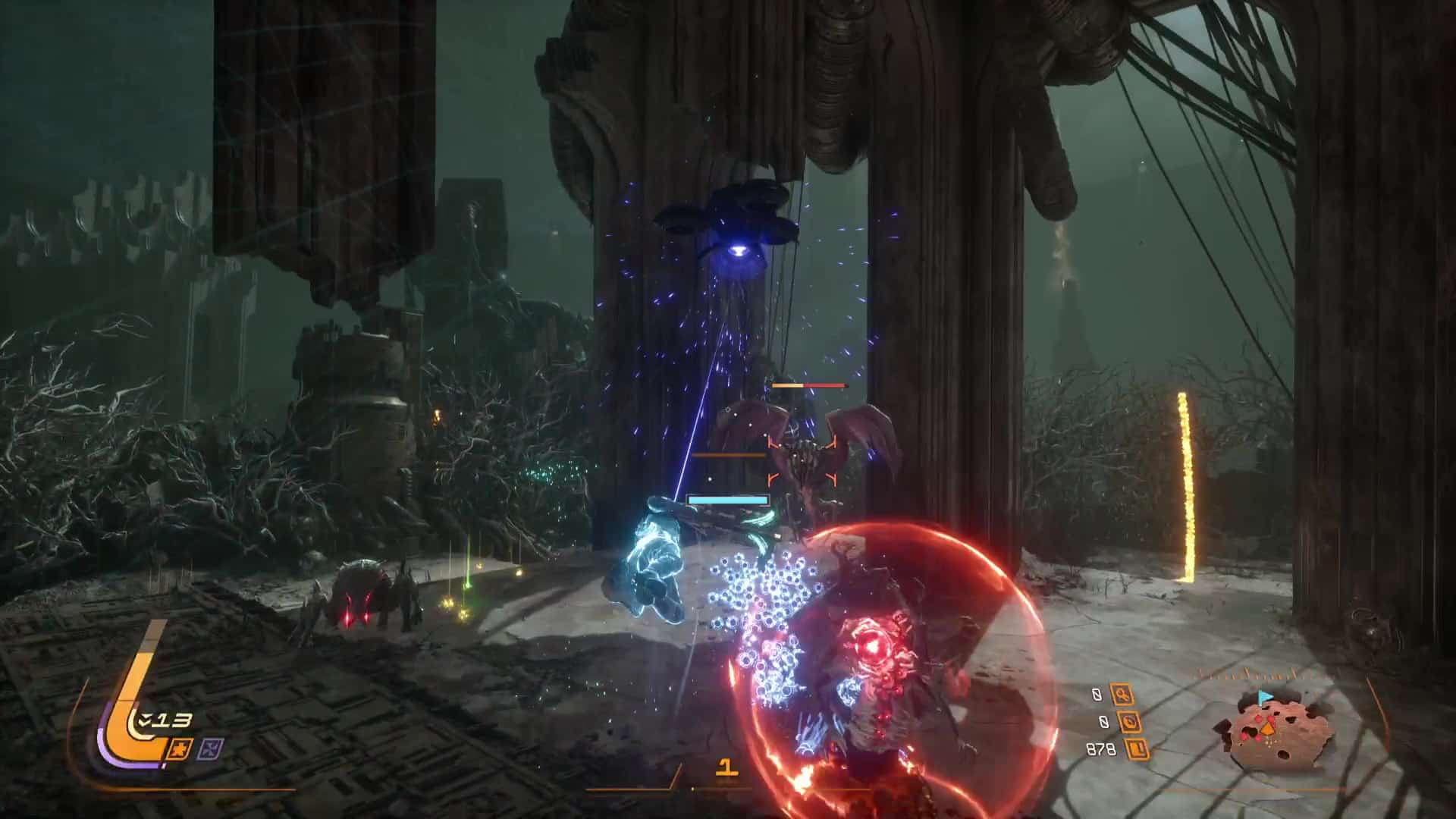Du côté du bestiaire, ça ne manque pas de créatures organiques et mécaniques n’ayant qu’une seule obsession : vouloir notre mort. Evidemment, plus l’ennemi se veut dangereux, plus la palette de projectiles qu’il diffuse est dense et/ou variée, amenant à apprendre par cœur comment chacun fonctionne afin de constamment garder l’avantage en combat. De plus, il arrive que certains ennemis disposent d’un bouclier, ou qu’un pilier de régénération de vie doive être brisé pour pouvoir leur infliger des dégâts, ce qui rajoute du piment aux affrontements en nous obligeant à venir frapper au corps-à-corps.