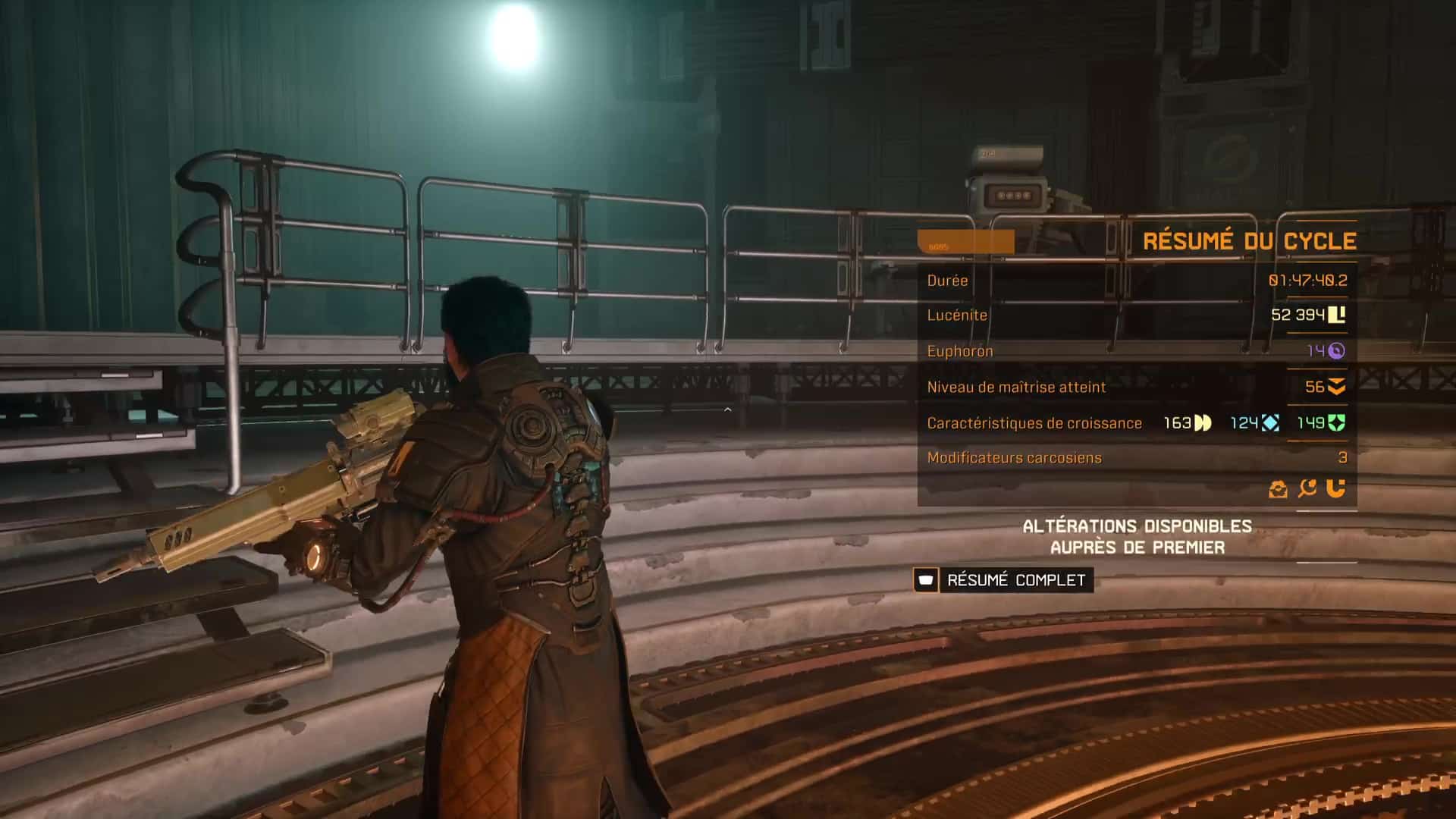 Mais deuxièmement, et c’est ce qui nous intéresse ici, la lucénite ramassée sert à débloquer des cases sur l’arbre de compétences accessible auprès de Premier, l’intelligence artificielle Soltari élisant domicile au Passage. L’euphoron, une ressource bien plus rare et que nous sommes toujours très content de trouver, donne également accès à des bonus encore plus notables. Permettre de faire apparaître plus de soin, débloquer la Seconde chance pour pouvoir ressusciter une fois dans une run, ou encore augmenter le niveau de maîtrise d’arme par défaut sont des marqueurs de progression concrets qui nous réjouit à l’idée d’être les prochaines friandises à débloquer.