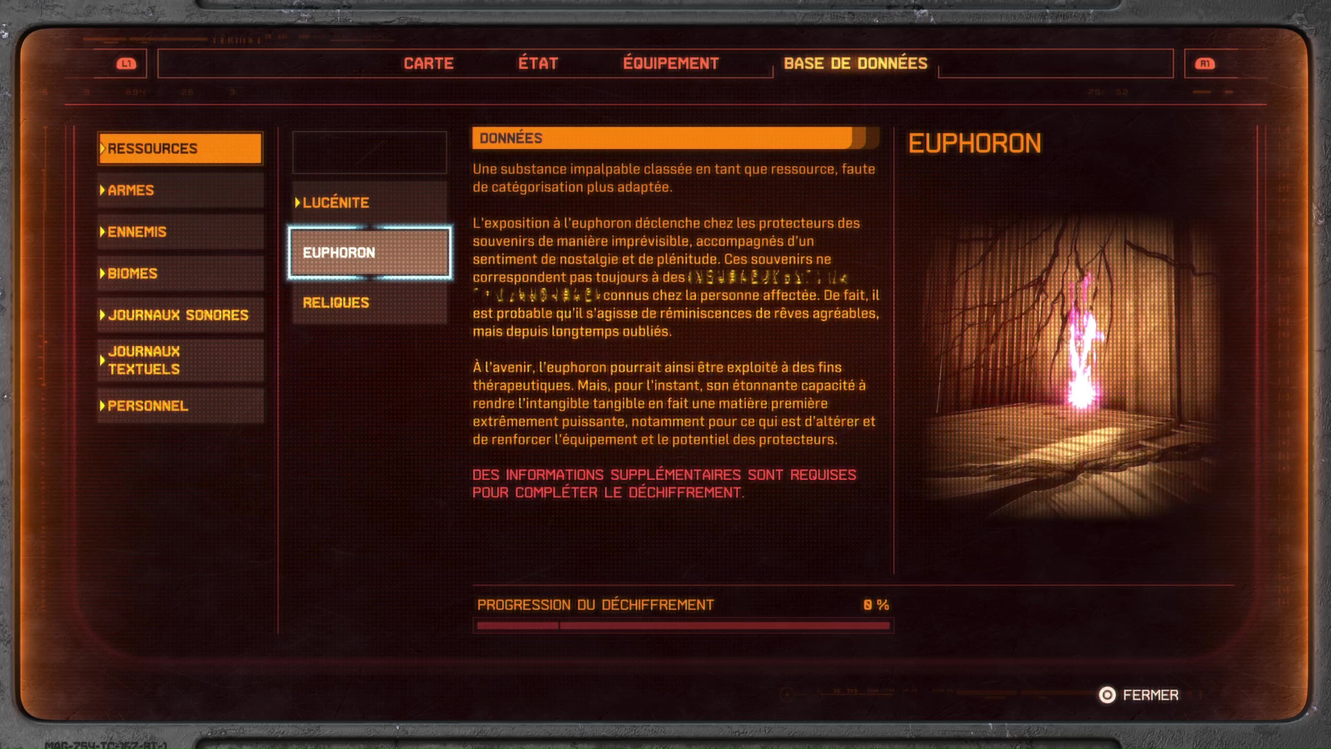 En parlant d’investissement, le bonheur absolu ressenti de A à Z durant une quinzaine-vingtaine d’heures laisse place à un retour à la réalité particulièrement brutal. Une fois l’histoire de Saros terminée à fond, il manque clairement de quoi redonner de l’intérêt concret au jeu. Aucun défi particulier ni quête annexe ou autre one more thing ne vient redonner un coup de fouet au titre. Seul le codex se dévoile pleinement en remplissant à 100% la jauge des armes, pouvoirs, ou objets à force de les utiliser, sauf que le grind, ce n’est pas ce qu’il y a de plus excitant.