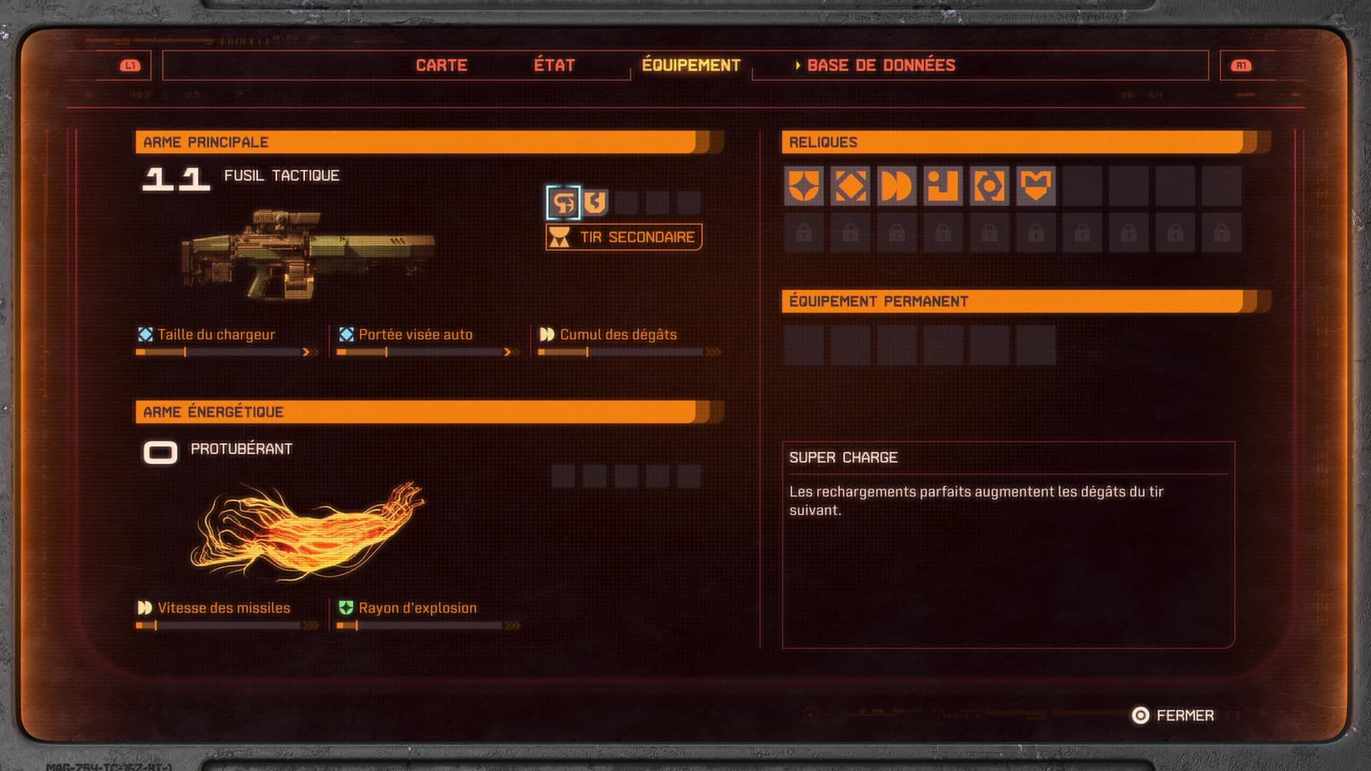 En ouvrant les différents conteneurs disséminés au sein des biomes, il peut arriver de tomber sur des reliques. Chaque relique est justement liée à une des trois caractéristiques, en plus d’offrir un bonus (et parfois un malus) le temps de la session. Choisir de focus une caractéristique a donc non seulement des répercussions sur les armes que l’on va décider de choisir en cours de route, mais plus généralement sur le build global que l’on va se construire.
