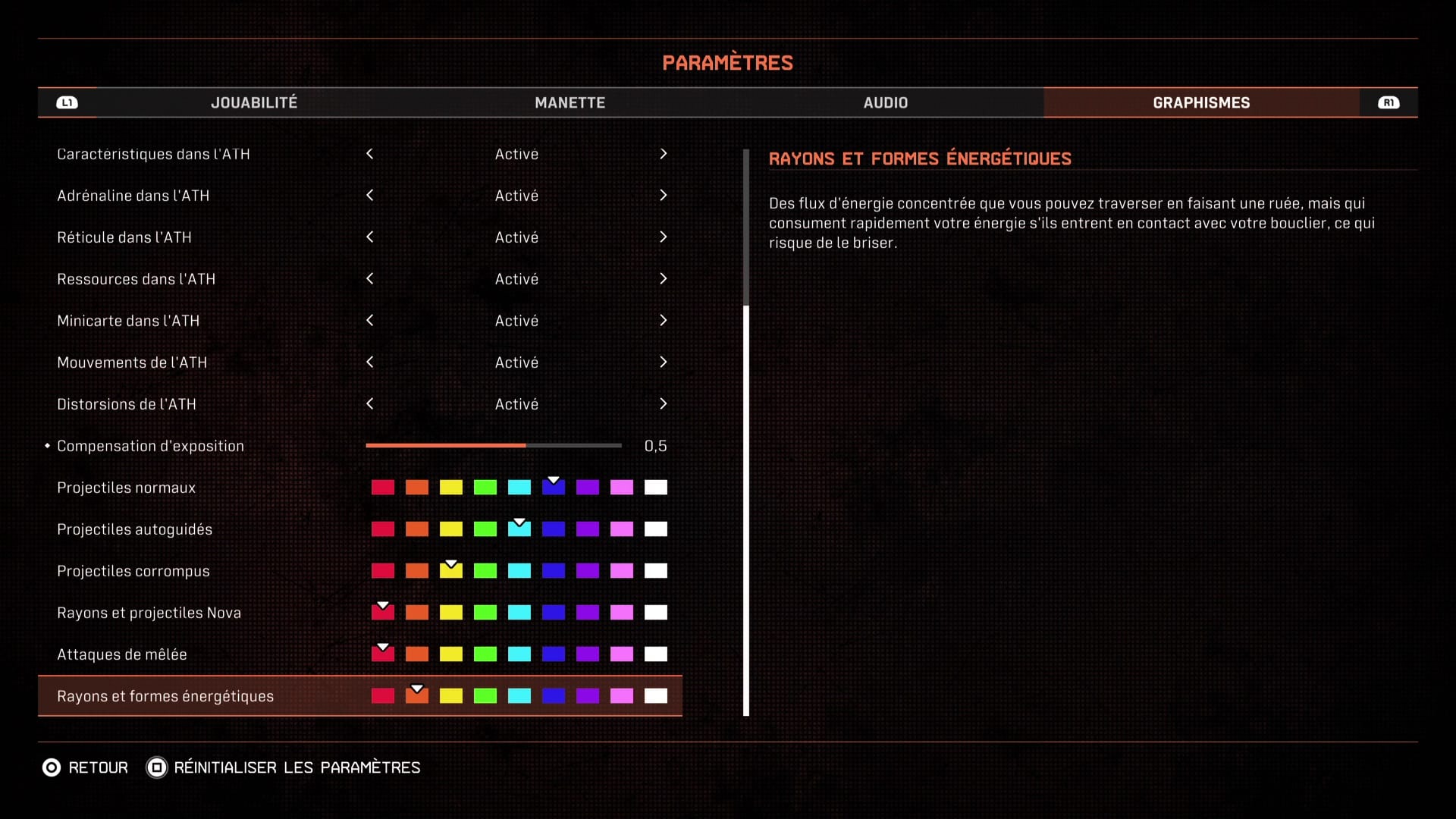 Un soin qui fait écho à celui accordé au son. Le jeu nous conseille de jouer avec un casque compatible son 3D. Configuration préférentielle, il est vrai, afin d’être hyper réactif face aux menaces souvent dans notre dos ou hors champ. Une palanquée de paramètres comme rarement vu sont aussi là pour ajuster avec précision le rendu sonore. Cette accessibilité s’étend à d’autres aspects, notamment visuels, en mentionnant par exemple cette option étonnante et tout à fait appréciable de modifier la couleur des différents types de projectile pour mieux les distinguer si la configuration de base ne vous convient pas.