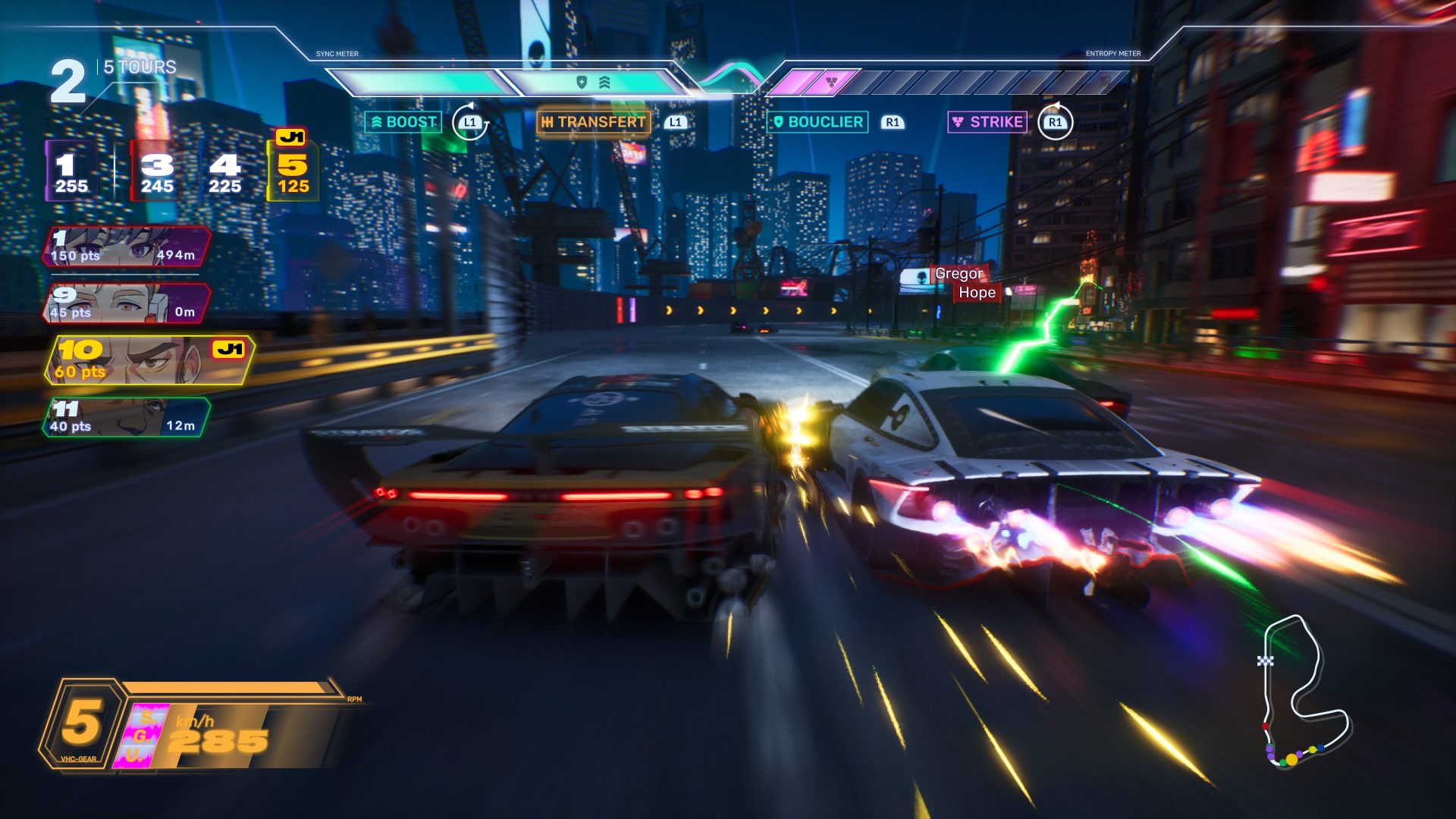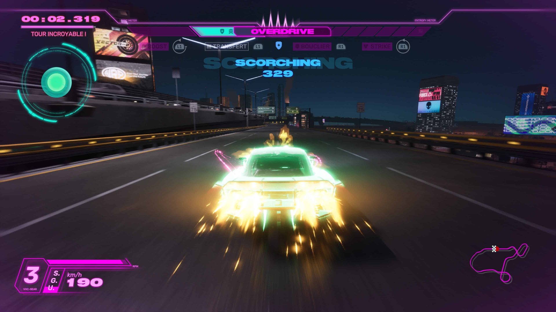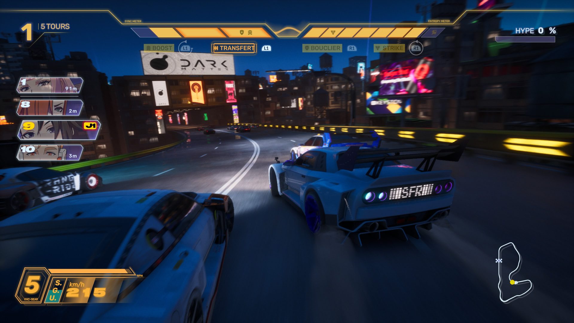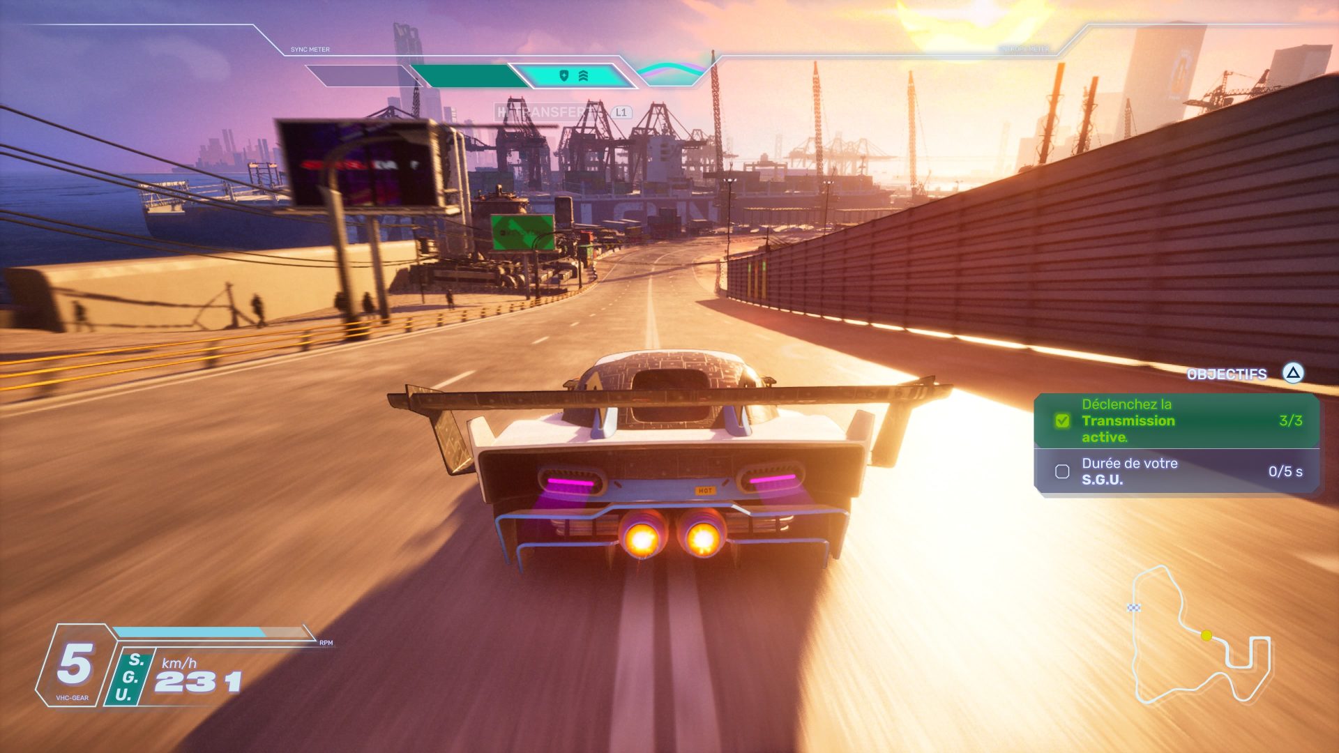 Toute la partie artistique demeure cohérente, en plus de garantir de la personnalité au soft. Pour autant, c’est bien le parti pris du game design qui rend l’expérience unique. En effet, comme le précisent les développeurs à maintes reprises en interview, ce nouveau Screamer puise son inspiration dans les jeux de combats : The King of Fighters et Tekken, pour ne citer qu’eux. Outre la dimension course arcade, en opposition à la simulation pure, le jeu mise sur des mécaniques d’affrontement et une gestion de ressources. Si la ressource principale se nomme Echo, cette dernière se divise en réalité en deux branches distinctes : La Sync et l’Entropie. La Sync est la jauge principale qui augmente automatiquement en roulant et en exécutant des drifts.
